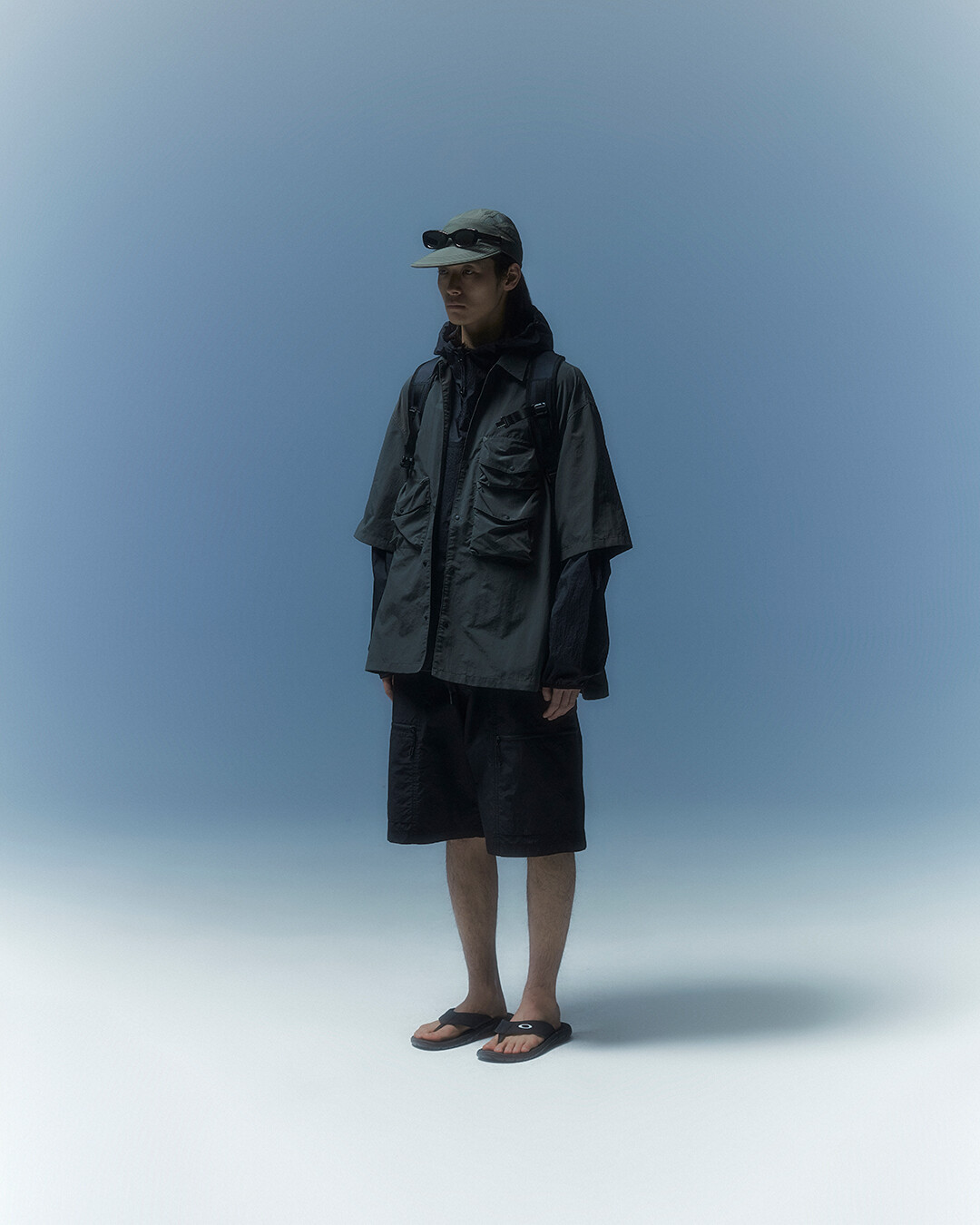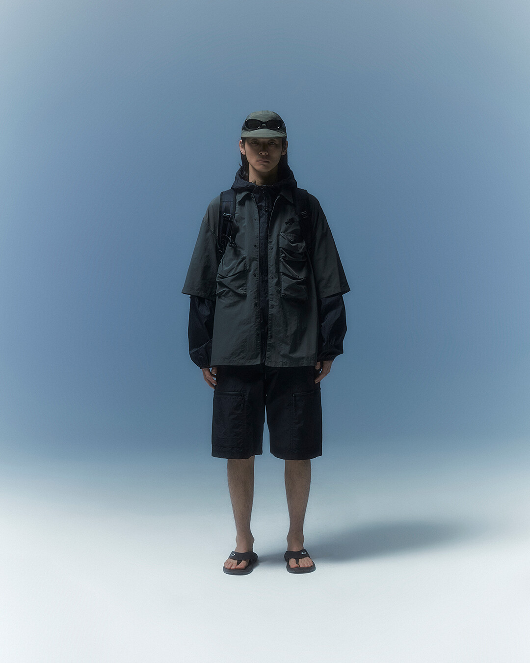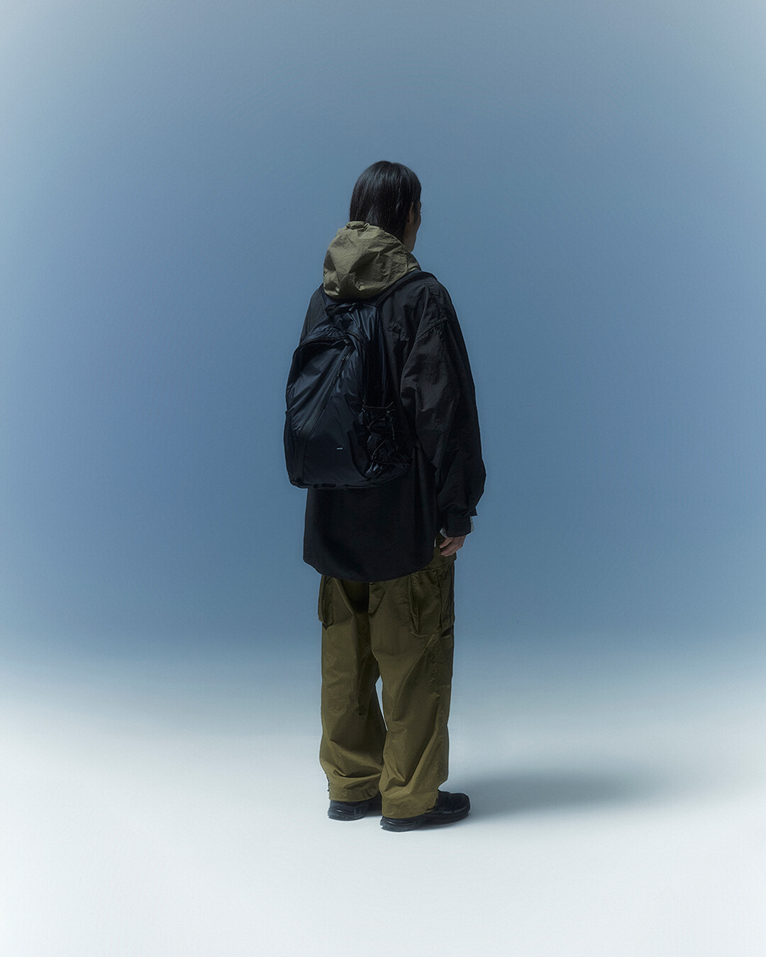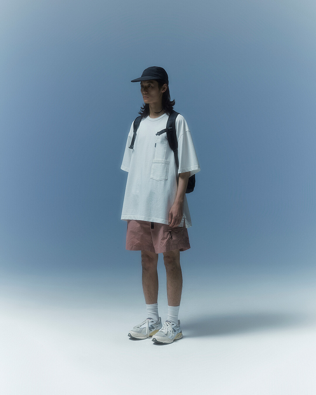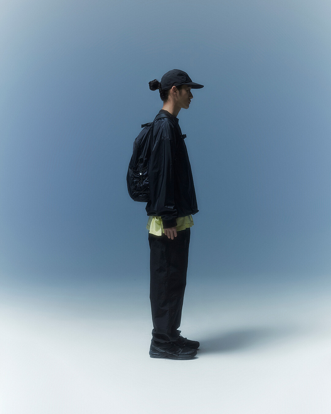 전면부에는 사선으로 큰 포켓이 들어가 있는데 코팅된 지퍼를 외부로 모두 들어내 기능적인 특징을 더욱 강조했으며 해당 지퍼를 열면 내부에 있는 메쉬 포켓을 추가로 확인할 수 있습니다. 또한 양측면에 있는 입체 플리츠를 통해 포켓의 여유 공간을 확보하면서 측면에서 봤을 때 유려한 실루엣을 더욱 도드라지게 만들어 줍니다. 사이드 포켓에서 바닥면으로 이어지는 스트링은 사이드 포켓의 물건을 고정할 뿐 아니라 전체적인 가방 실루엣의 변주를 줄 수 있으며, 산행이나 트래킹 환경에서 잠시 벗어두는 가벼운 아우터를 걸어둘 수 있습니다. 등과 맞닿는 후면에는 하단에 추가적으로 포켓을 배치하여 카드 지갑과 같은 작은 소지품을 보관할 수 있습니다. 백팩의 숄더 스트랩 안쪽에는 에어 메쉬와 부직포를 보강하였고, 체스트 스트랩에는 마그네틱 버클과 E-밴드를 결합한 웨빙을 통해 몸에 밀착시켜서 여러 상황에서도 편안한 착용감을 느낄 수 있습니다. 평판이나 철 프레임 구조, EVA 등의 비교적 단단한 하드웨어나 보강재가 들어간 제품은 아니며 경량화와 무게 대비 좋은 내구성과 발수력에 초점을 맞춘 제품입니다. 다소 가벼운 일상 소지품이나 등산 및 트래킹 용품 수납에 적합합니다.