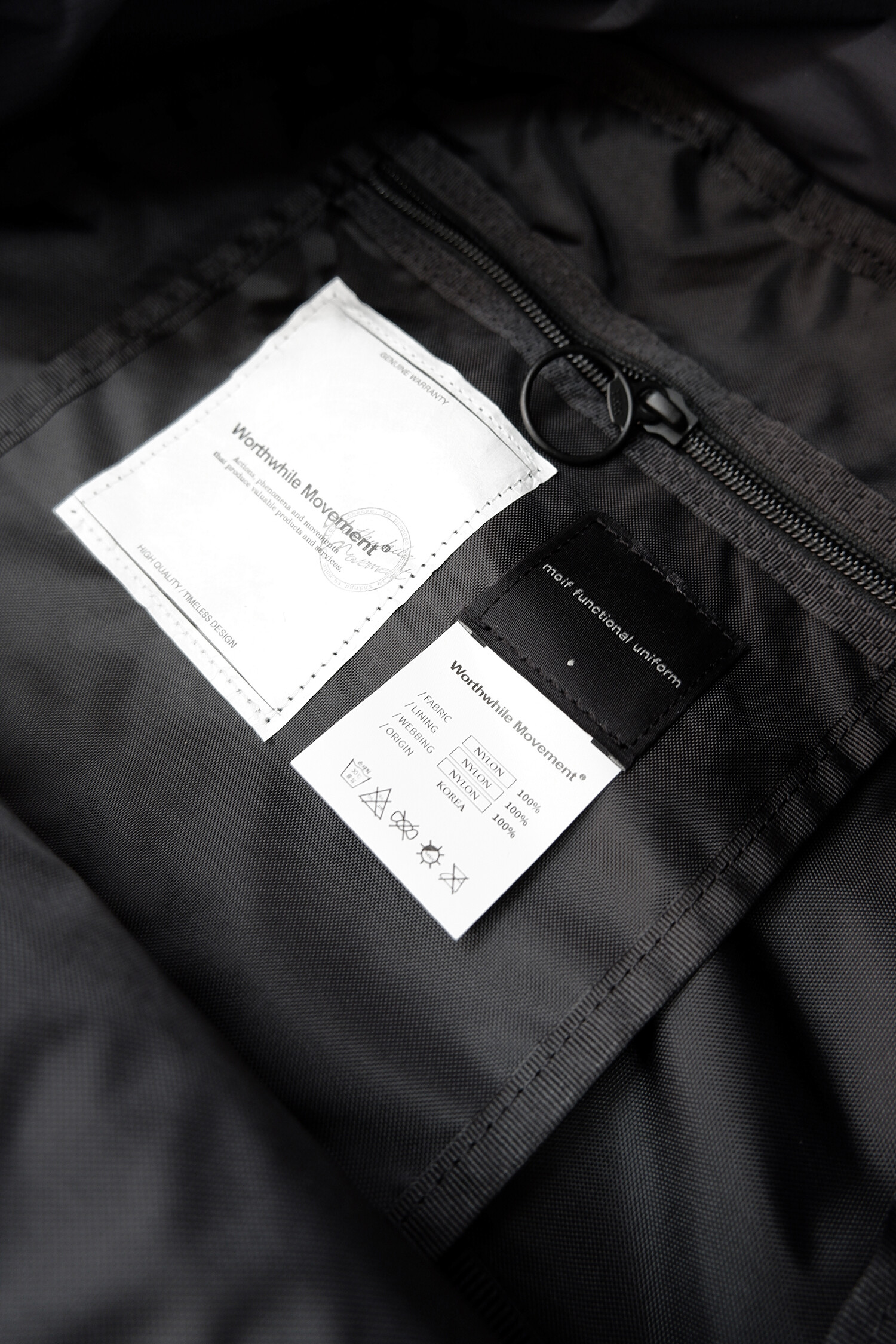 '트레일 백팩'은 브랜드 모이프(moif functional uniform®)와의 협업 제품으로 아웃도어 및 타운 모두에서 활용 가능한 올 라운드형 경량 백팩입니다. 기본적인 내구성과 기능을 위해 필수적인 등판과 바닥 면을 제외하고 다른 곳에는 의도적으로 안감이나 보강재를 뺀 홑겹의 원단으로만 제작했습니다. 이를 통해 가볍고 유연하며 자연스럽게 흘러내리는 듯한 실루엣이 특징입니다. '트레일 백팩'에는 PERTEX® 사의 미세 다공성 코팅된 Quantum Pro 나일론(Ripstop) 패브릭을 사용하여 높은 수준의 발수력과 내수성을 확인할 수 있습니다. 또한 해당 원단은 '40*gsm'으로 가볍고 내구성이 좋아 다양한 환경에서 사용하기 적합합니다. 내부 안감 또한 발수 코팅된 나일론 원단을 사용했으며, 3m 재귀 반사 E-스트링과 고밀도의 나일론 능직 웨빙을 사용하여 완성도를 높였습니다. 가방에 특화된 RC체인 지퍼와 슬라이더 그리고 세계적인 플라스틱 파츠 브랜드인 우진 플라스틱과 니프코의 파츠들이 조화롭게 적용되어 좋은 기능과 심미적으로 디테일한 부분까지 신경 쓴 제품입니다.
