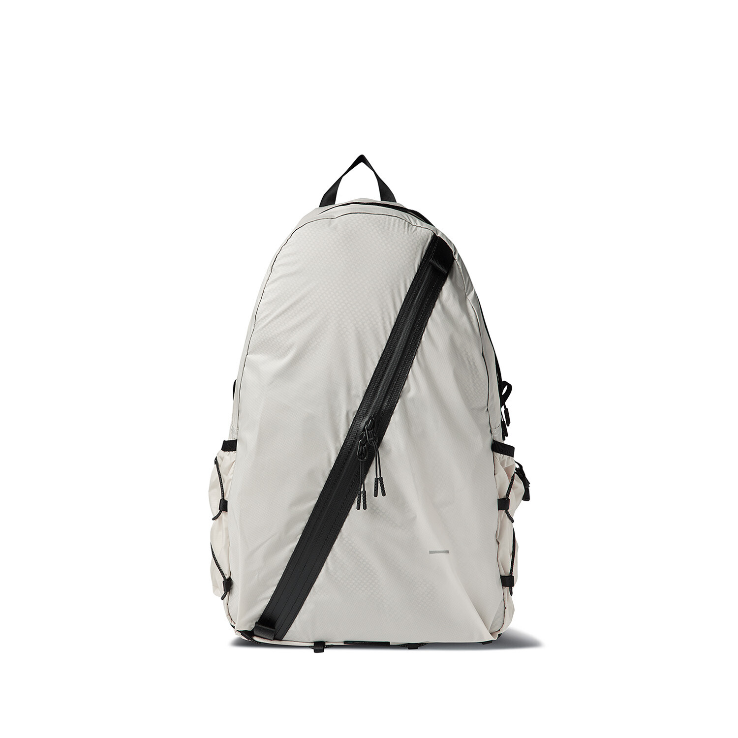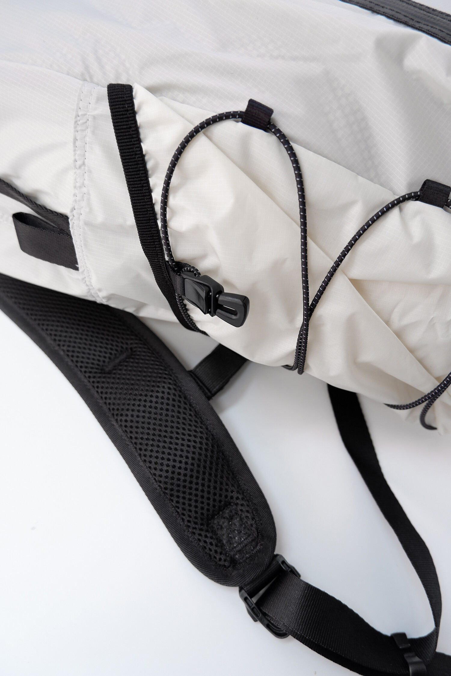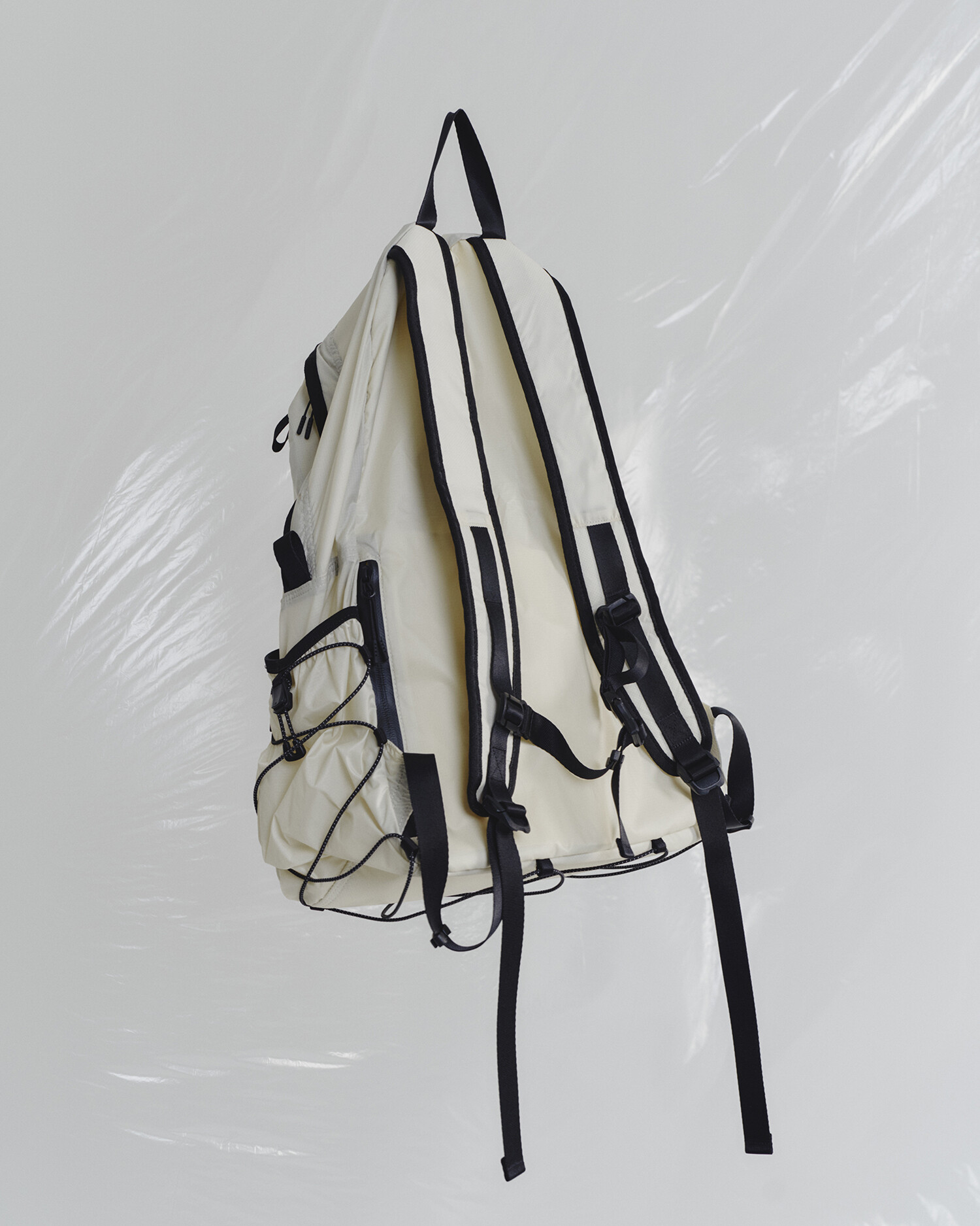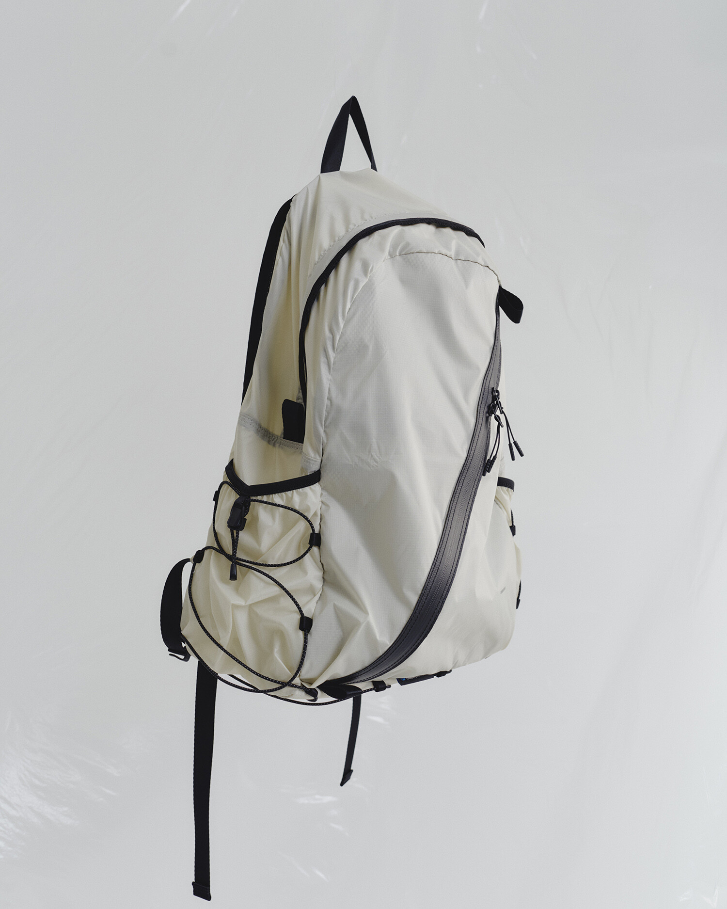 전면부에는 사선으로 큰 포켓이 들어가 있는데 코팅된 지퍼를 외부로 모두 들어내 기능적인 특징을 더욱 강조했으며 해당 지퍼를 열면 내부에 있는 메쉬 포켓을 추가로 확인할 수 있습니다. 또한 양측면에 있는 입체 플리츠를 통해 포켓의 여유 공간을 확보하면서 측면에서 봤을 때 유려한 실루엣을 더욱 도드라지게 만들어 줍니다. 사이드 포켓에서 바닥면으로 이어지는 스트링은 사이드 포켓의 물건을 고정할 뿐 아니라 전체적인 가방 실루엣의 변주를 줄 수 있으며, 산행이나 트래킹 환경에서 잠시 벗어두는 가벼운 아우터를 걸어둘 수 있습니다. 등과 맞닿는 후면에는 하단에 추가적으로 포켓을 배치하여 카드 지갑과 같은 작은 소지품을 보관할 수 있습니다. 백팩의 숄더 스트랩 안쪽에는 에어 메쉬와 부직포를 보강하였고, 체스트 스트랩에는 마그네틱 버클과 E-밴드를 결합한 웨빙을 통해 몸에 밀착시켜서 여러 상황에서도 편안한 착용감을 느낄 수 있습니다. 평판이나 철 프레임 구조, EVA 등의 비교적 단단한 하드웨어나 보강재가 들어간 제품은 아니며 경량화와 무게 대비 좋은 내구성과 발수력에 초점을 맞춘 제품입니다. 다소 가벼운 일상 소지품이나 등산 및 트래킹 용품 수납에 적합합니다.
