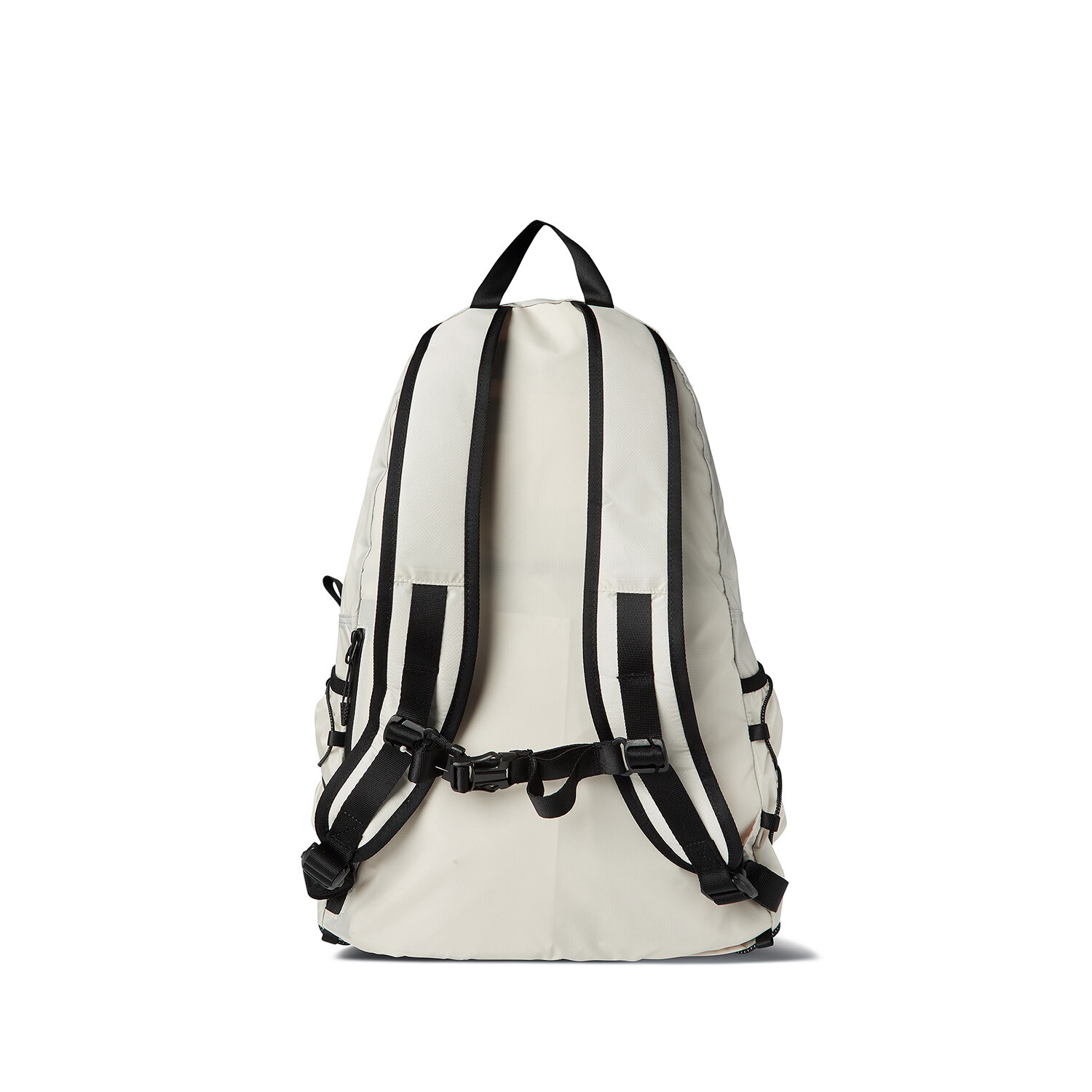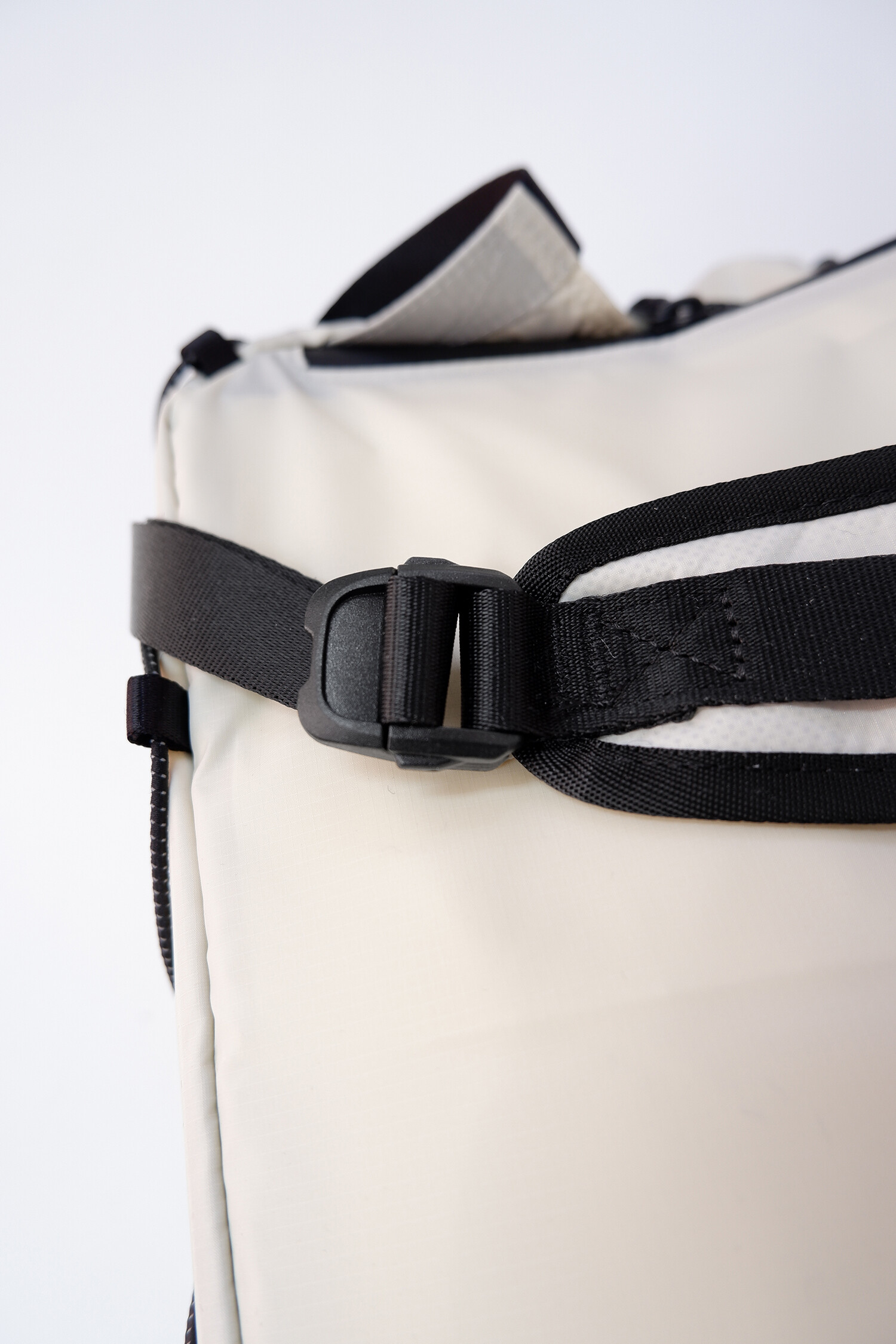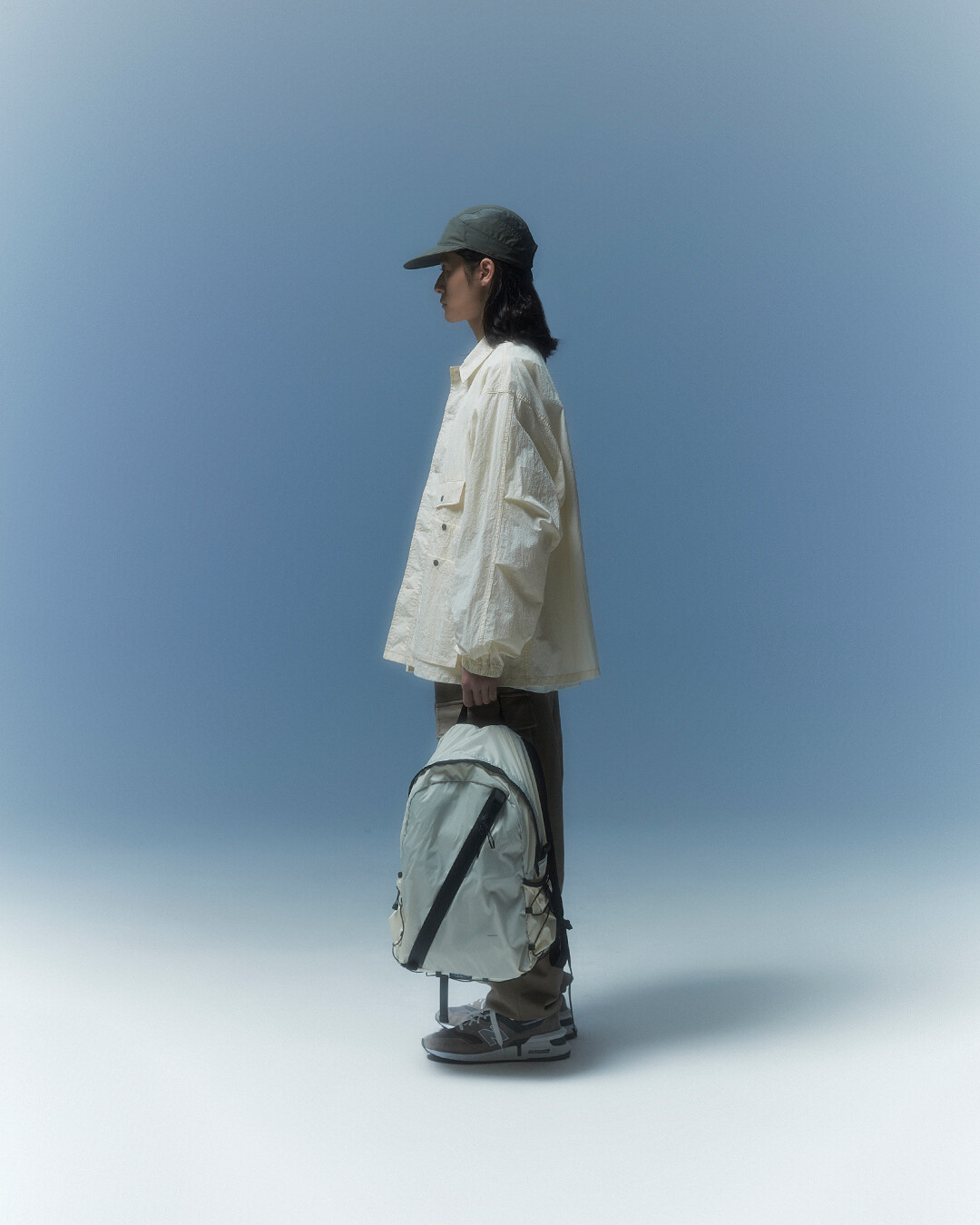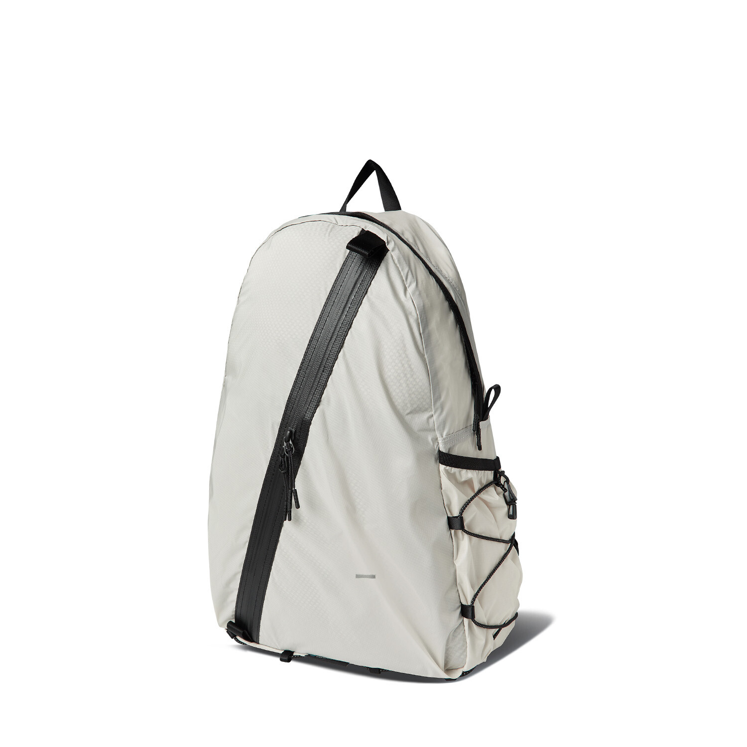 전면부에는 사선으로 큰 포켓이 들어가 있는데 코팅된 지퍼를 외부로 모두 들어내 기능적인 특징을 더욱 강조했으며 해당 지퍼를 열면 내부에 있는 메쉬 포켓을 추가로 확인할 수 있습니다. 또한 양측면에 있는 입체 플리츠를 통해 포켓의 여유 공간을 확보하면서 측면에서 봤을 때 유려한 실루엣을 더욱 도드라지게 만들어 줍니다. 사이드 포켓에서 바닥면으로 이어지는 스트링은 사이드 포켓의 물건을 고정할 뿐 아니라 전체적인 가방 실루엣의 변주를 줄 수 있으며, 산행이나 트래킹 환경에서 잠시 벗어두는 가벼운 아우터를 걸어둘 수 있습니다. 등과 맞닿는 후면에는 하단에 추가적으로 포켓을 배치하여 카드 지갑과 같은 작은 소지품을 보관할 수 있습니다. 백팩의 숄더 스트랩 안쪽에는 에어 메쉬와 부직포를 보강하였고, 체스트 스트랩에는 마그네틱 버클과 E-밴드를 결합한 웨빙을 통해 몸에 밀착시켜서 여러 상황에서도 편안한 착용감을 느낄 수 있습니다. 평판이나 철 프레임 구조, EVA 등의 비교적 단단한 하드웨어나 보강재가 들어간 제품은 아니며 경량화와 무게 대비 좋은 내구성과 발수력에 초점을 맞춘 제품입니다. 다소 가벼운 일상 소지품이나 등산 및 트래킹 용품 수납에 적합합니다.