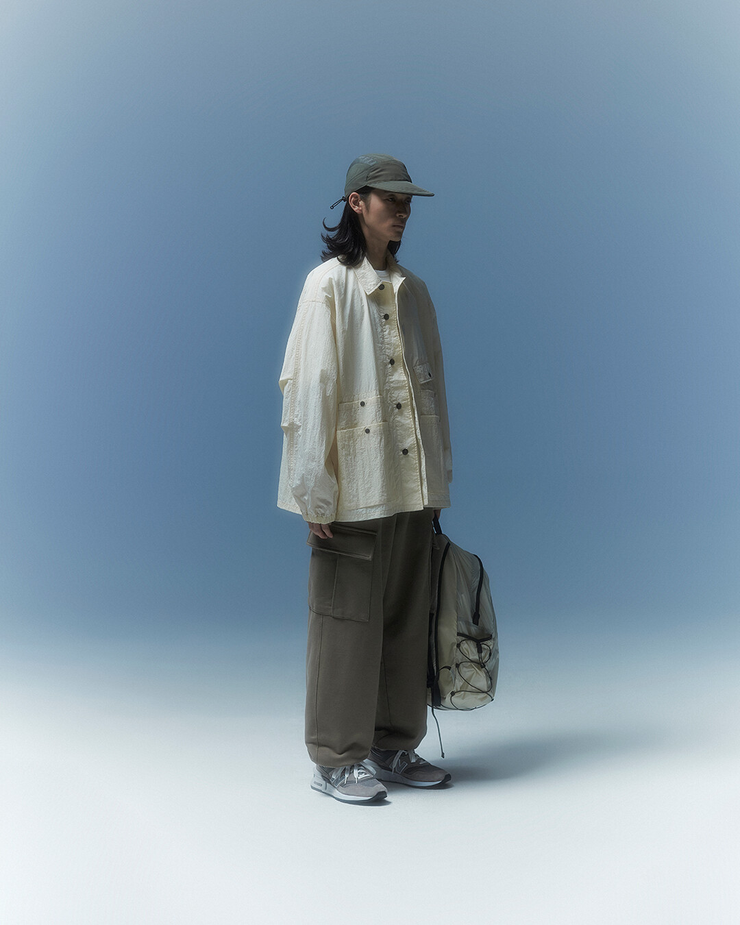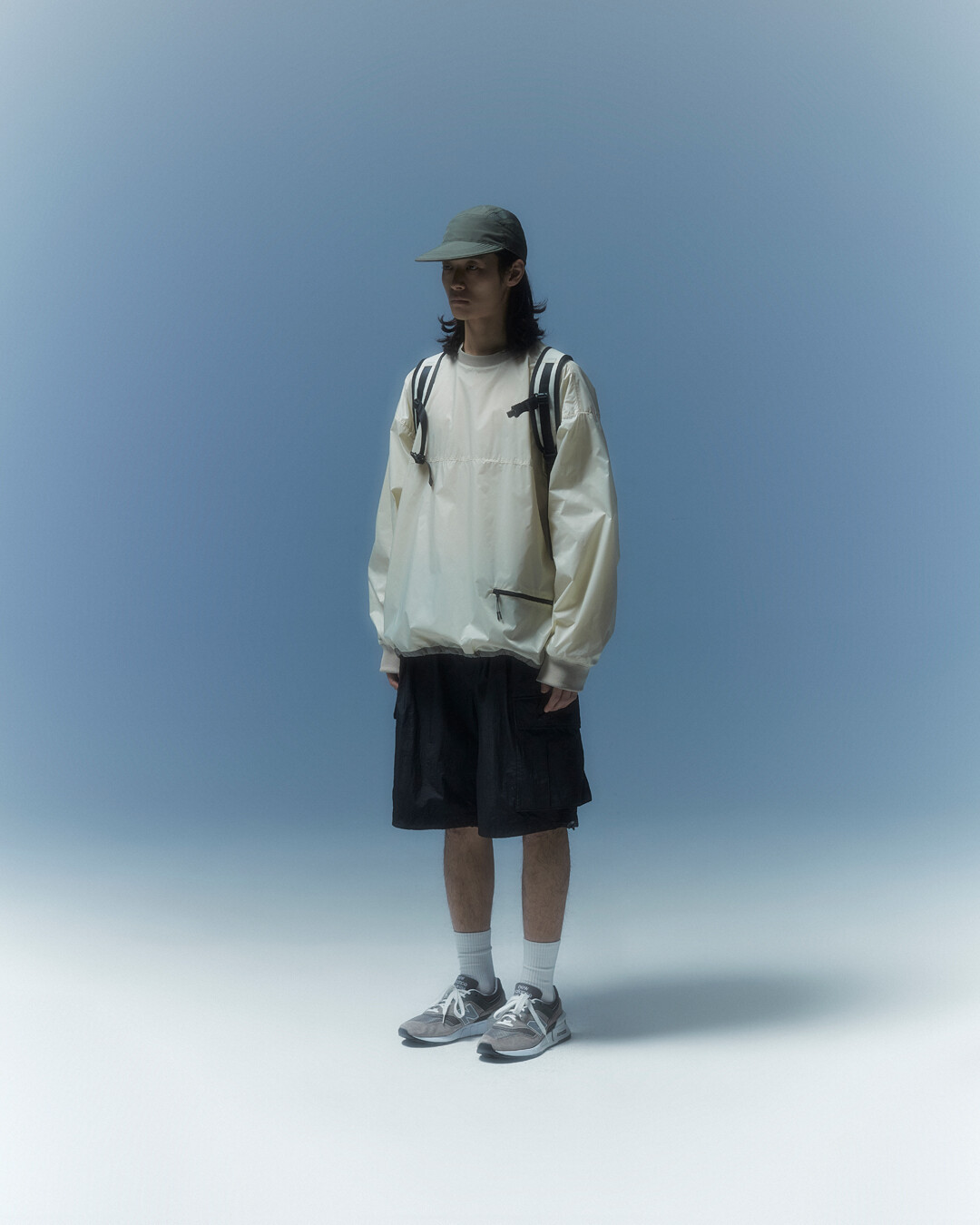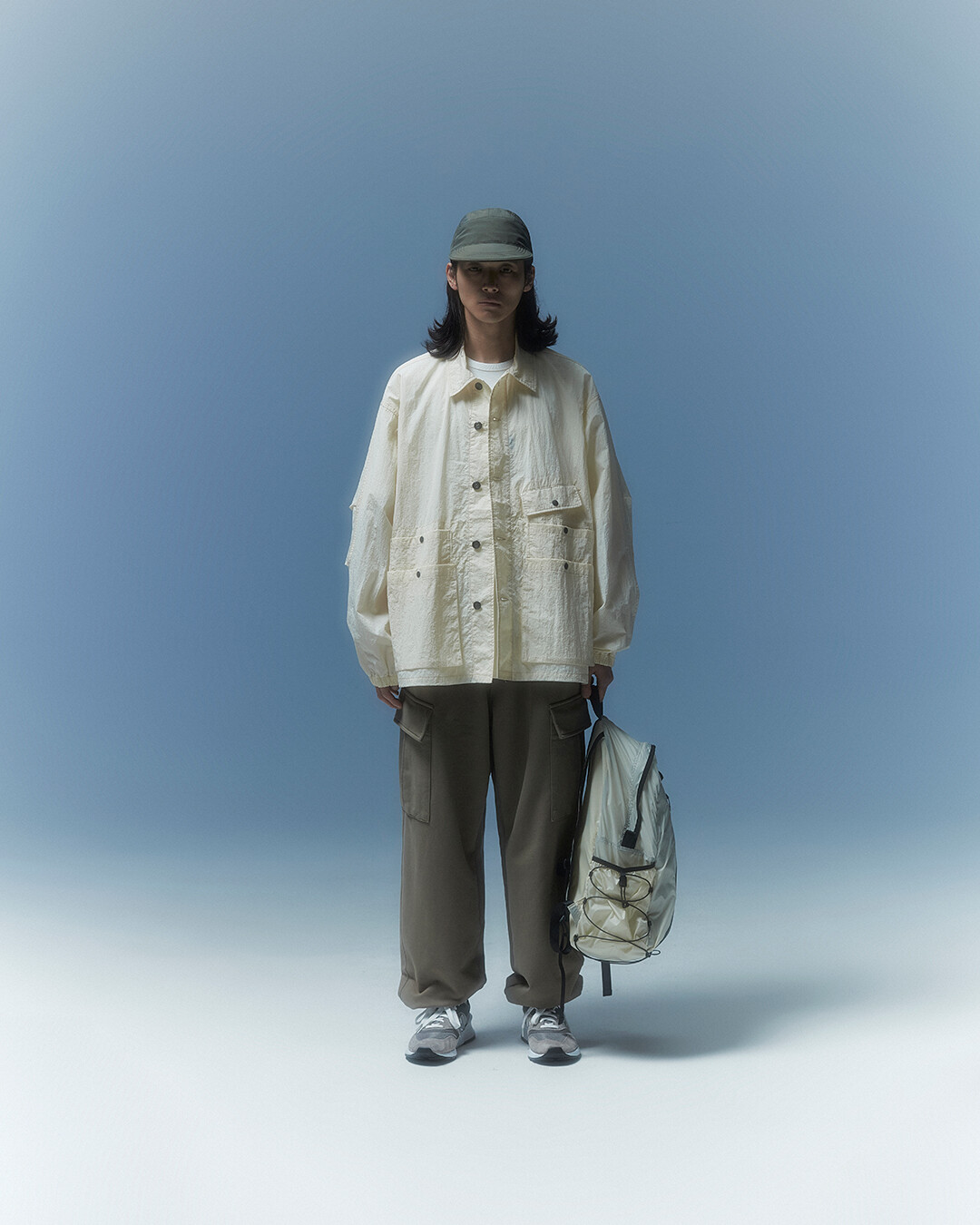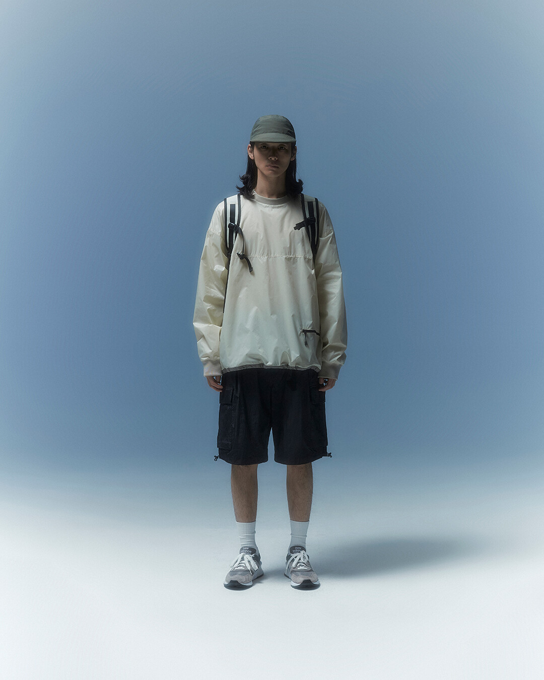 전면부에는 사선으로 큰 포켓이 들어가 있는데 코팅된 지퍼를 외부로 모두 들어내 기능적인 특징을 더욱 강조했으며 해당 지퍼를 열면 내부에 있는 메쉬 포켓을 추가로 확인할 수 있습니다. 또한 양측면에 있는 입체 플리츠를 통해 포켓의 여유 공간을 확보하면서 측면에서 봤을 때 유려한 실루엣을 더욱 도드라지게 만들어 줍니다. 사이드 포켓에서 바닥면으로 이어지는 스트링은 사이드 포켓의 물건을 고정할 뿐 아니라 전체적인 가방 실루엣의 변주를 줄 수 있으며, 산행이나 트래킹 환경에서 잠시 벗어두는 가벼운 아우터를 걸어둘 수 있습니다. 등과 맞닿는 후면에는 하단에 추가적으로 포켓을 배치하여 카드 지갑과 같은 작은 소지품을 보관할 수 있습니다. 백팩의 숄더 스트랩 안쪽에는 에어 메쉬와 부직포를 보강하였고, 체스트 스트랩에는 마그네틱 버클과 E-밴드를 결합한 웨빙을 통해 몸에 밀착시켜서 여러 상황에서도 편안한 착용감을 느낄 수 있습니다. 평판이나 철 프레임 구조, EVA 등의 비교적 단단한 하드웨어나 보강재가 들어간 제품은 아니며 경량화와 무게 대비 좋은 내구성과 발수력에 초점을 맞춘 제품입니다. 다소 가벼운 일상 소지품이나 등산 및 트래킹 용품 수납에 적합합니다.