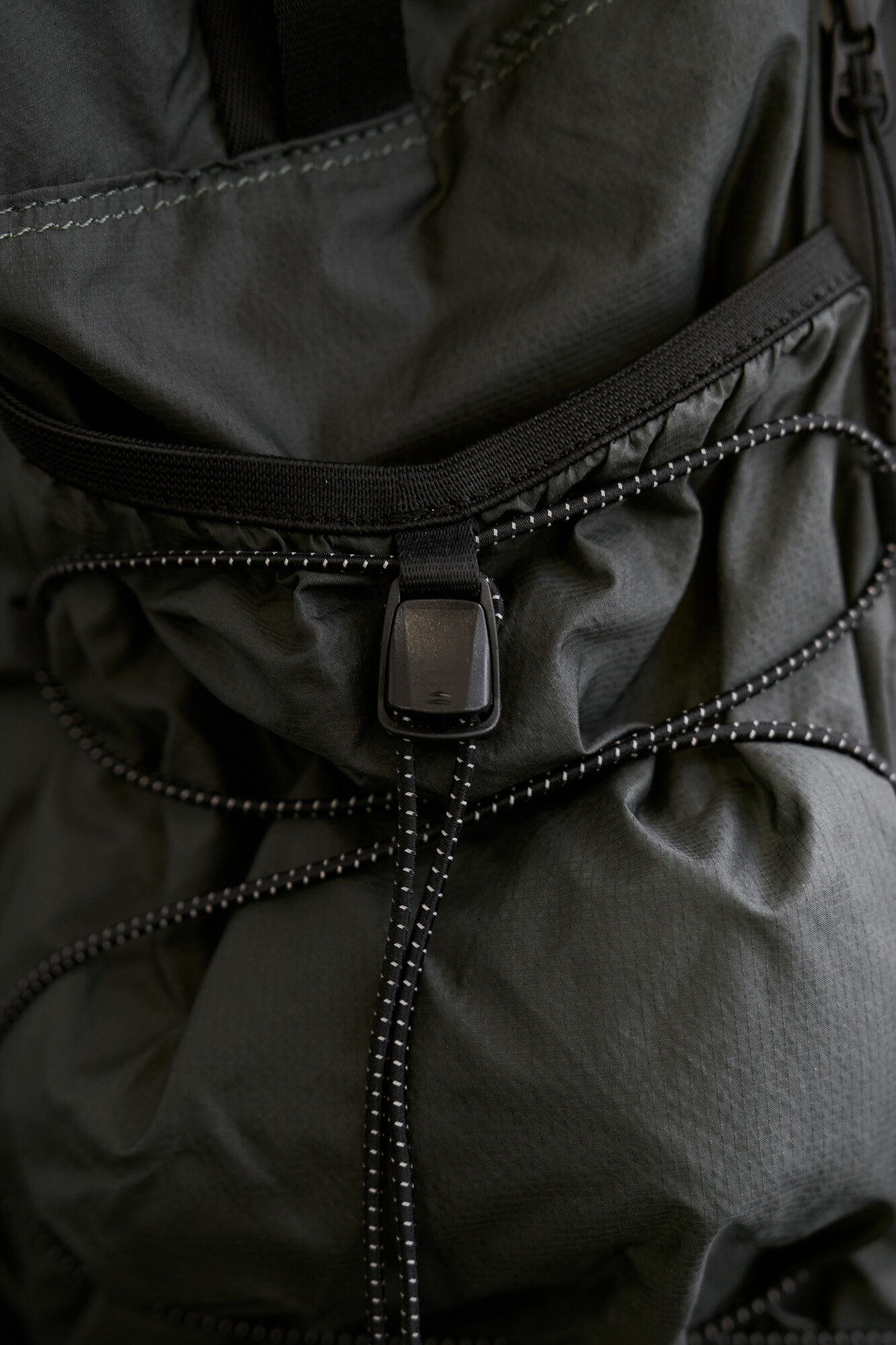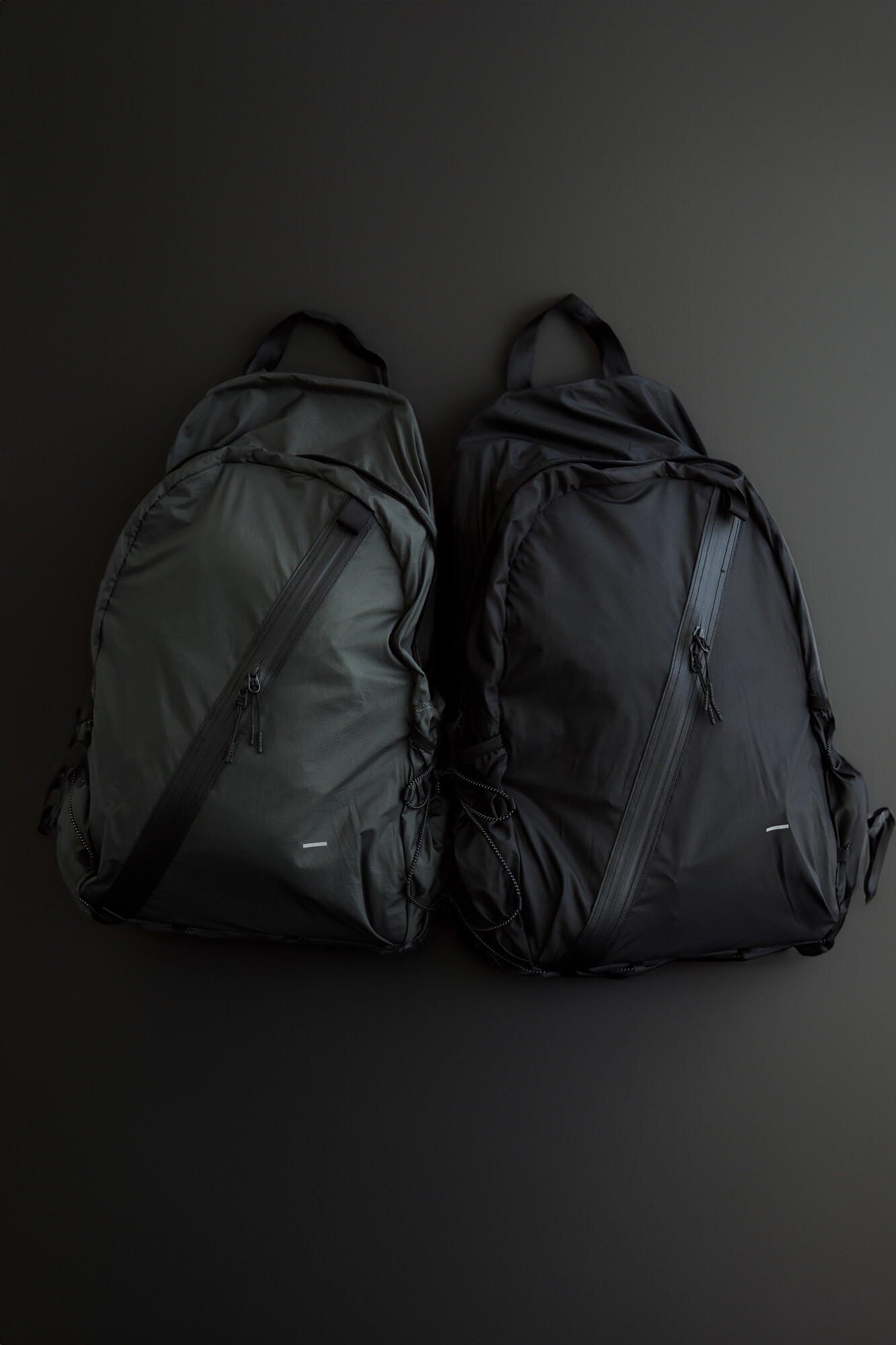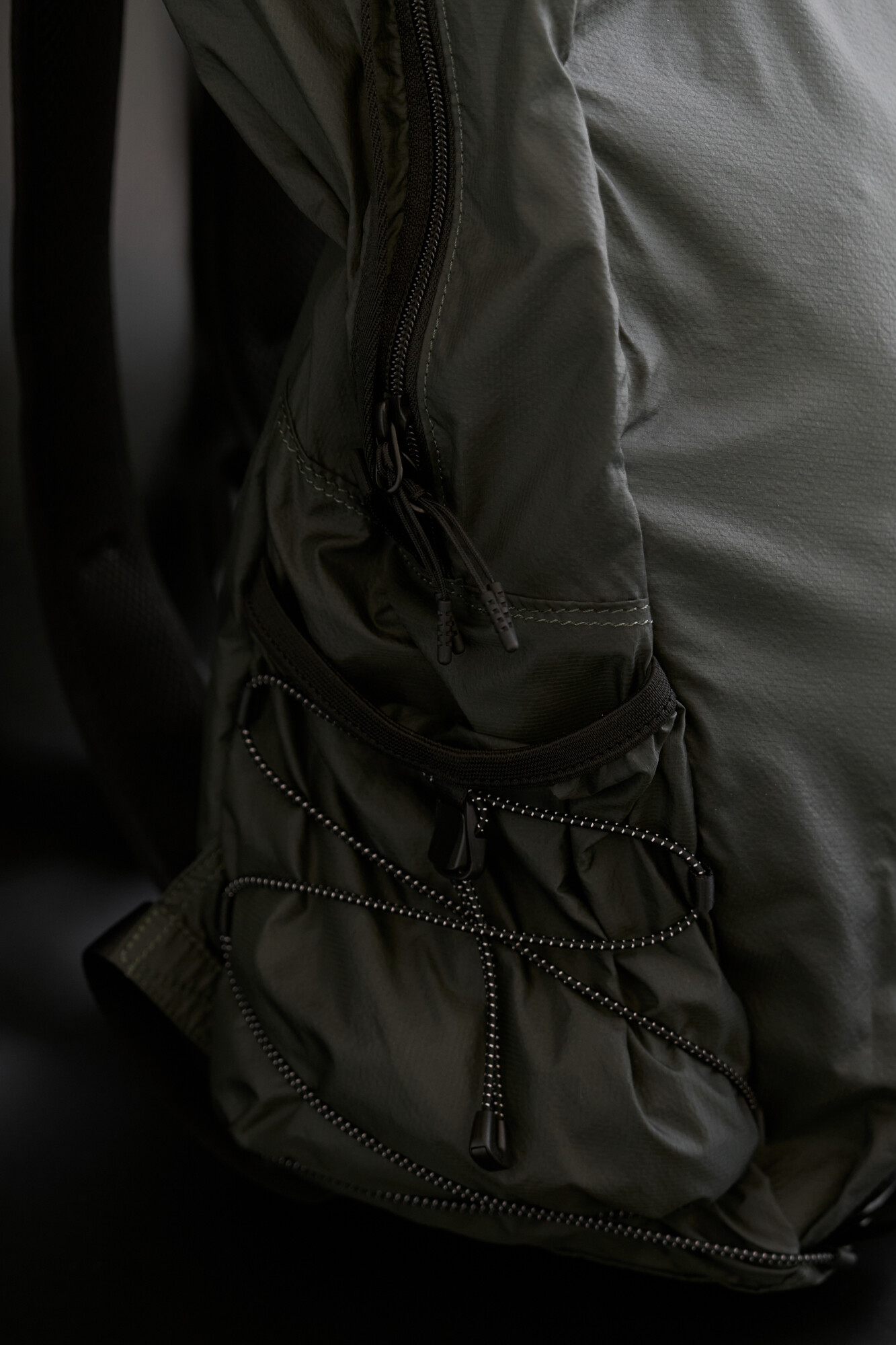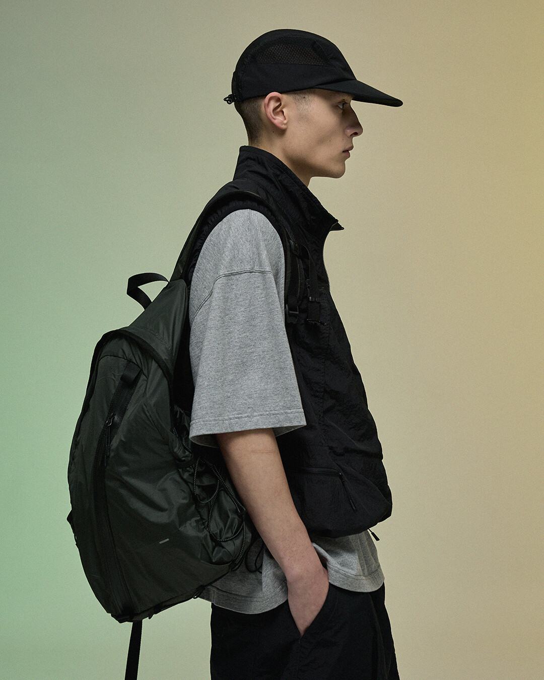 전면부에는 사선으로 큰 포켓이 들어가 있는데 코팅된 지퍼를 외부로 모두 들어내 기능적인 특징을 더욱 강조했으며 해당 지퍼를 열면 내부에 있는 메쉬 포켓을 추가로 확인할 수 있습니다. 또한 양측면에 있는 입체 플리츠를 통해 포켓의 여유 공간을 확보하면서 측면에서 봤을 때 유려한 실루엣을 더욱 도드라지게 만들어 줍니다. 사이드 포켓에서 바닥면으로 이어지는 스트링은 사이드 포켓의 물건을 고정할 뿐 아니라 전체적인 가방 실루엣의 변주를 줄 수 있으며, 산행이나 트래킹 환경에서 잠시 벗어두는 가벼운 아우터를 걸어둘 수 있습니다. 등과 맞닿는 후면에는 하단에 추가적으로 포켓을 배치하여 카드 지갑과 같은 작은 소지품을 보관할 수 있습니다. 백팩의 숄더 스트랩 안쪽에는 에어 메쉬와 부직포를 보강하였고, 체스트 스트랩에는 마그네틱 버클과 E-밴드를 결합한 웨빙을 통해 몸에 밀착시켜서 여러 상황에서도 편안한 착용감을 느낄 수 있습니다. 평판이나 철 프레임 구조, EVA 등의 비교적 단단한 하드웨어나 보강재가 들어간 제품은 아니며 경량화와 무게 대비 좋은 내구성과 발수력에 초점을 맞춘 제품입니다. 다소 가벼운 일상 소지품이나 등산 및 트래킹 용품 수납에 적합합니다.