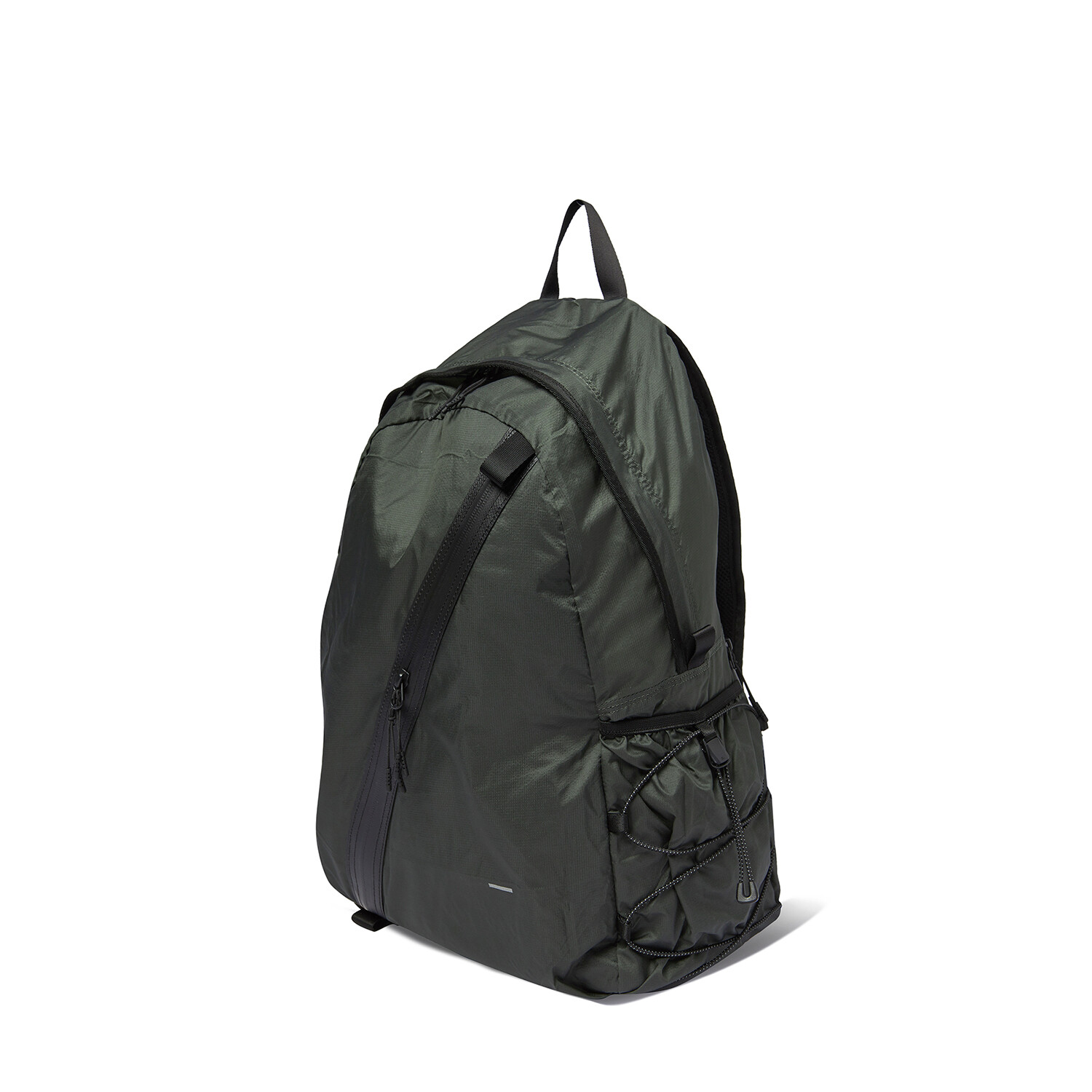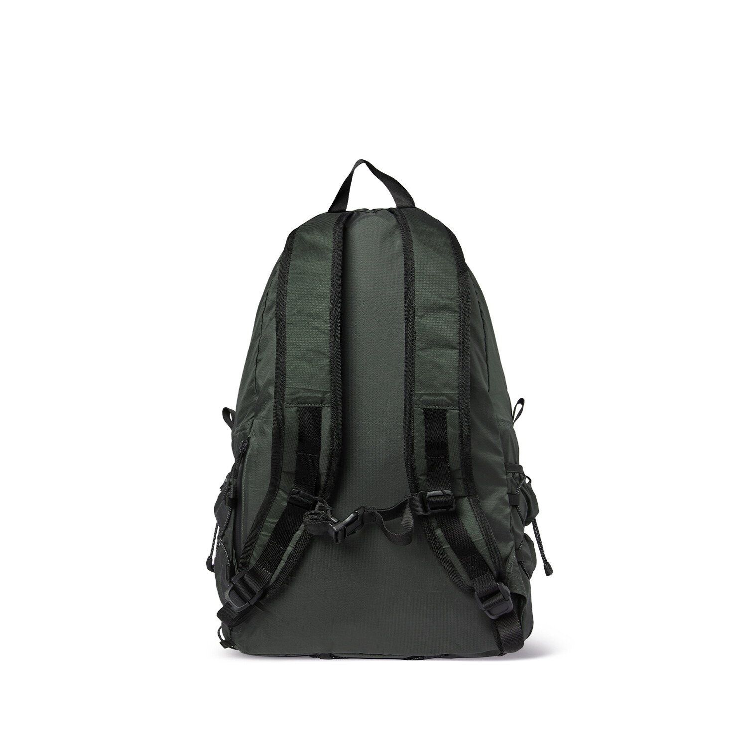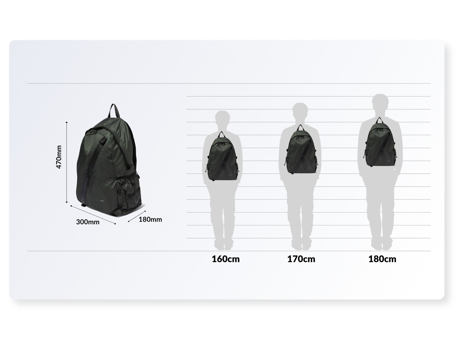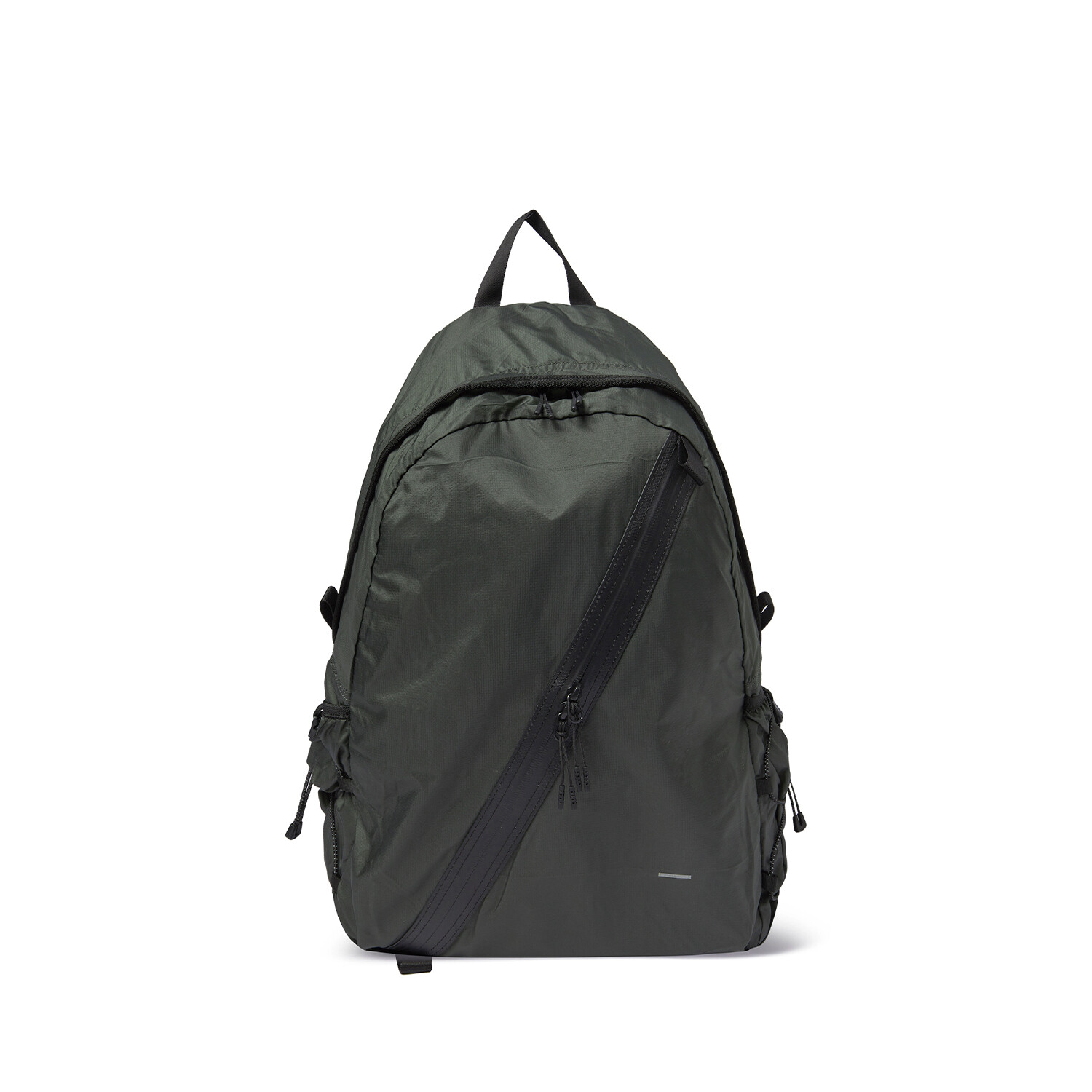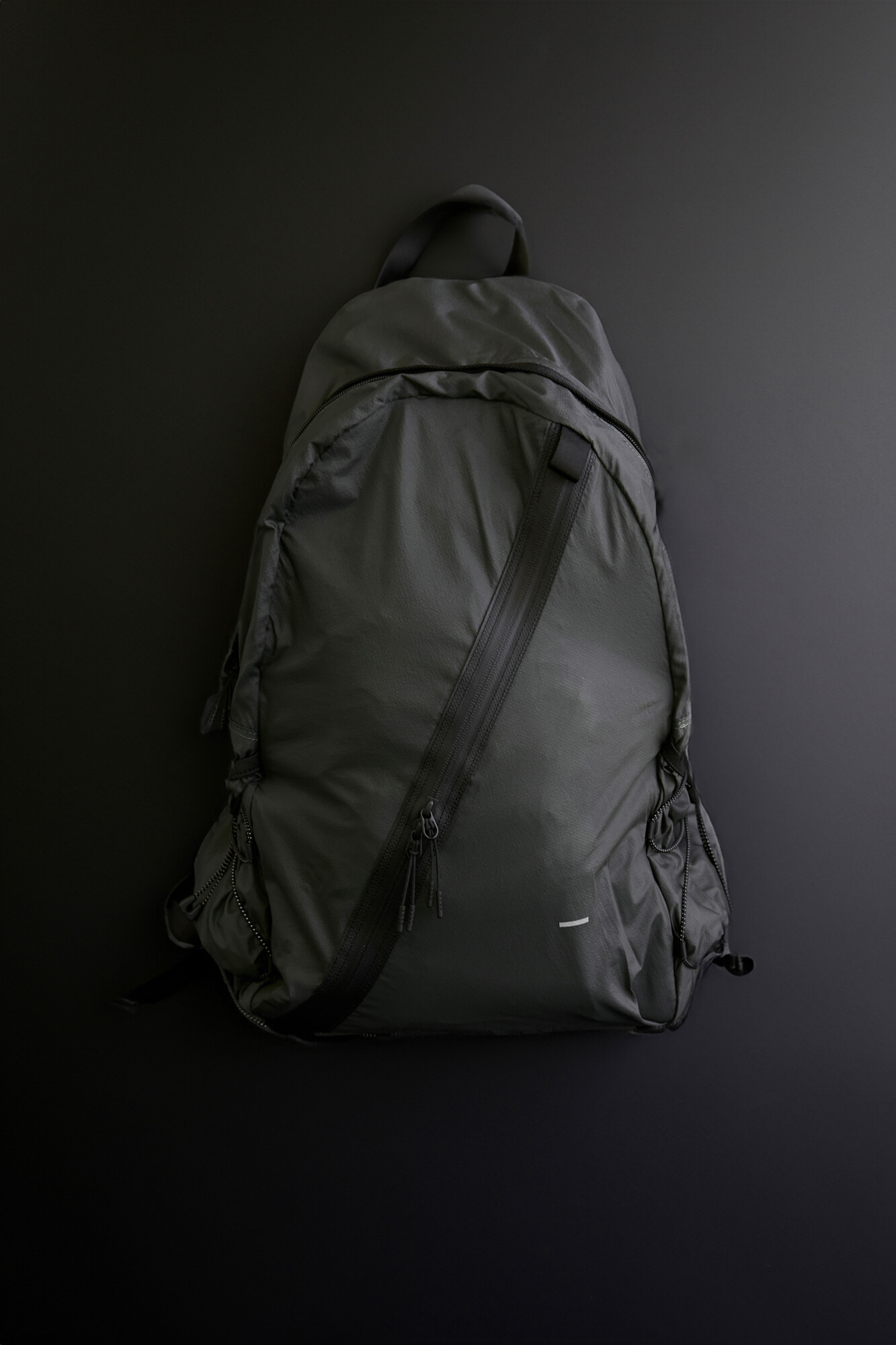 전면부에는 사선으로 큰 포켓이 들어가 있는데 코팅된 지퍼를 외부로 모두 들어내 기능적인 특징을 더욱 강조했으며 해당 지퍼를 열면 내부에 있는 메쉬 포켓을 추가로 확인할 수 있습니다. 또한 양측면에 있는 입체 플리츠를 통해 포켓의 여유 공간을 확보하면서 측면에서 봤을 때 유려한 실루엣을 더욱 도드라지게 만들어 줍니다. 사이드 포켓에서 바닥면으로 이어지는 스트링은 사이드 포켓의 물건을 고정할 뿐 아니라 전체적인 가방 실루엣의 변주를 줄 수 있으며, 산행이나 트래킹 환경에서 잠시 벗어두는 가벼운 아우터를 걸어둘 수 있습니다. 등과 맞닿는 후면에는 하단에 추가적으로 포켓을 배치하여 카드 지갑과 같은 작은 소지품을 보관할 수 있습니다. 백팩의 숄더 스트랩 안쪽에는 에어 메쉬와 부직포를 보강하였고, 체스트 스트랩에는 마그네틱 버클과 E-밴드를 결합한 웨빙을 통해 몸에 밀착시켜서 여러 상황에서도 편안한 착용감을 느낄 수 있습니다. 평판이나 철 프레임 구조, EVA 등의 비교적 단단한 하드웨어나 보강재가 들어간 제품은 아니며 경량화와 무게 대비 좋은 내구성과 발수력에 초점을 맞춘 제품입니다. 다소 가벼운 일상 소지품이나 등산 및 트래킹 용품 수납에 적합합니다.