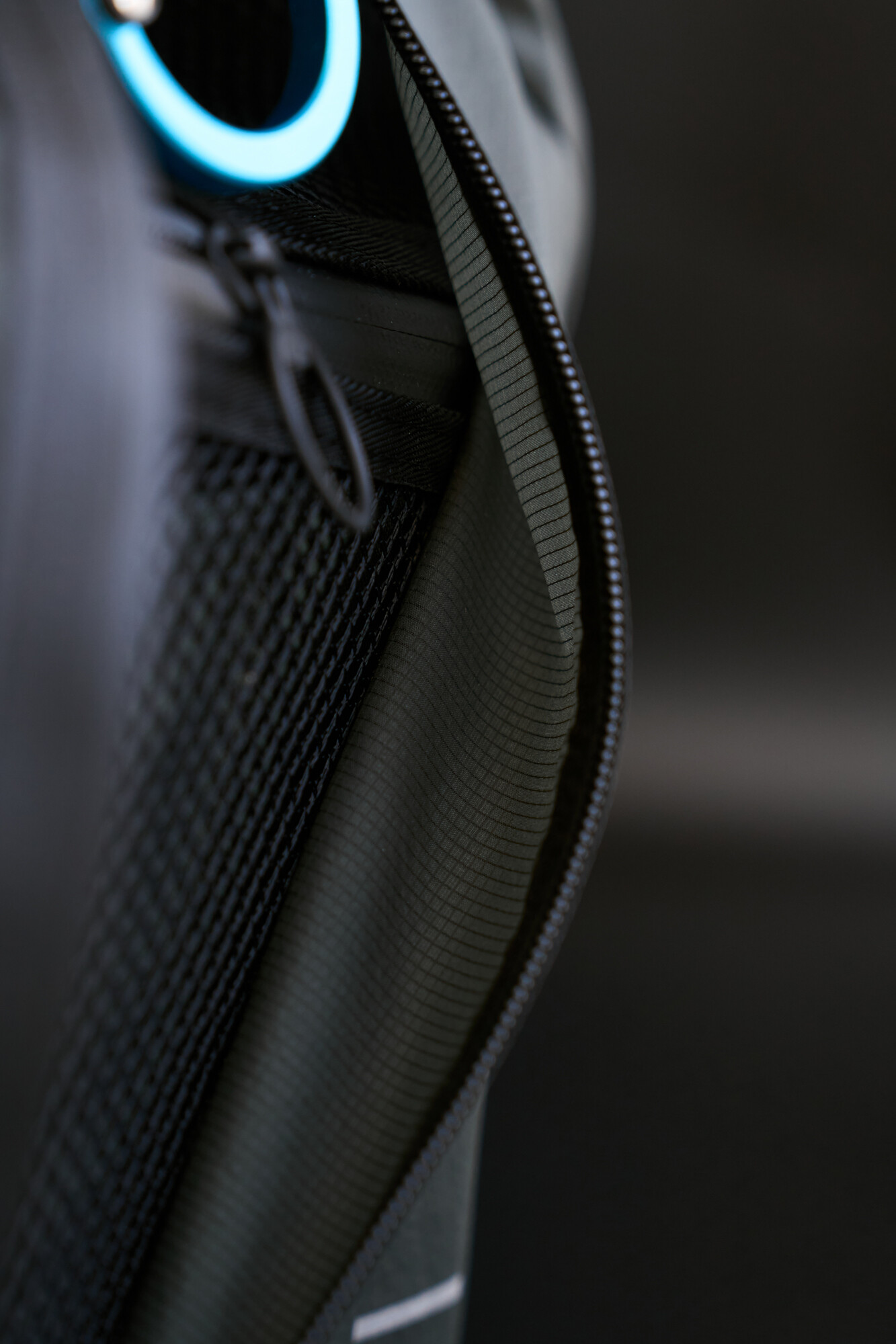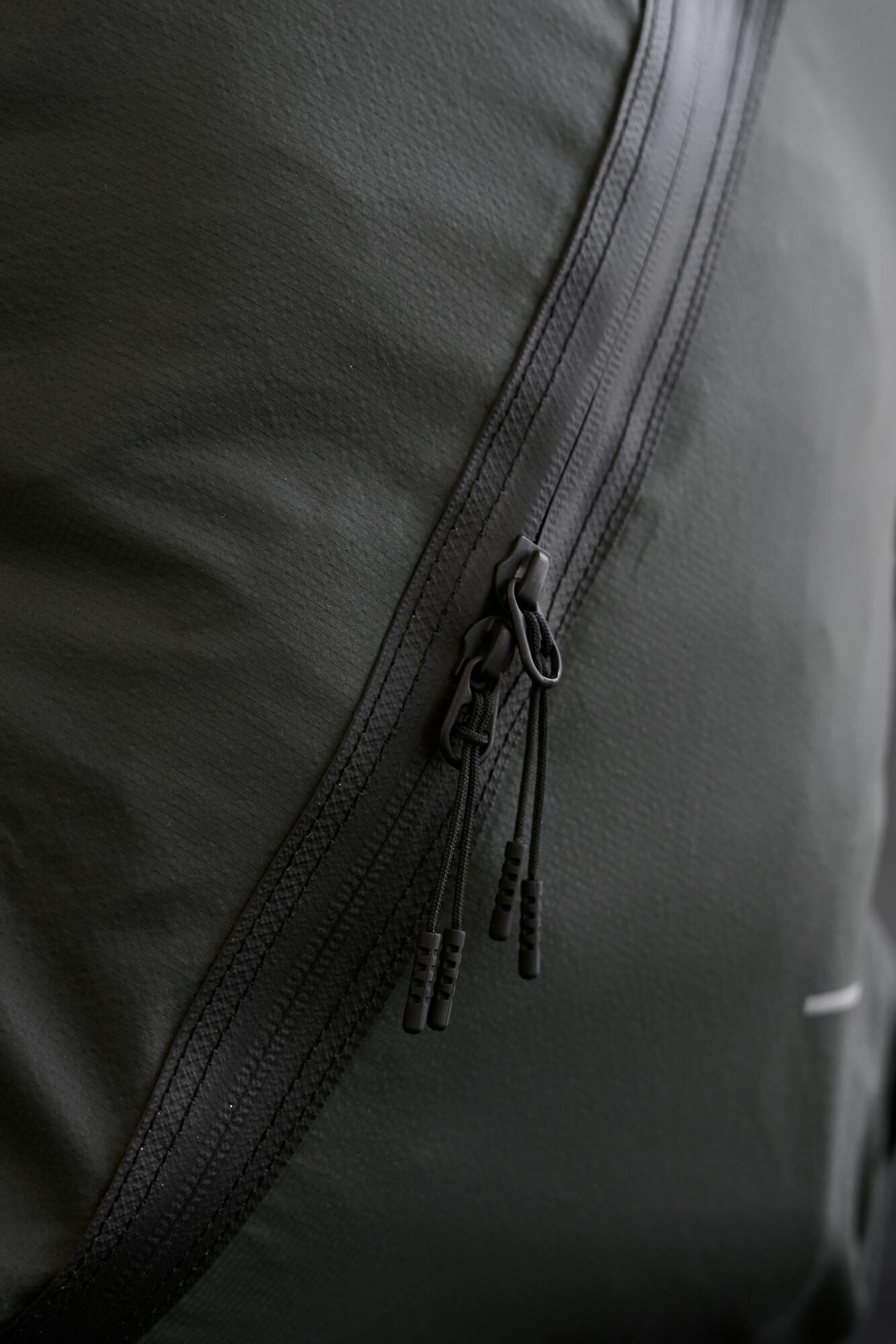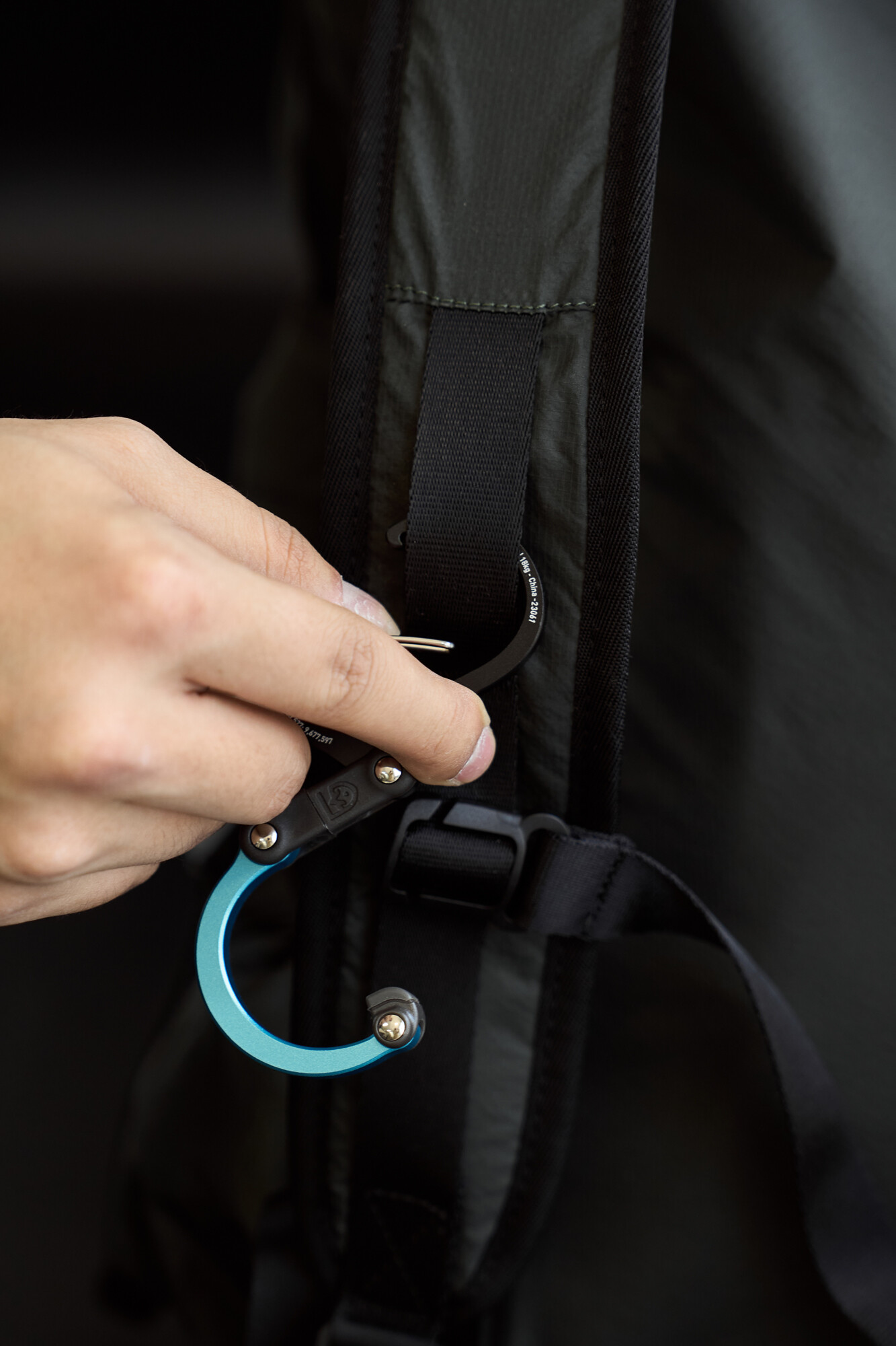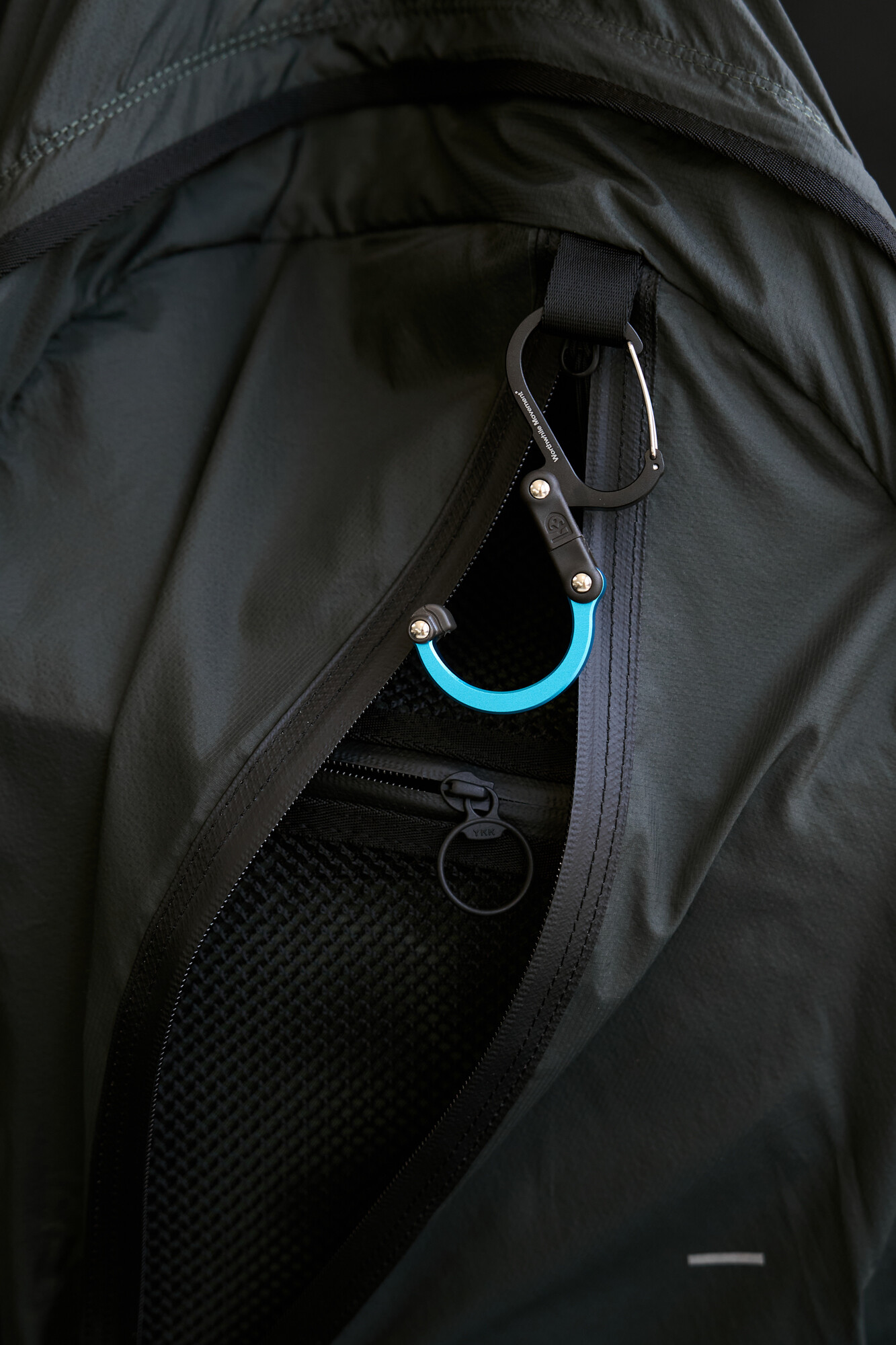 전면부에는 사선으로 큰 포켓이 들어가 있는데 코팅된 지퍼를 외부로 모두 들어내 기능적인 특징을 더욱 강조했으며 해당 지퍼를 열면 내부에 있는 메쉬 포켓을 추가로 확인할 수 있습니다. 또한 양측면에 있는 입체 플리츠를 통해 포켓의 여유 공간을 확보하면서 측면에서 봤을 때 유려한 실루엣을 더욱 도드라지게 만들어 줍니다. 사이드 포켓에서 바닥면으로 이어지는 스트링은 사이드 포켓의 물건을 고정할 뿐 아니라 전체적인 가방 실루엣의 변주를 줄 수 있으며, 산행이나 트래킹 환경에서 잠시 벗어두는 가벼운 아우터를 걸어둘 수 있습니다. 등과 맞닿는 후면에는 하단에 추가적으로 포켓을 배치하여 카드 지갑과 같은 작은 소지품을 보관할 수 있습니다. 백팩의 숄더 스트랩 안쪽에는 에어 메쉬와 부직포를 보강하였고, 체스트 스트랩에는 마그네틱 버클과 E-밴드를 결합한 웨빙을 통해 몸에 밀착시켜서 여러 상황에서도 편안한 착용감을 느낄 수 있습니다. 평판이나 철 프레임 구조, EVA 등의 비교적 단단한 하드웨어나 보강재가 들어간 제품은 아니며 경량화와 무게 대비 좋은 내구성과 발수력에 초점을 맞춘 제품입니다. 다소 가벼운 일상 소지품이나 등산 및 트래킹 용품 수납에 적합합니다.