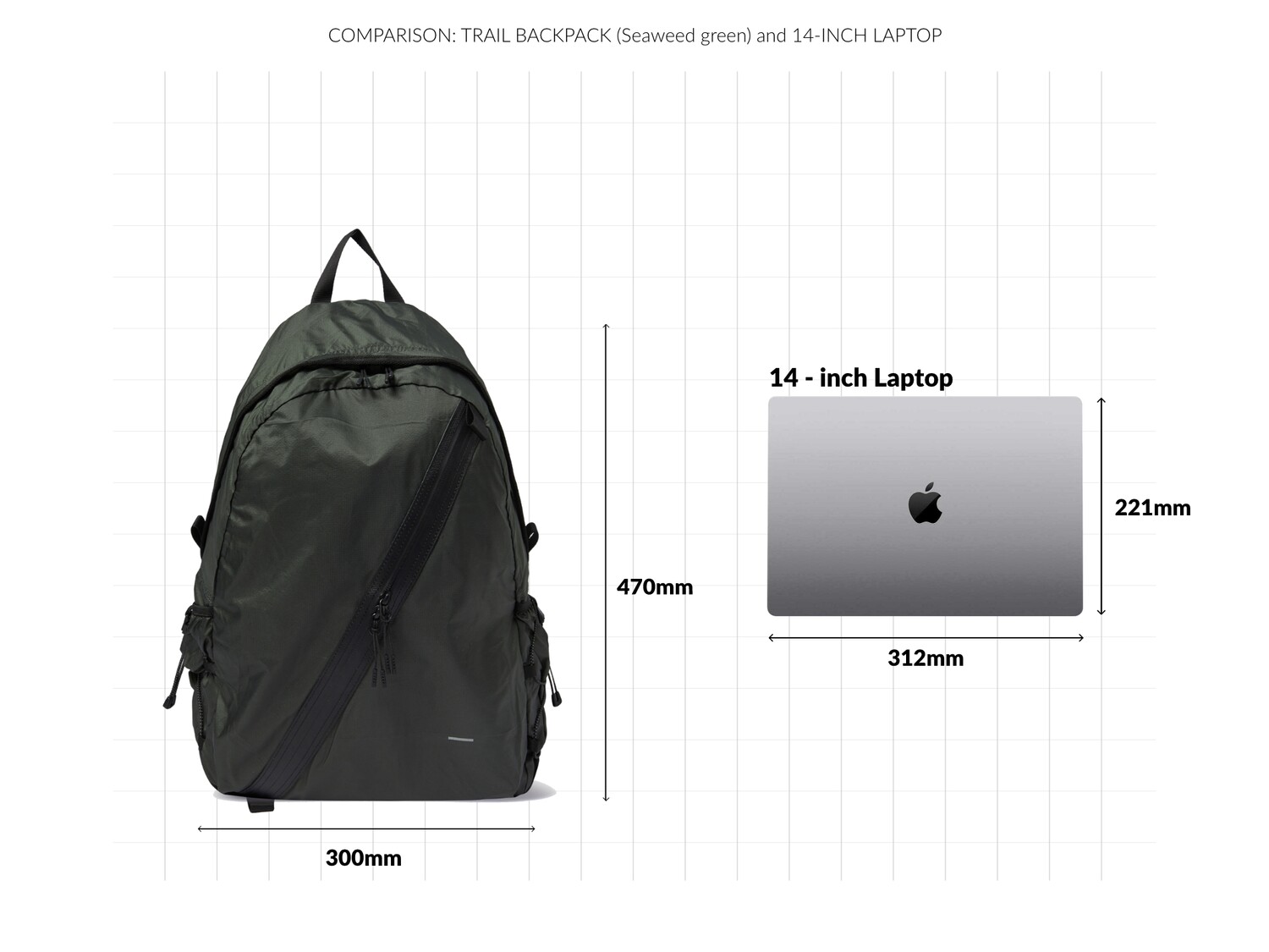 '트레일 백팩'은 브랜드 모이프(moif functional uniform®)와의 협업 제품으로 아웃도어 및 타운 모두에서 활용 가능한 올 라운드형 경량 백팩입니다. 기본적인 내구성과 기능을 위해 필수적인 등판과 바닥 면을 제외하고 다른 곳에는 의도적으로 안감이나 보강재를 뺀 홑겹의 원단으로만 제작했습니다. 이를 통해 가볍고 유연하며 자연스럽게 흘러내리는 듯한 실루엣이 특징입니다. '트레일 백팩'에는 가볍고 내구성이 좋은 나일론 립스탑 원단을 사용했고 발수력이 좋은 특징이 있습니다.. 내부 안감 또한 발수 코팅된 나일론 원단을 사용했으며, 3m 재귀 반사 E-스트링과 고밀도의 나일론 능직 웨빙을 사용하여 완성도를 높였습니다. 가방에 특화된 RC체인 지퍼와 슬라이더 그리고 세계적인 플라스틱 파츠 브랜드인 우진 플라스틱과 니프코의 파츠들이 조화롭게 적용되어 좋은 기능과 심미적으로 디테일한 부분까지 신경 쓴 제품입니다.