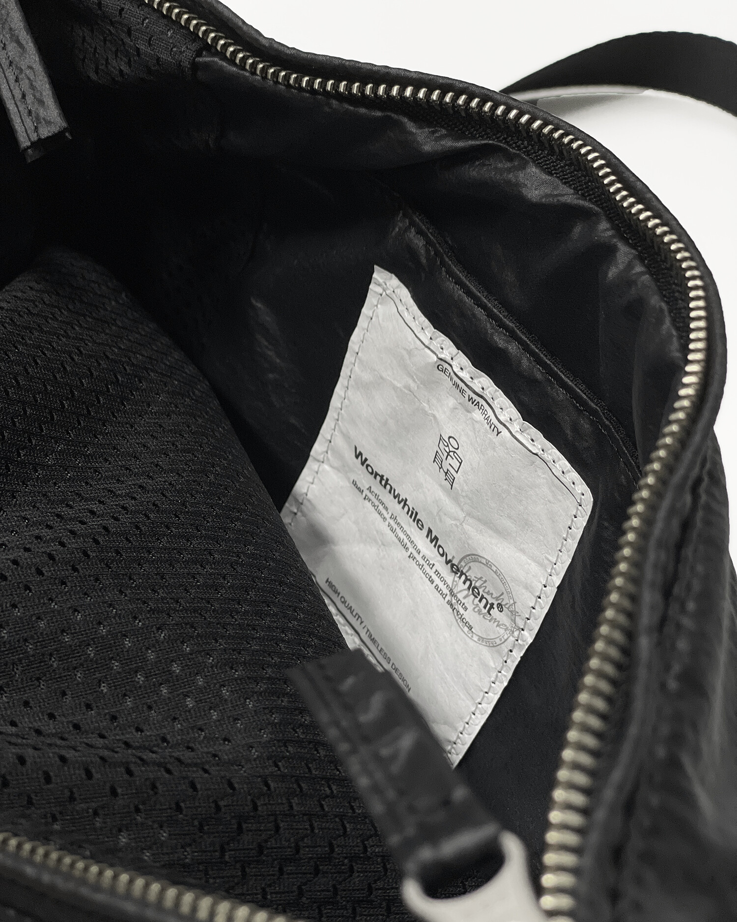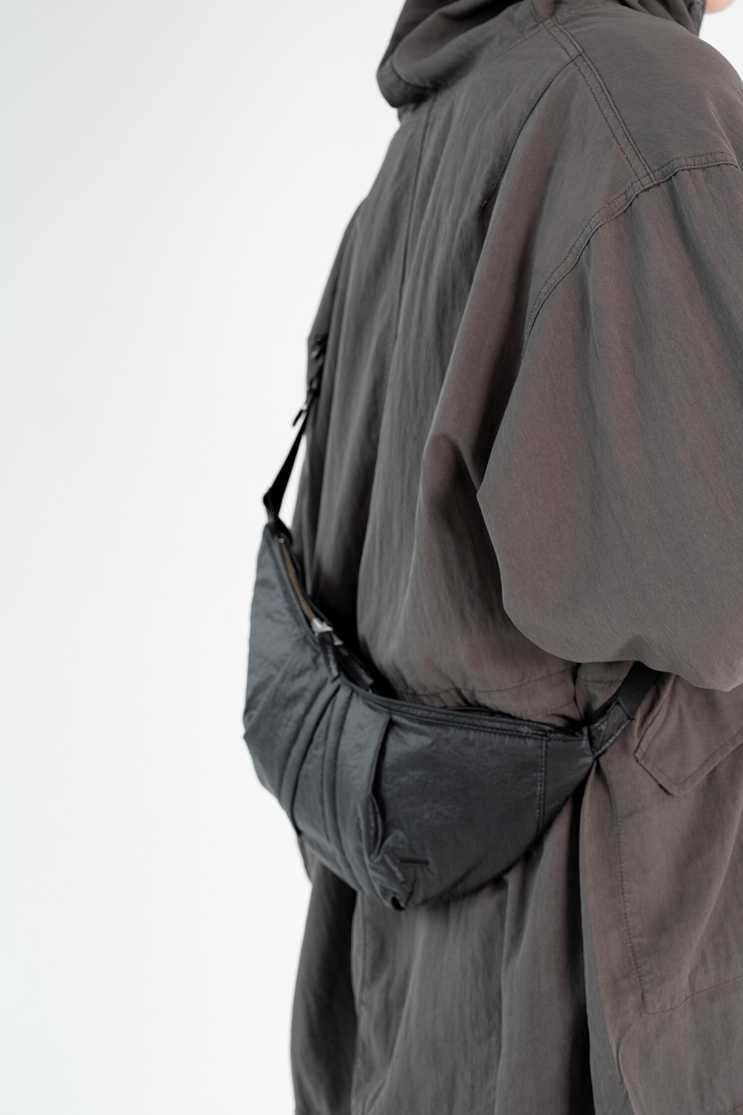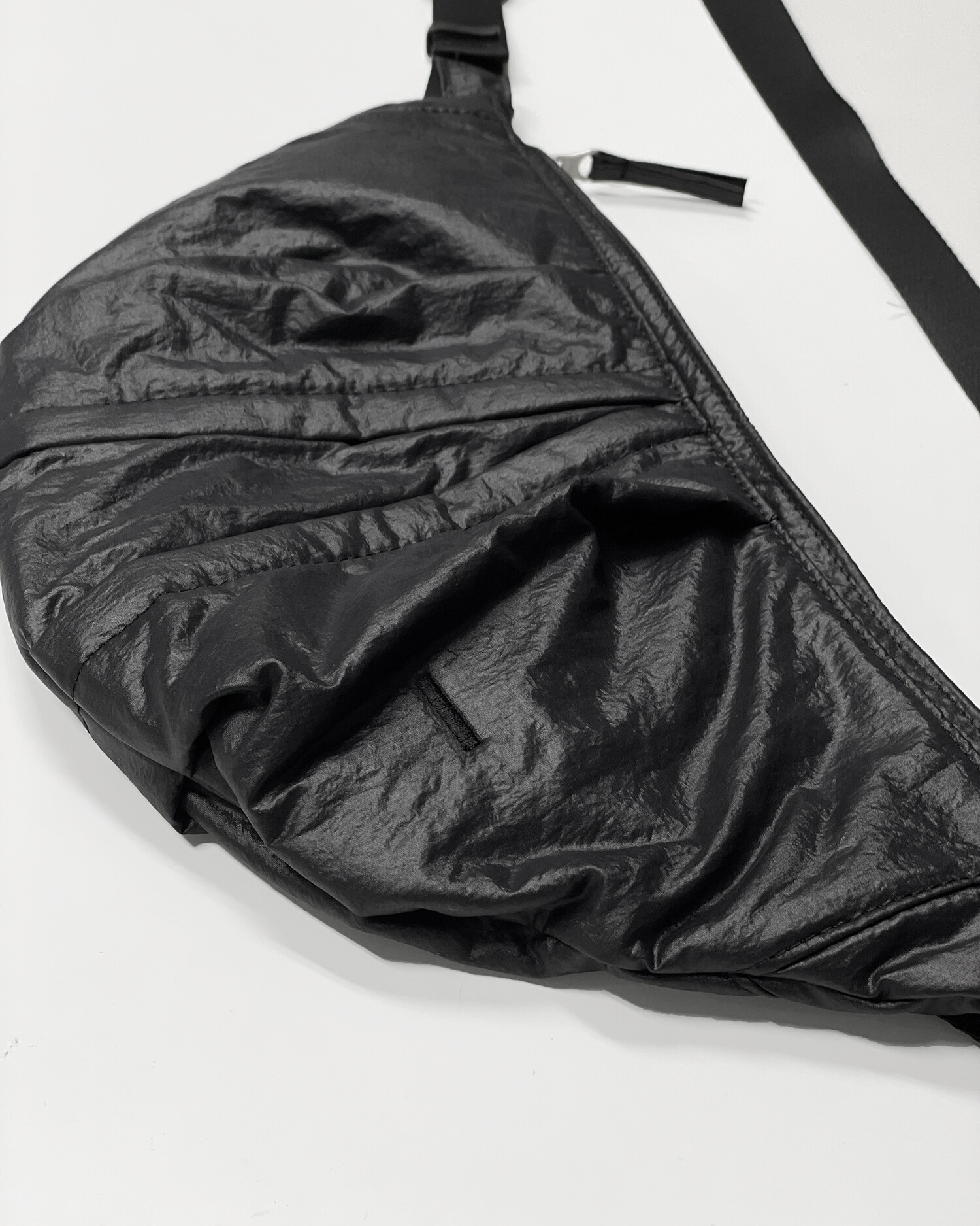 기존에 출시된 램스킨 '카프 백'의 나일론 버전입니다. 좀 더 가볍고 일상에서 편하게 착용할 수 있는 모습으로 리뉴얼한 제품입니다. 시레가공 된 나일론 워셔 원단을 사용해서 바스락거리는 터치감과 고급스러운 광택감이 특징입니다. 전반적인 곡선형의 모양을 강조하고 얇은 원단을 보강하기 위해 겉감과 메쉬 안감 사이에는 2온스 솜과 나일론 다후다 원단이 합포되어 적절한 두께감과 안정적인 형태감을 느낄 수 있습니다. 비교적 스포티하고 캐주얼한 제품이지만 적절한 균형을 위해 지퍼는 YKK 무광 니켈 지퍼로 변경하여 무게감을 잡아준 모습입니다. 탄탄한 나일론 능직 웨빙 스트랩에 램스킨 가죽 트림을 더해 디자인적 밀도를 더했고, 제품의 분위기에 맞게 D링과 사각링 파츠는 YKK 플라스틱 파츠로 변경했습니다. 크기가 작은 제품이기 때문에 내부에는 1개의 이너 포켓만 배치하였고, 폴리테루 협업 타이벡 라벨이 적용된 모습을 보실 수 있습니다. 계절 및 옷차림에 크게 제약을 받지 않는 활용도가 높은 제품으로 폴리테루 팀의 섬세한 디자인 스킬과 월스와일 무브먼트의 제작 노하우가 더해져 누구나 편하게 즐길 수 있는 제품입니다.