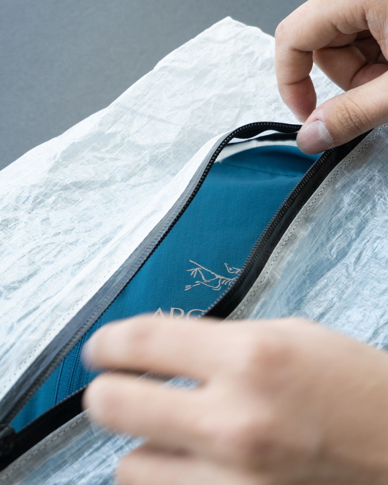 초경량 및 최고 수준의 내구성과 강도를 갖고 있는 프리미엄 패브릭, Dyneema® (다이니마)를 사용한 다용도 집색입니다. 주로 텐트나 타프, 경량 트래킹 백팩 등에 많이 사용되는 원단으로 동일 중량대비 강철보다 강한 원단으로 알려져 있으며 특유의 바스락거리는 질감이 느껴집니다. 여러 중량의 원단 중 집색에 알맞는 0.96온스의 원단을 사용했으며, 내부가 비치는 반투명한 특징이 있습니다. 중앙부 절개를 통해 독특한 구조를 표현했고, 네 면의 모서리는 입체적인 패턴을 통해 여유 분량을 확보했습니다. 지퍼 양끝에는 웨빙 핸들을 만들어서 간편하게 핸드캐리할 수 있고, 홑겹의 원단 위에 3M 프린트 로고로 원단의 특징을 살렸습니다. YKK의 프리미엄 방수지퍼인 아쿠아가드를 사용 하여 생활방수가 가능합니다. 여유로운 용량이지만 45g 의 가벼운 무게로 운동이나 여행, 캠핑, 산행 또는 일상생활 등 어디서든 편하게 사용하실 수 있습니다. 운동이나 여행 또는 산행 후에 젖은 의류나 수건등을 넣으실 수 있고, 신발이나 여분의 옷, 일상 생활 용품도 수납하실 수 있습니다.