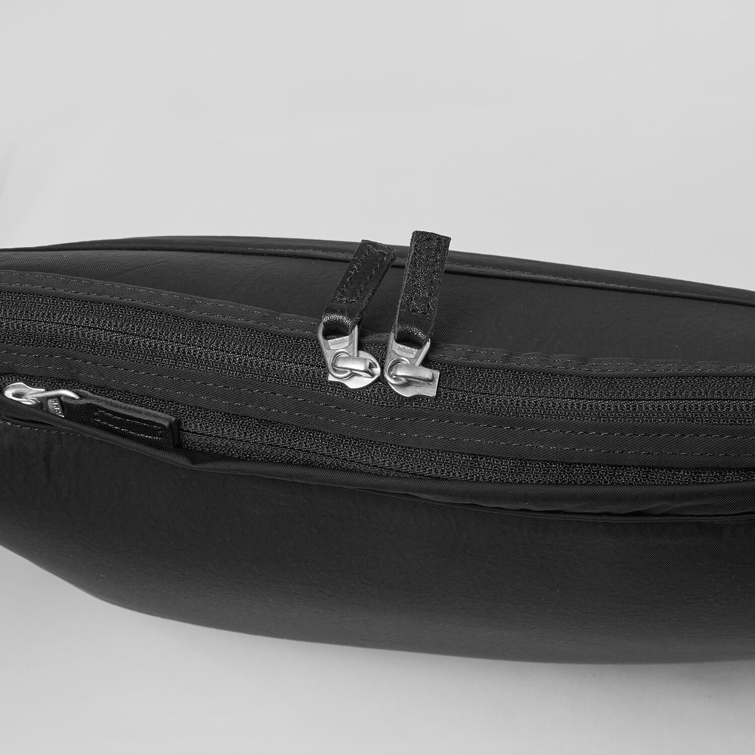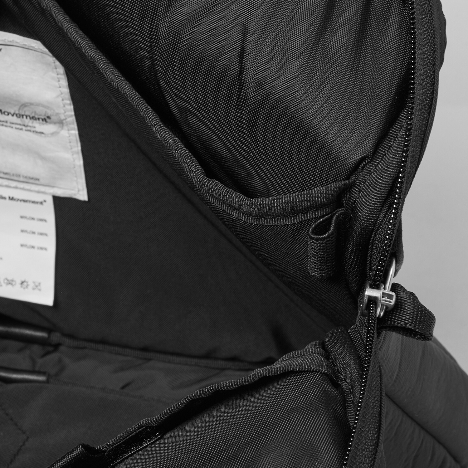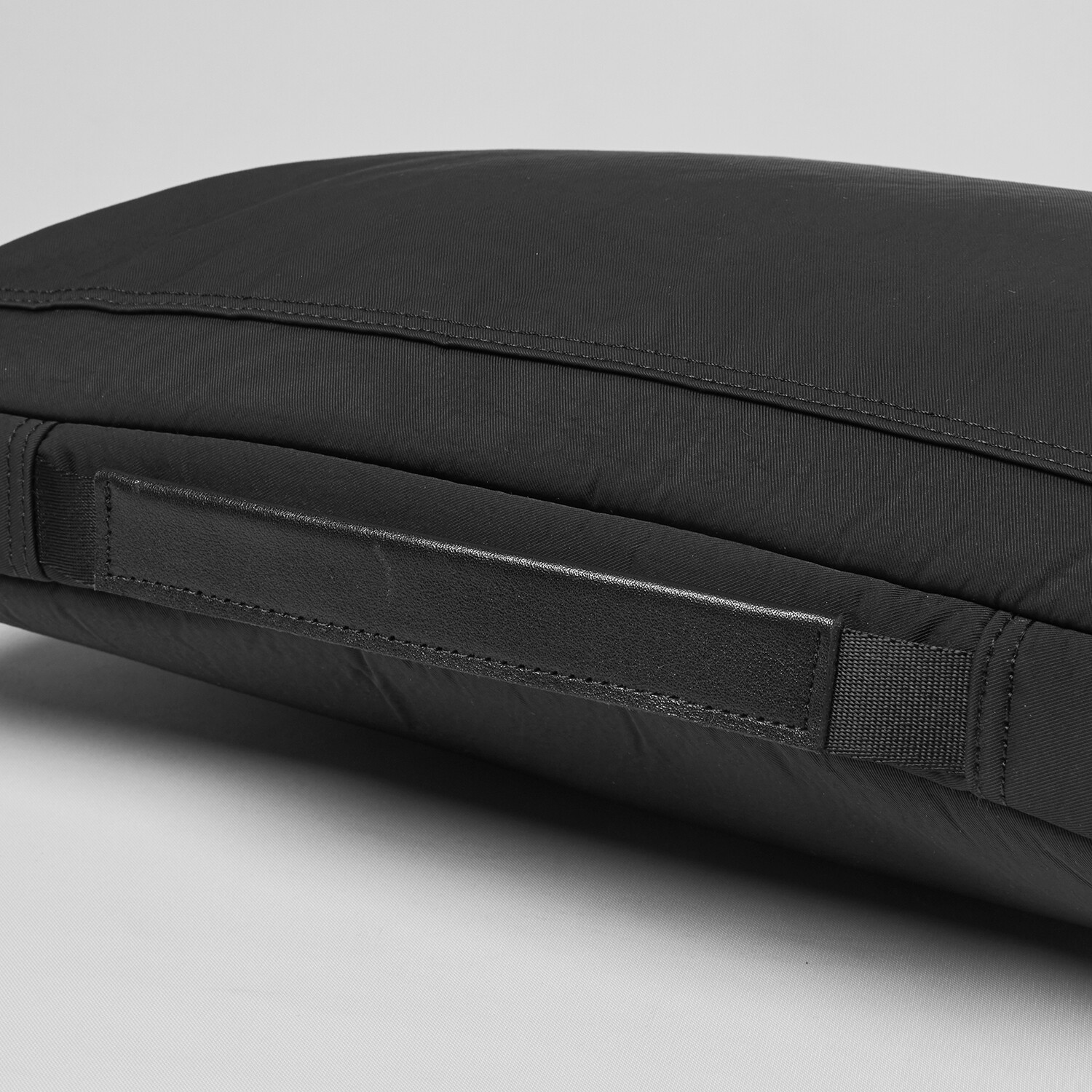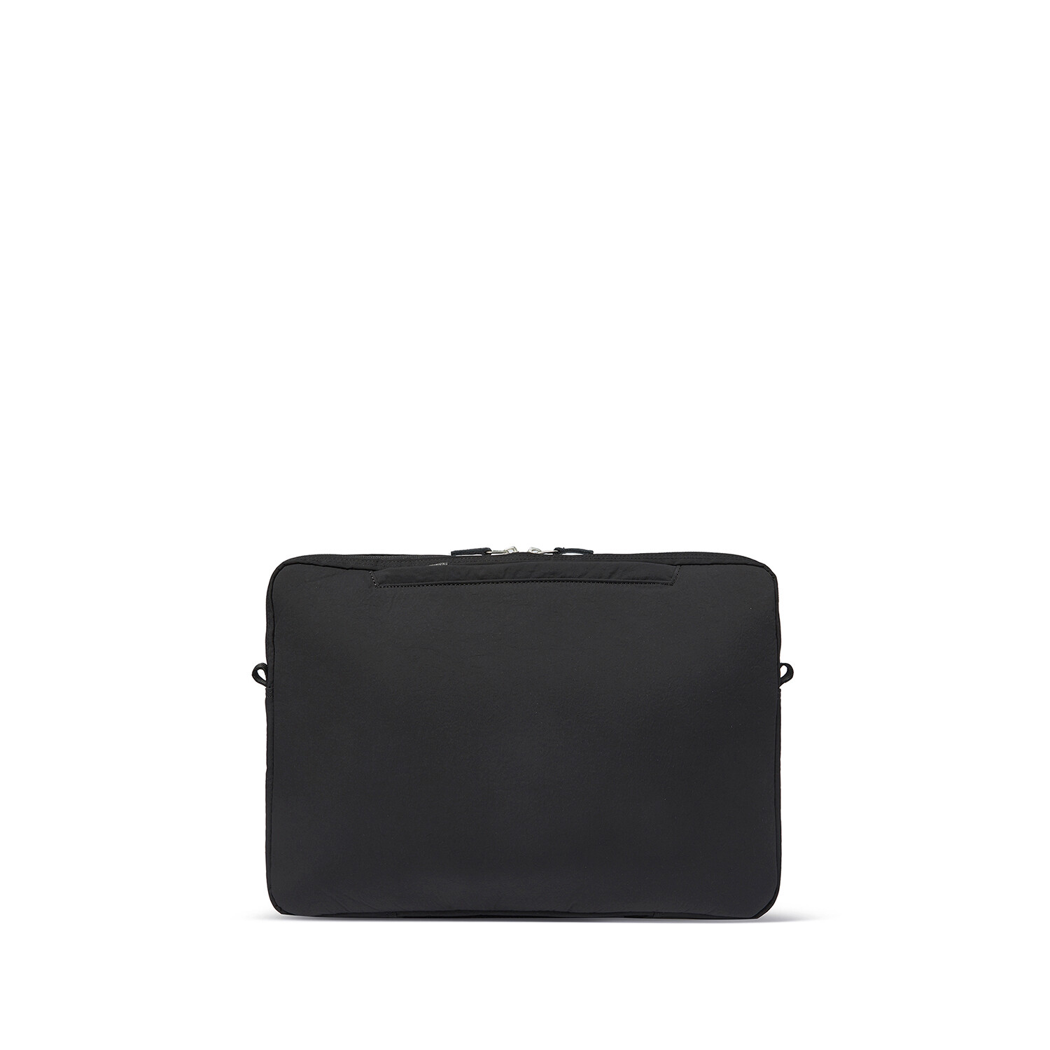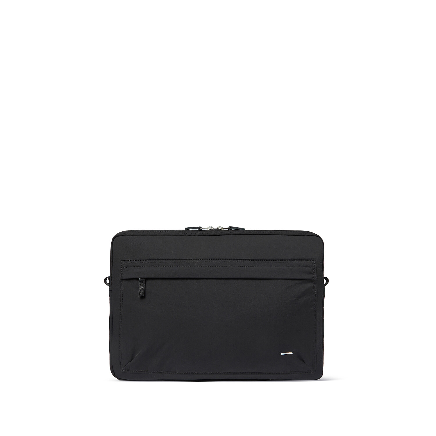 랩탑과 테블릿을 수납할 수 있는 랩탑 케이스 입니다. 랩탑 케이스에서 가장 중요한 부분인 안정감 있는 완충재와 다양한 수납공간 그리고 활용도라고 생각하며 디자인했습니다. 먼저, 수차례의 샘플과 자체 연구를 통해 설계된 본 제품의 구조는 특수 가공을 통해 열접착된 압축 스펀지와 중앙에 2중으로 레이어드된 고탄성 보강재 등으로 구성되어 있습니다. 이는 내부의 전자기기를 외부 충격으로부터 안정감 있게 보호할 뿐 아니라 볼륨감 있고 입체적인 실루엣을 구현합니다. 또한 넉넉한 수납공간을 고려하되, 불필요한 디자인은 제거하기 위해서 외부에 2개의 직관적인 포켓을 만들었고, 내부 구조를 좀 더 밀도있게 설계했습니다. 외부 후면부 포켓은 지퍼의 테이프 부분을 가려 깔끔하게 연출하였고, 지갑이나 핸드폰 등 플랫하고 작은 소지품을 수납할 수 있습니다. 전면부의 큰 포켓은 하단에 다트를 통해 여유공간을 확보한 형태로 좀 더 크고 다양한 물건들을 수납할 수 있습니다. 내부에는 2개의 펜꽂이와 전자기기 케이블을 정리할 수 있는 벨크로 및 고무밴드가 있으며, 바텍으로 꼼꼼하게 마감했습니다. 뿐만 아니라 내부 시접 마감은 카우레더로 고급스럽게 마무리하여 보이지 않는 부분까지도 세심하게 처리했습니다. 더불어 이 랩탑 케이스는 별도로 제공되는 탈부착 가능한 크로스 스트랩을 통해 크로스백으로 연출할 수 있어 활용도가 높은 제품입니다. 현대인의 필수품 중 하나가 된 전자기기들이나 서류들을 수납하는 크로스백 타입의 브리프 케이스 역할을 수행하는 동시에 하단에 있는 카우레더와 결합된 웨빙 핸들을 통해 클러치 형태로도 안정적인 핸드 캐리가 가능합니다.