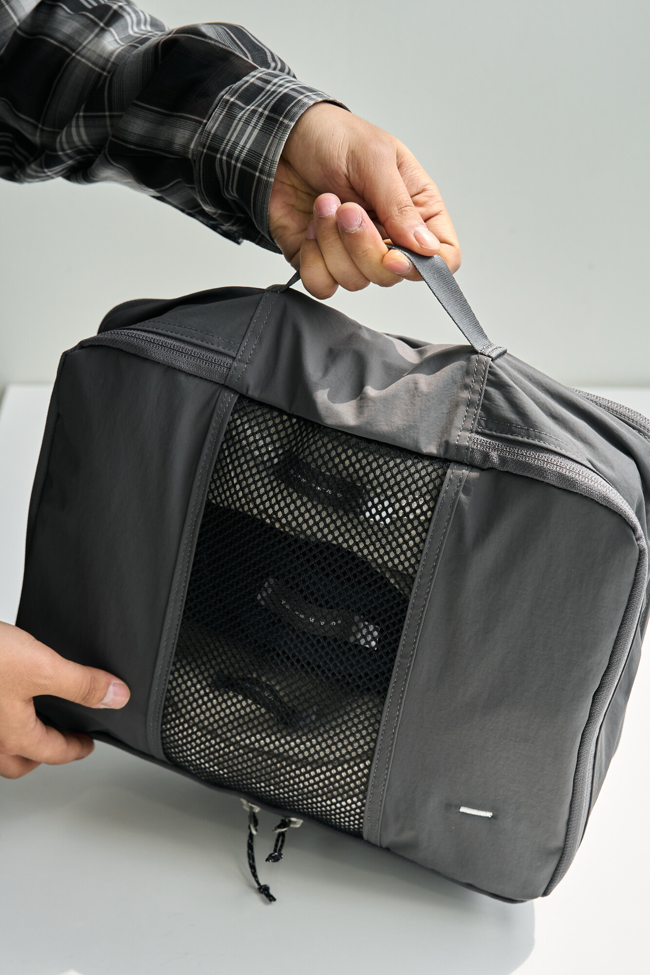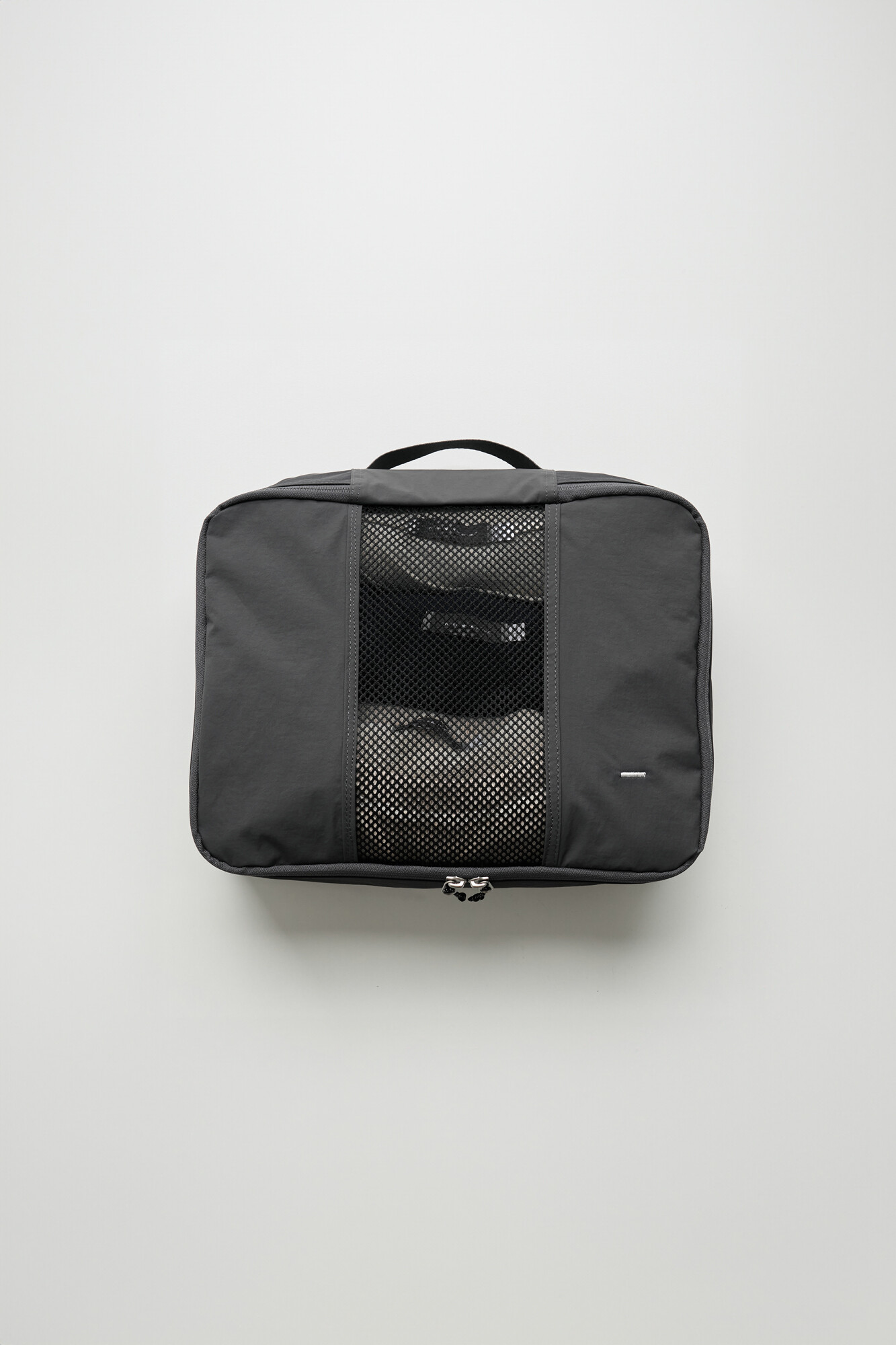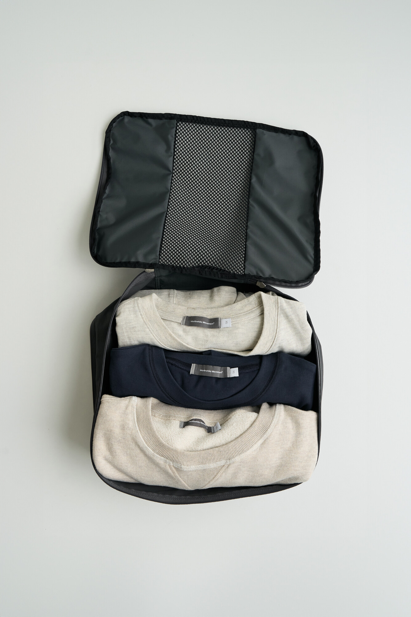 트래블라이저는 여행과 출장 등의 상황에서 사용하기 좋은 오거나이저 타입의 파우치 입니다. 웨빙 핸들이 있어서 간편한 핸드캐리가 가능하고 상, 하단 양쪽 면을 모두 사용하실 수 있습니다. 메인 수납공간인 상단에는 티셔츠를 3~4장 말아서 보관하실 수 있으며 팬츠류도 2~3장 알맞게 넣어 구김없이 보관하실 수 있습니다. 큰 가방이나 캐리어 안에서 여러 의복을 정리/수납하시는데 용이하며, 메쉬 소재 원단으로 인해 내부의 물건을 열지 않고 간편히 확인하실 수 있습니다. 반대면에는 벨크로를 통해 여닫을수 있는 플랫한 포켓이 있어서 여권이나 화장품 등 부피가 작은 물건을 수납하실 수 있습니다. 단순한 형태이지만 YKK RC 체인 리버스 타입 지퍼를 사용하여 부드러운 지퍼 핸들링과 미니멀한 미감으로 인해 여행 및 출장을 앞둔 분에게 선물하기도 좋은 제품입니다. 트래블라이저를 통해 기분 좋은 여행 및 출장이 되시길 바랍니다.