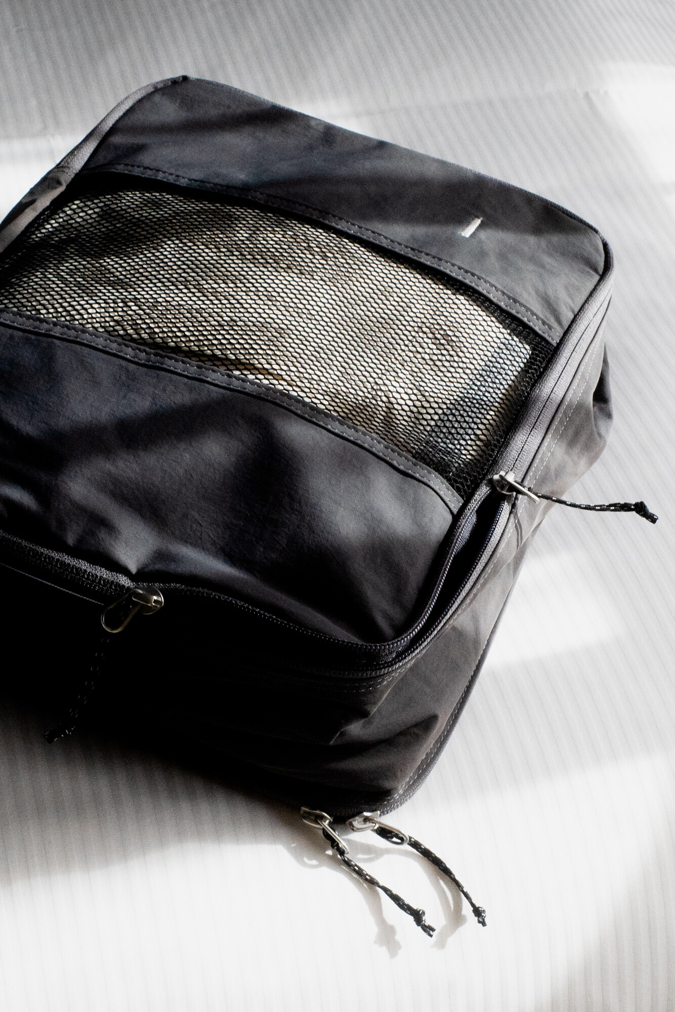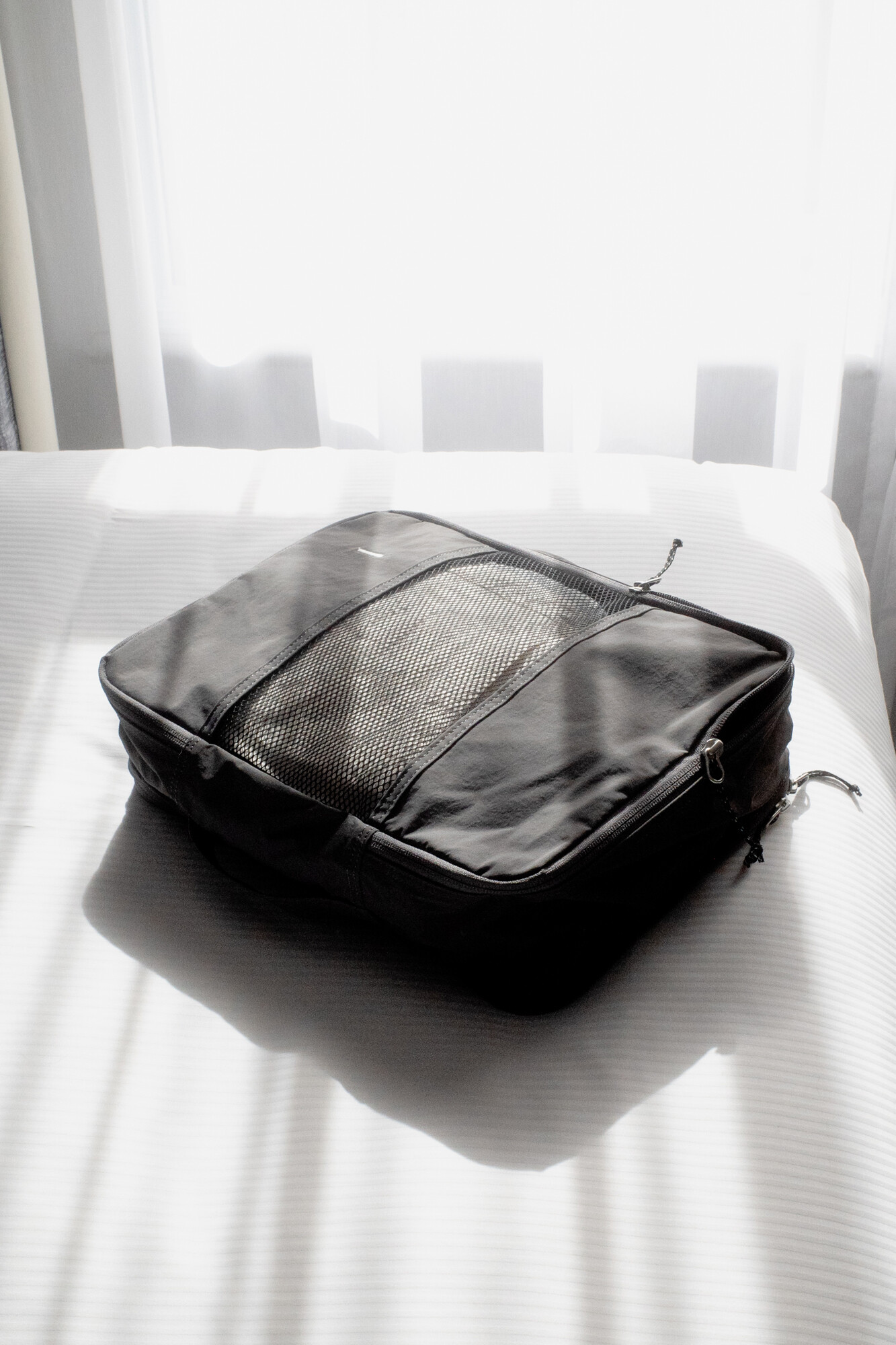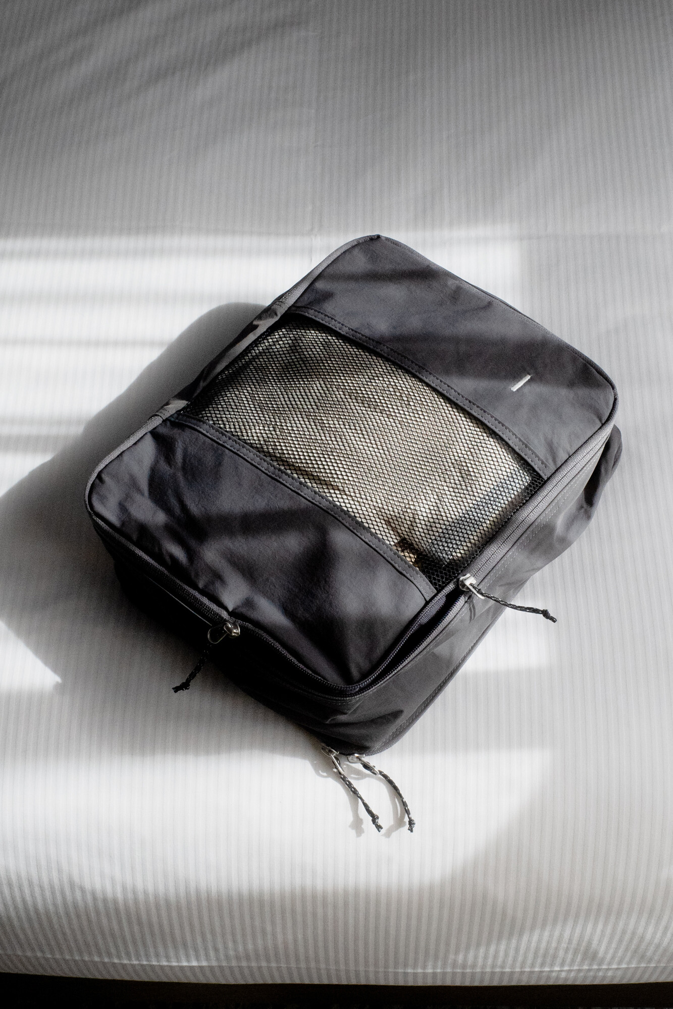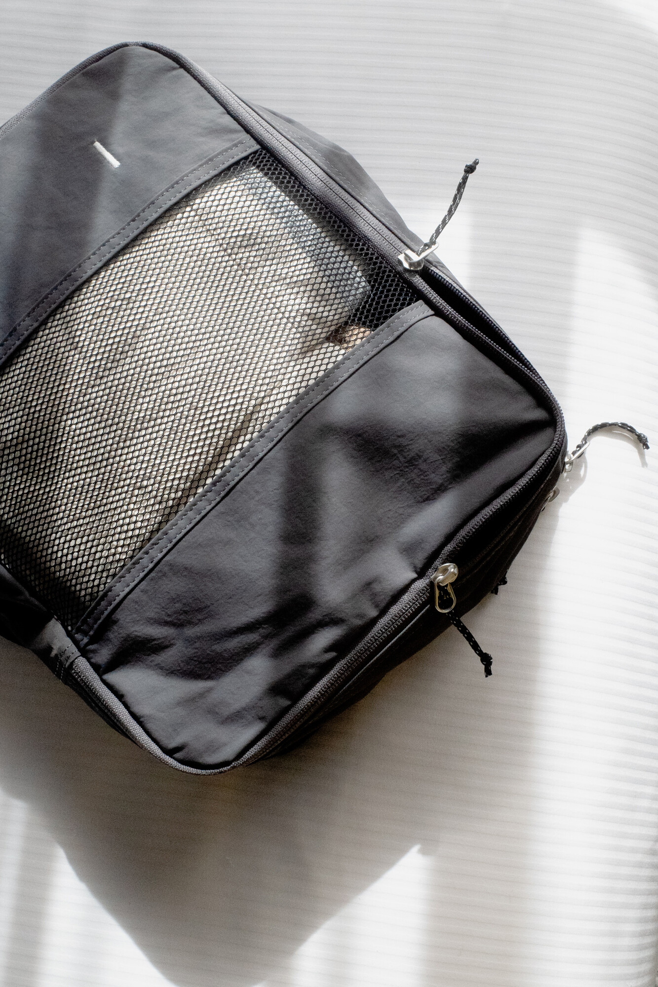 트래블라이저는 여행과 출장 등의 상황에서 사용하기 좋은 오거나이저 타입의 파우치 입니다. 웨빙 핸들이 있어서 간편한 핸드캐리가 가능하고 상, 하단 양쪽 면을 모두 사용하실 수 있습니다. 메인 수납공간인 상단에는 티셔츠를 3~4장 말아서 보관하실 수 있으며 팬츠류도 2~3장 알맞게 넣어 구김없이 보관하실 수 있습니다. 큰 가방이나 캐리어 안에서 여러 의복을 정리/수납하시는데 용이하며, 메쉬 소재 원단으로 인해 내부의 물건을 열지 않고 간편히 확인하실 수 있습니다. 반대면에는 벨크로를 통해 여닫을수 있는 플랫한 포켓이 있어서 여권이나 화장품 등 부피가 작은 물건을 수납하실 수 있습니다. 단순한 형태이지만 YKK RC 체인 리버스 타입 지퍼를 사용하여 부드러운 지퍼 핸들링과 미니멀한 미감으로 인해 여행 및 출장을 앞둔 분에게 선물하기도 좋은 제품입니다. 트래블라이저를 통해 기분 좋은 여행 및 출장이 되시길 바랍니다.