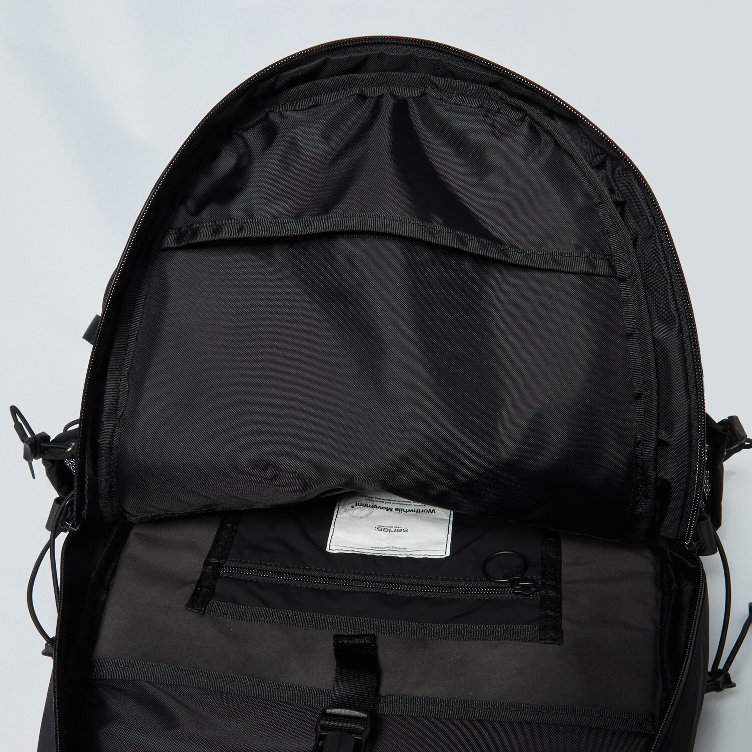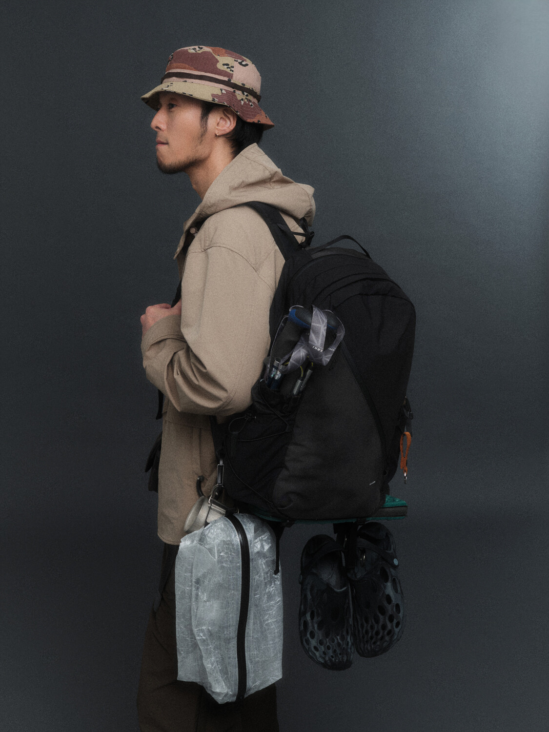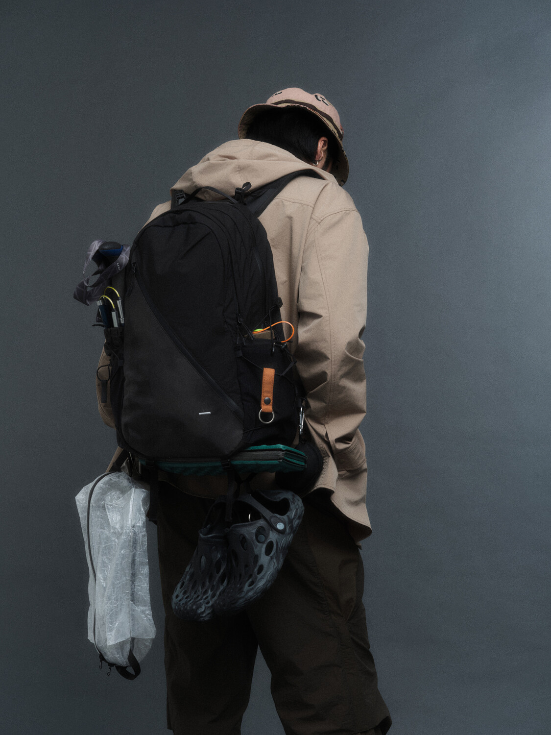 • 시리즈 협업 제품 • 유틸리티 디테일이 가미된 데일리 백팩 • 인체 공학적 설계의 백팩 스트랩과 보강재가 삽입된 편안한 등판 구조 • 클립을 통한 체스트 스트랩 위치 조절 기능(Sternum system) • 전면부 방수 지퍼 및 플리츠 디테일 • 방수 지퍼 내 메쉬 포켓 2중 구조 • 방수 지퍼 양 끝 하이파론 고무 마감 • 양 측면 메쉬 포켓에 E-스트링+스토퍼로 입구를 마감하여 편안한 사용감 • 포켓 내 소지품을 2중으로 잡아주는 Z자 구조의 E-스트링과 스트링 버클 디테일 • 하단 고밀도 립스탑 사용으로 내구성 향상 • 가방 바닥면에 웨빙과 어드저스터를 사용하여 실루엣 조절과 소지품 결착 가능 • 내부 메인 공간 속 랩탑 수납을 위한 별도 파티션 • 내부에 다양한 수납 공간을 배치하여 분리/수납 가능 • 메인 지퍼 양 끝, 삼각 날개 부분에 D링을 배치하여 각종 도구나 카라비나 등 결착 가능 • YKK® RC 체인 지퍼 사용 • 발수 코팅된 나일론 립스탑 패브릭과 디지털 프린팅으로 표현한 빈티지무드의 타이다잉 패브릭 • 타이다이 키링과 오렌지 컬러의 나일론 키링 기본 제공