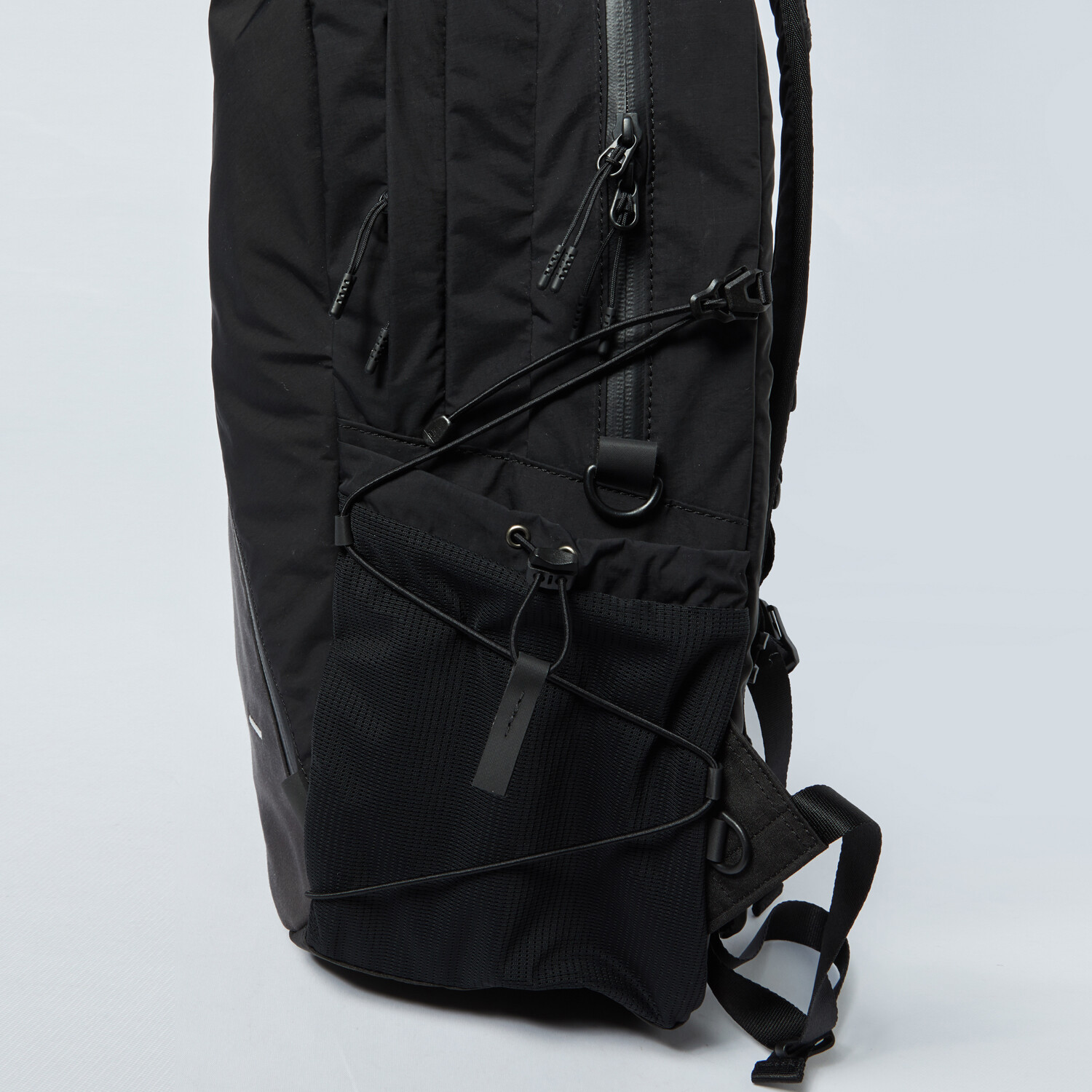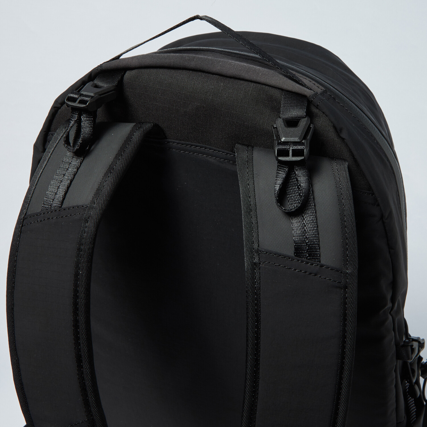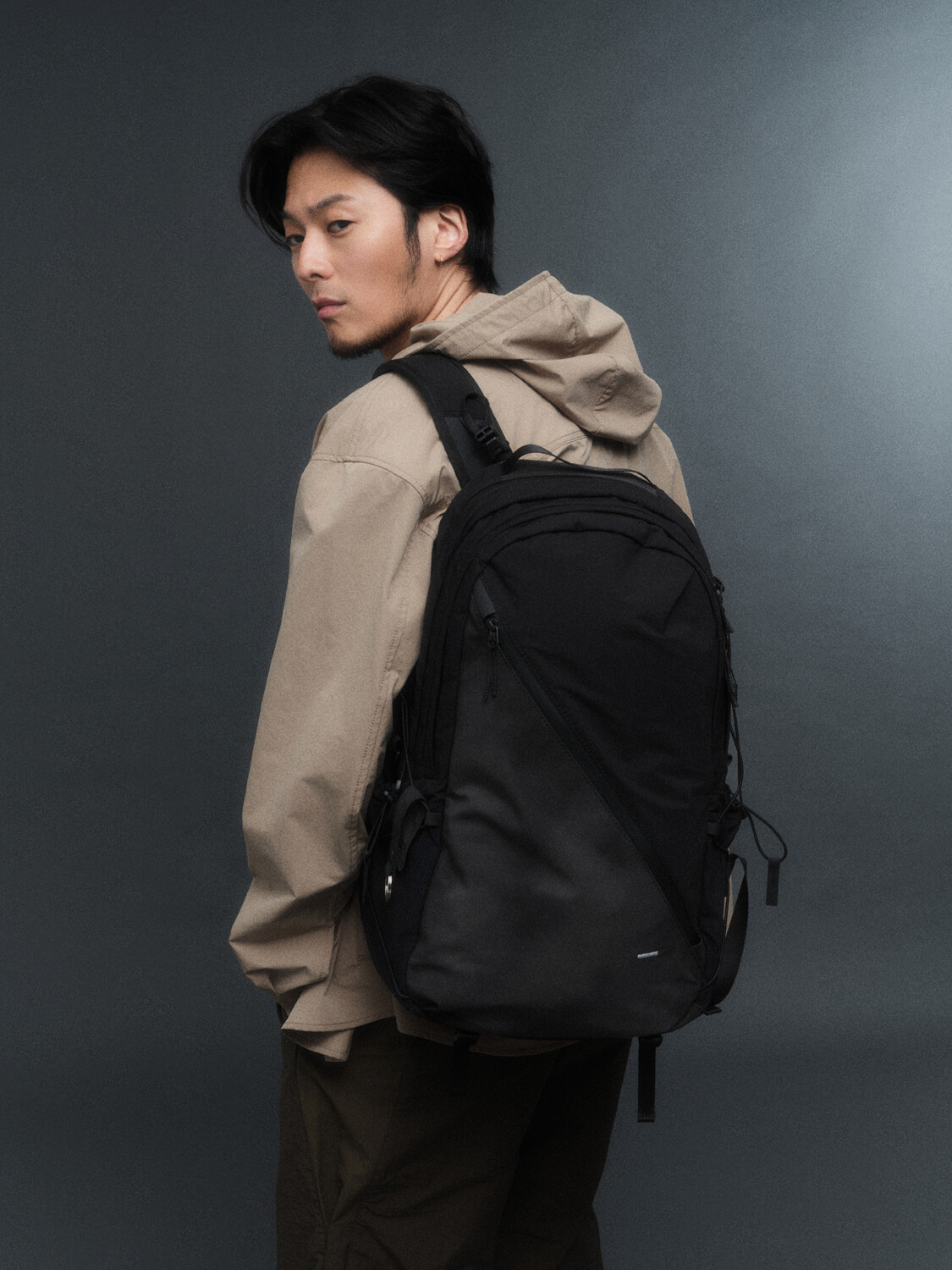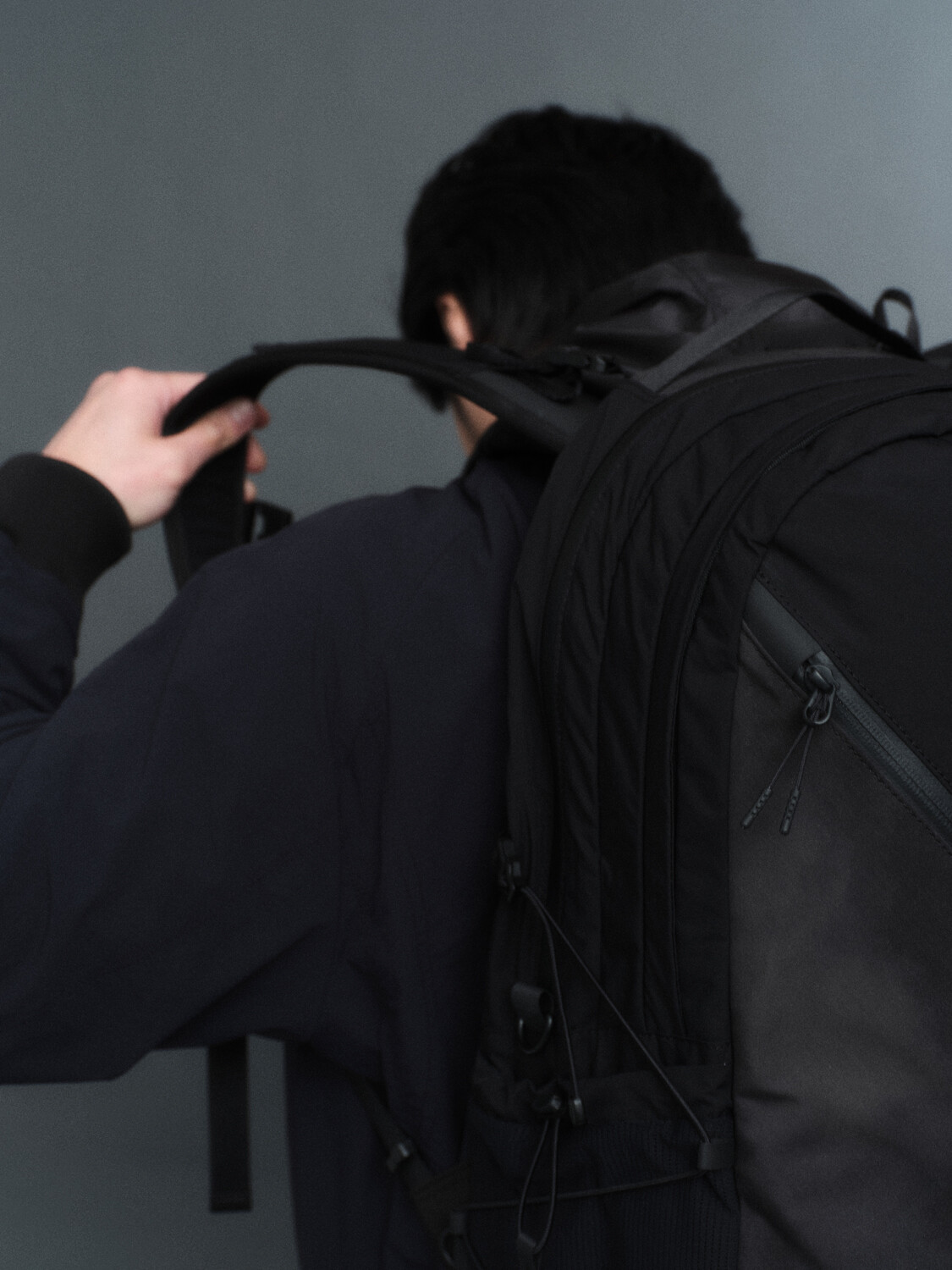 : 모던한 분위기에 유틸리티적인 디테일이 추가된 데일리 백팩입니다. 출,퇴근용으로 사용하기 알맞게 별도의 랩탑 파티션 배치 및 내부에는 작은 수납 공간이 다양하게 구분되어 있으며 여유로운 용량으로 짧은 여행용으로도 사용하실 수 있습니다. 백팩 스트랩과 등판 그리고 바닥면에는 사용자의 편의성을 고려하고 처짐을 방지하기 위한 고탄성의 보강재들이 적합하게 위치해 있어서 장시간 사용하셔도 무리가 없습니다. 하단의 웨빙과 어드저스터를 통해 내부 용량에 맞춰 가방 형태를 조절하실 수 있고 벗어둔 겉옷이나 매트등을 말아서 보관할 수 있습니다. 옆 면에는 메쉬 소재의 포켓이 있어서 각종 보틀이나 우산 등의 물건을 넣어두실 수 있고 E-스트링과 버클 및 스토퍼로 알맞게 조여 고정시킬 수 있습니다. 가방의 스트랩은 인체공학적인 곡선형으로 설계되어 흘러내림이 덜하고 두 개의 어깨끈을 잡아주는 '체스트 스트랩'은 클립을 통한 Sternum System이 적용되어 위치(높이)를 조절할 수 있습니다. 바닥면과 등판 일부분에는 발수 코팅된 밀도있는 립스탑 원단을 사용하여 내구성 측면에서도 세심하게 신경쓴 제품입니다.