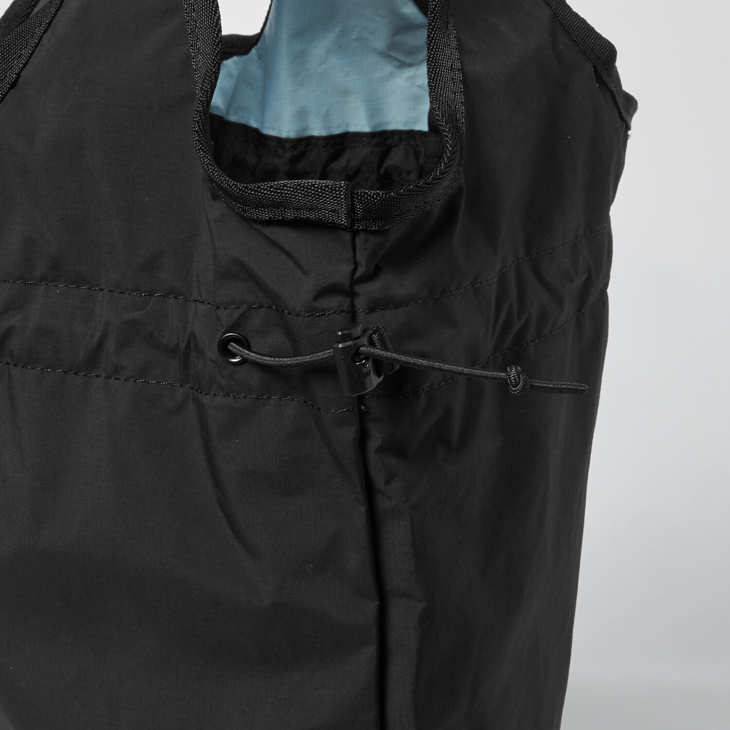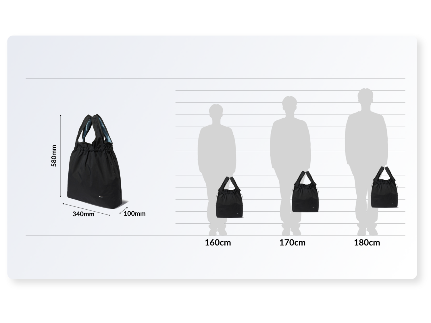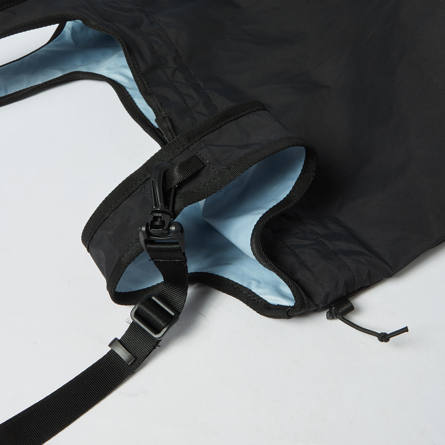 •일상 속 다방면에서 활용하기 좋은 다용도 마켓백 •초고분자량 폴리에틸렌 소재를 코팅한 N/P 분할사 원단 사용 •전기차의 배터리 분리막을 리사이클한 텍스닉 소재 활용 •방오, 내구성 강화를 위해 분리막 면에 추가 Foil 코팅 진행 •경/위사 5:5 배열의 좋은 밸런스의 ATY 가공 원단 •탈부착이 가능한 나일론 능직 웨빙 스트랩과 회전식 후크를 통해 크로스백으로 사용 가능 •E-스트링과 스토퍼를 사용하여 입구 및 실루엣 조절 기능 •이너 포켓 •재팬 썬그립 스냅버튼 사용