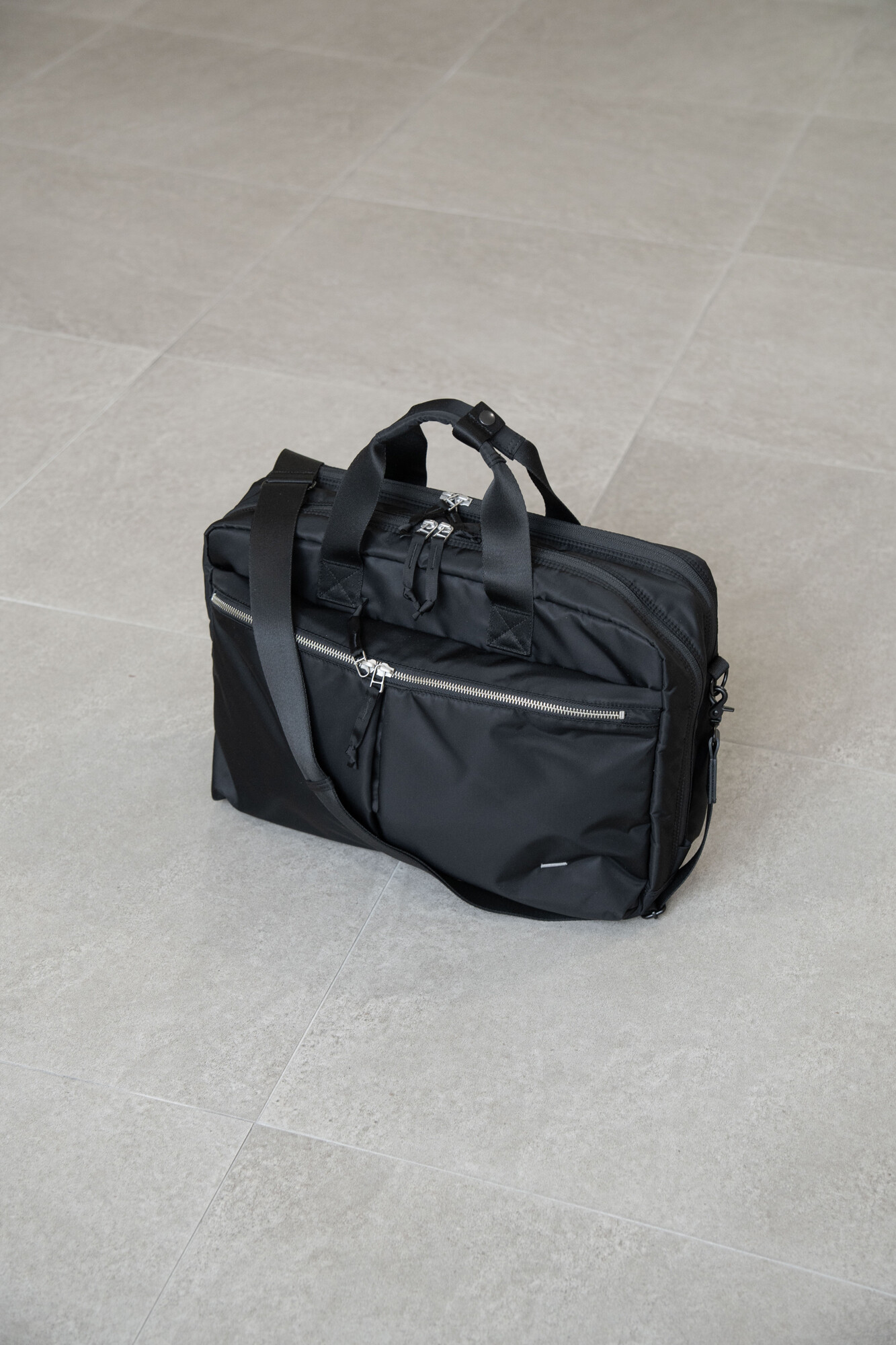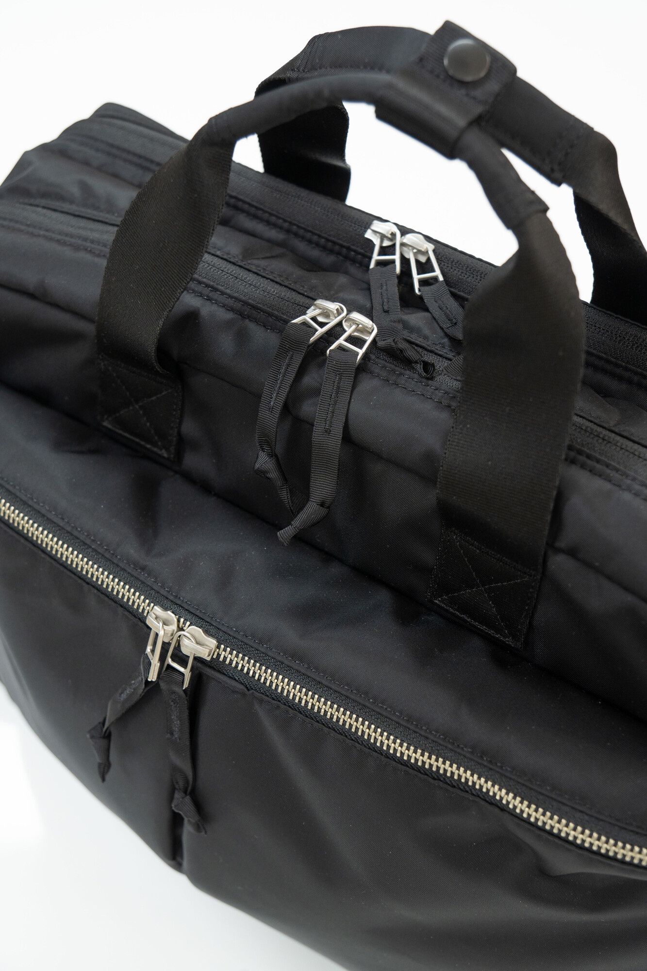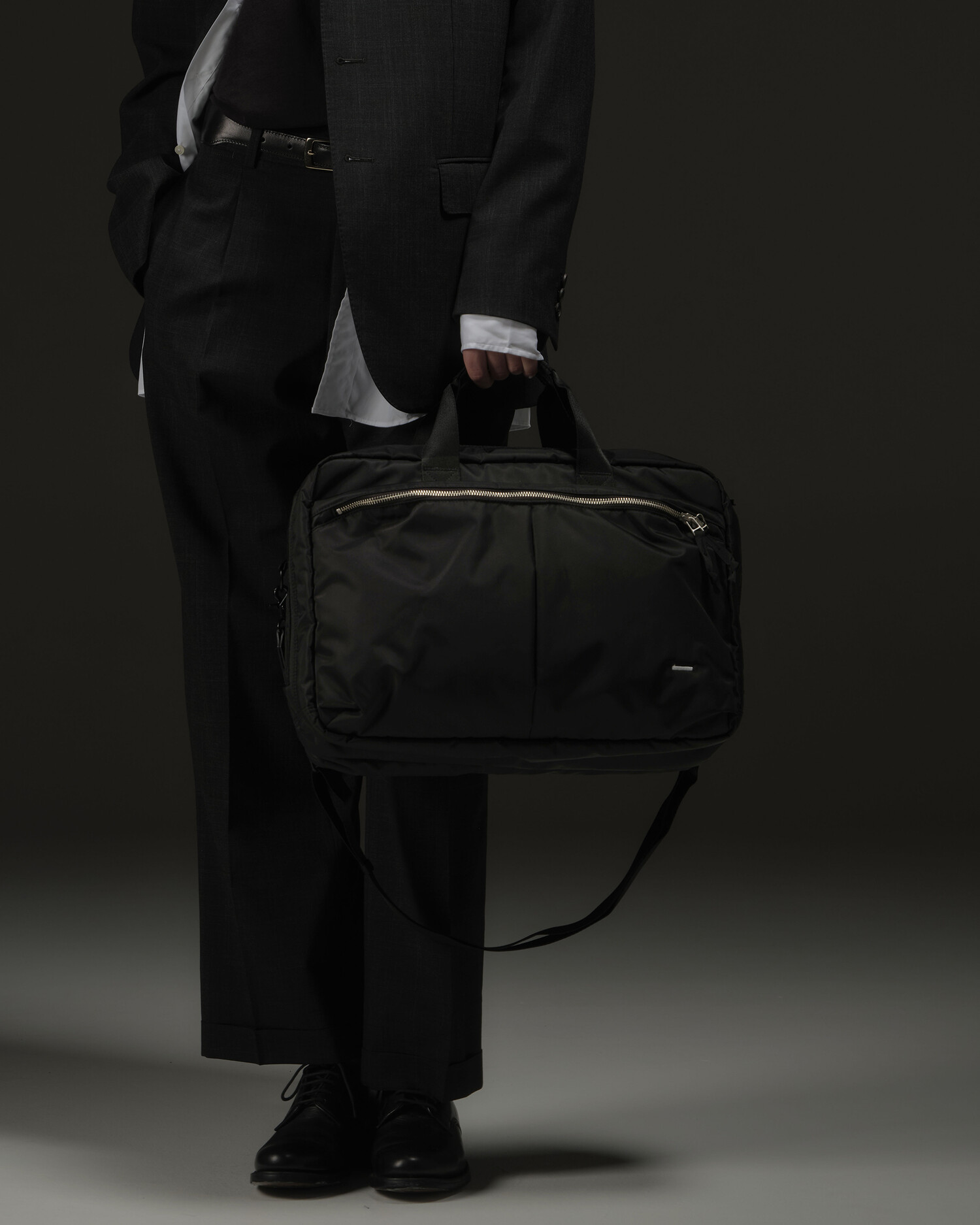 비즈니스와 데일리의 경계를 허문 하이엔드 브리프케이스, TRUSS 3C 도큐먼트 백은 '구조적인 아름다움'이라는 테마 아래 세련된 실루엣과 탄탄한 기능성을 동시에 담아낸 TRUSS 시리즈의 첫 번째 결과물입니다. 효성 TNC의 고밀도 재생 나일론을 메인 원단으로 사용하여 가볍고 견고하며, 은은한 광택이 도는 텍스처와 깊이감이 있는 컬러감으로 모던한 분위기를 극대화했습니다. 보강재를 덧댄 바디는 형태가 흐트러지지 않도록 안정적으로 잡아주며, 손에 들었을 때나 어깨에 멨을 때 모두 편안한 착용감을 제공합니다. 특히 이 제품은 3개의 독립적인 수납칸(Compartment)으로 구성되어 있으며, 메인 지퍼부에는 2중 거젯 구조(나일론+메쉬) 를 적용하여 넓은 개폐 편의성과 함께 소지품 이탈 방지 기능을 더했습니다. 또한 프론트 포켓을 옆에서 보았을 때 상단으로 상승하는 듯한 구조와 프론트 플리츠는 시각적인 포인트가 되어 입체적인 실루엣을 완성합니다. 외관의 지퍼는 빈티지한 무드의 니켈 메탈 지퍼와 실용적인 나일론 지퍼를 조화롭게 배치하여 클래식과 컨템포러리의 균형을 세심하게 조율하였습니다. 전면 포켓 내부에는 다양한 크기의 수납공간이 배치되어 소지품을 항목별로 분리하여 정리할 수 있어 업무나 이동 중에도 효율적인 사용이 가능합니다. 후면에는 랩탑 전용 파티션이 별도로 마련되어 있으며, 내부 폼 보강을 통해 전자기기의 안전한 보관이 가능합니다. 또한 캐리어 웨빙 슬릿과 히든 포켓을 갖추고 있어 출장이나 여행 시에도 뛰어난 활용도를 보여줍니다. 핸들은 원단과 보강재를 이중 마감한 후 YKK 스냅 파츠로 결속할 수 있어, 토트 형태로 사용할 때에도 손에 감기는 안정감과 편리한 그립감을 제공합니다. 스트랩은 가죽 디테일을 섬세하게 배치하여 고급스러운 무드를 더했으며, 길이 조절 또한 간편합니다. 금속 파츠는 모두 흑무광 마감으로 통일하여 전체적인 디테일의 밀도를 높였습니다. 총 17L의 수납 용량으로, 평일의 업무용은 물론 짧은 1박 출장에도 유용하게 활용할 수 있으며, TRUSS 시리즈 특유의 테크니컬 구조미와 고급스러운 소재 활용이 어우러져 유행에 구애받지 않고 오랫동안 함께할 수 있는 진정한 하이엔드 퀄리티의 브리프케이스입니다.