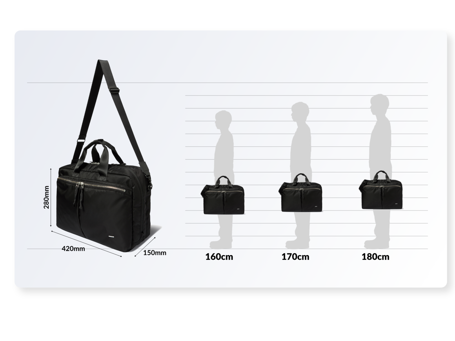 ▶︎ SIZE: 420 x 280 x 150 (mm) ▶︎ WEIGHT: 720g ▶︎ CAPACITY: 17L ▶︎ STORAGE : 17” LAPTOP ▶︎ TYPE: 2Way (Tote bag, Cross bag) ▶︎ COLOR: Black ▶︎ FABRIC : Nylon 100% (Mipan regen 2L Recycle Nylon) ▶︎ LINING: Nylon100% ▶︎ WEBBING: Nylon100% ▶︎ ZIPPER: YKK® ▶︎ SNAP: YKK® ▶︎ PARTS: Matte black nickel parts ▶︎ ORIGIN: Korea