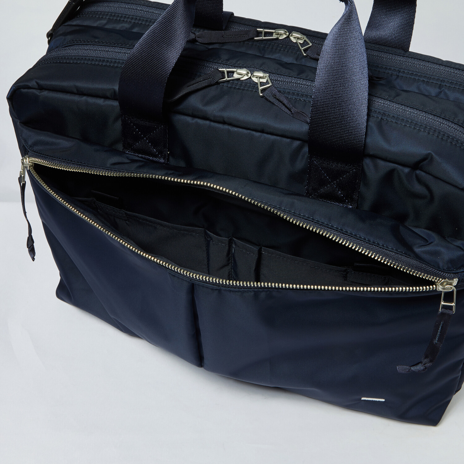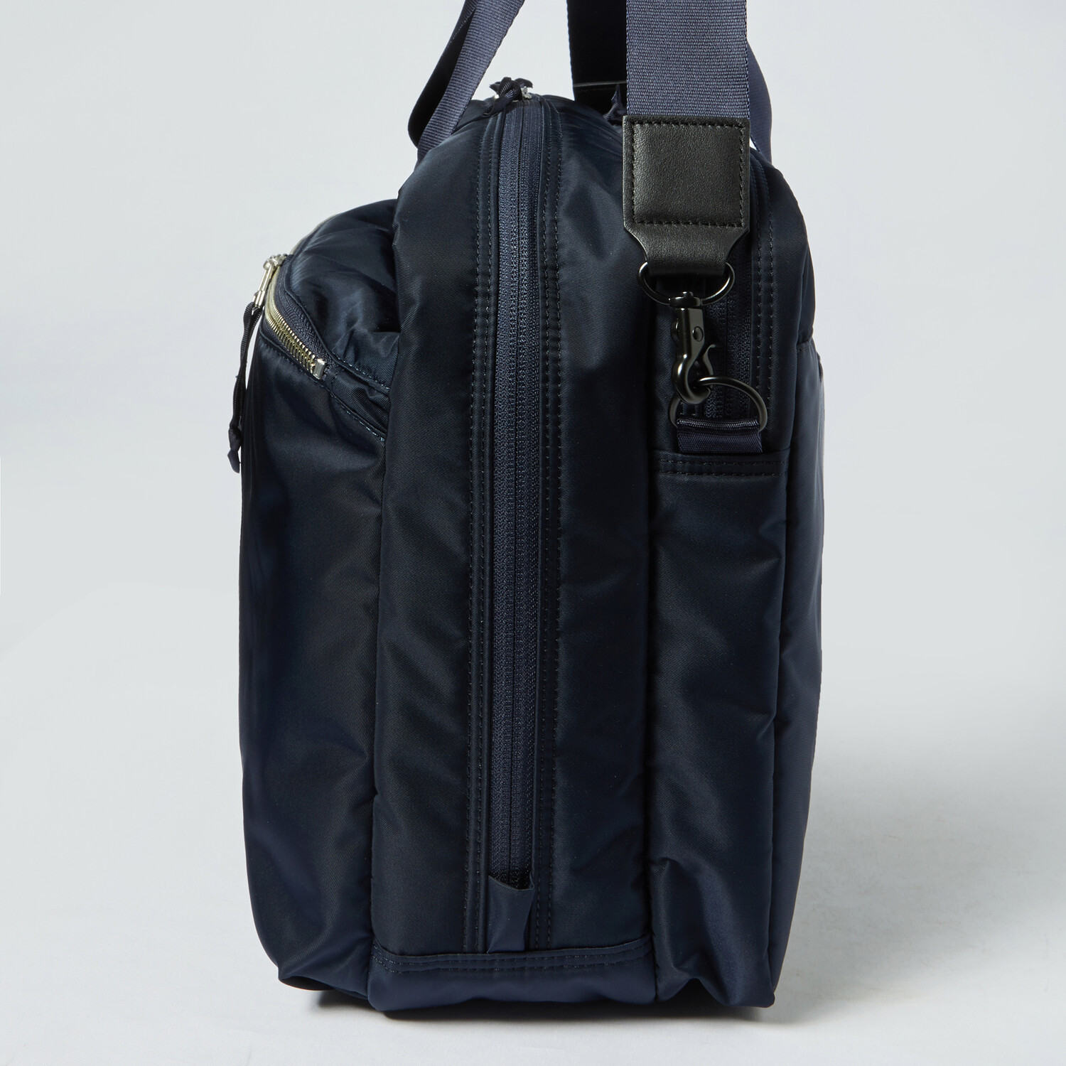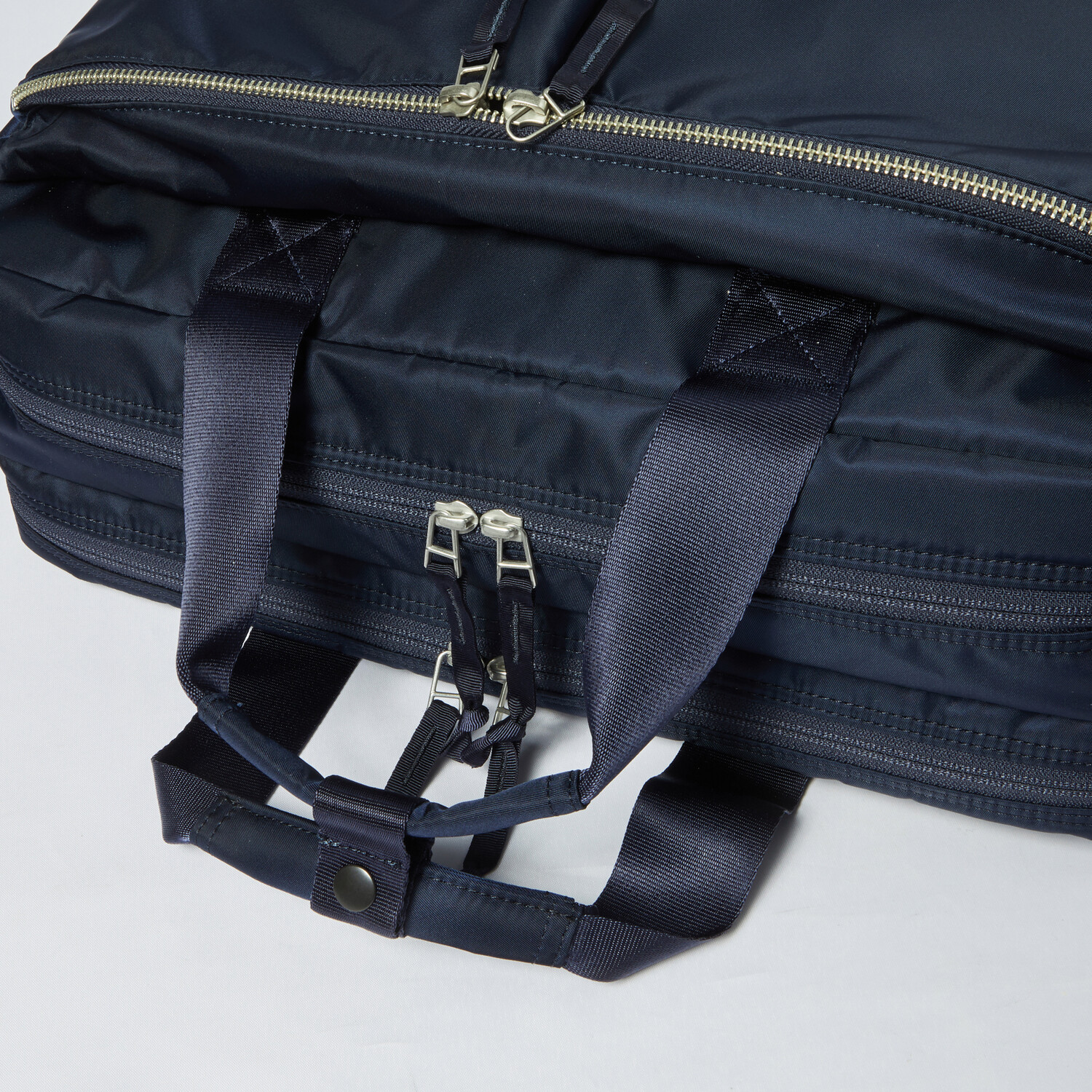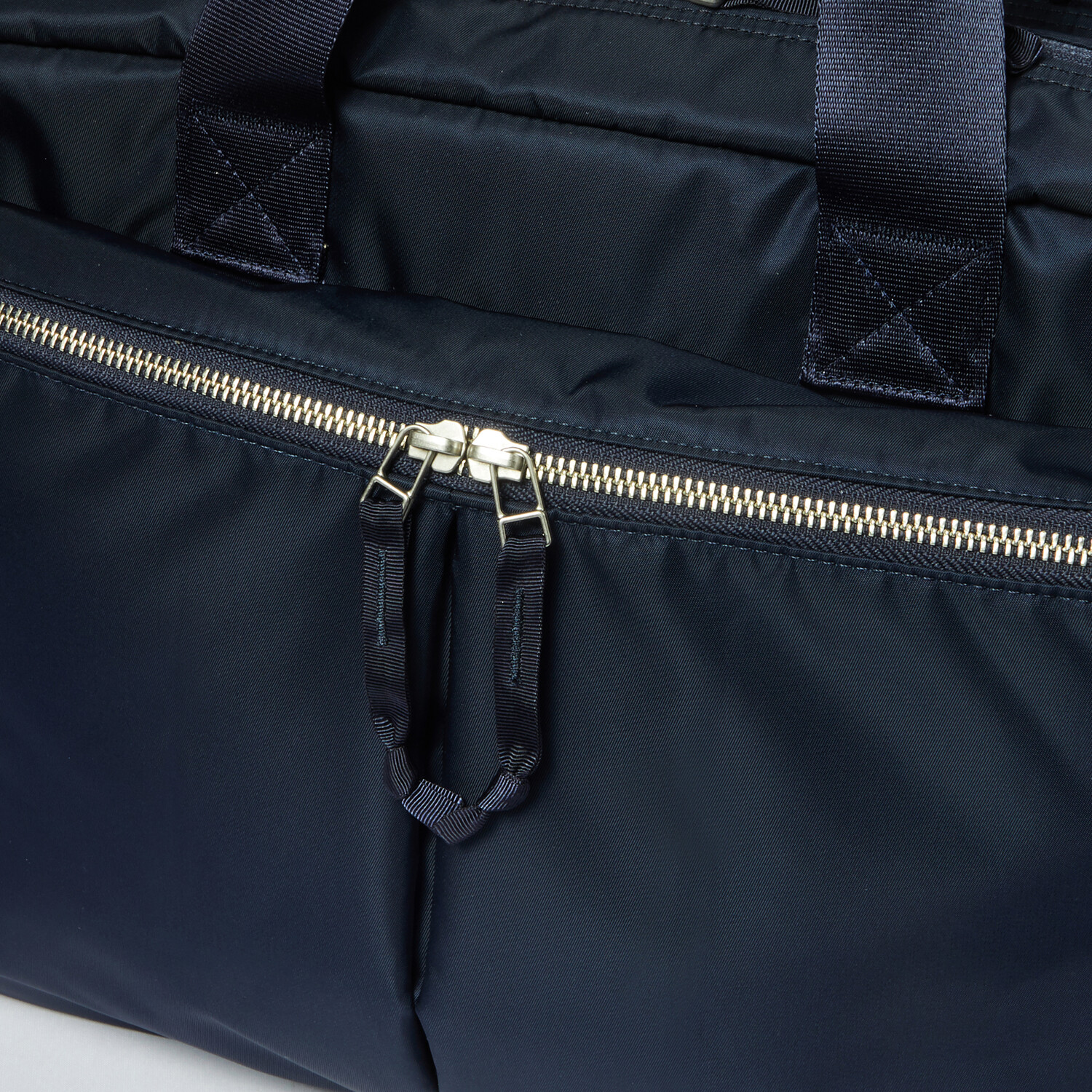 비즈니스와 데일리의 경계를 허문 하이엔드 브리프케이스, TRUSS 3C 도큐먼트 백은 '구조적인 아름다움'이라는 테마 아래 세련된 실루엣과 탄탄한 기능성을 동시에 담아낸 TRUSS 시리즈의 첫 번째 결과물입니다. 효성 TNC의 고밀도 재생 나일론을 메인 원단으로 사용하여 가볍고 견고하며, 은은한 광택이 도는 텍스처와 깊이감이 있는 컬러감으로 모던한 분위기를 극대화했습니다. 보강재를 덧댄 바디는 형태가 흐트러지지 않도록 안정적으로 잡아주며, 손에 들었을 때나 어깨에 멨을 때 모두 편안한 착용감을 제공합니다. 특히 이 제품은 3개의 독립적인 수납칸(Compartment)으로 구성되어 있으며, 메인 지퍼부에는 2중 거젯 구조(나일론+메쉬) 를 적용하여 넓은 개폐 편의성과 함께 소지품 이탈 방지 기능을 더했습니다. 또한 프론트 포켓을 옆에서 보았을 때 상단으로 상승하는 듯한 구조와 프론트 플리츠는 시각적인 포인트가 되어 입체적인 실루엣을 완성합니다. 외관의 지퍼는 빈티지한 무드의 니켈 메탈 지퍼와 실용적인 나일론 지퍼를 조화롭게 배치하여 클래식과 컨템포러리의 균형을 세심하게 조율하였습니다. 전면 포켓 내부에는 다양한 크기의 수납공간이 배치되어 소지품을 항목별로 분리하여 정리할 수 있어 업무나 이동 중에도 효율적인 사용이 가능합니다. 후면에는 랩탑 전용 파티션이 별도로 마련되어 있으며, 내부 폼 보강을 통해 전자기기의 안전한 보관이 가능합니다. 또한 캐리어 웨빙 슬릿과 히든 포켓을 갖추고 있어 출장이나 여행 시에도 뛰어난 활용도를 보여줍니다. 핸들은 원단과 보강재를 이중 마감한 후 YKK 스냅 파츠로 결속할 수 있어, 토트 형태로 사용할 때에도 손에 감기는 안정감과 편리한 그립감을 제공합니다. 스트랩은 가죽 디테일을 섬세하게 배치하여 고급스러운 무드를 더했으며, 길이 조절 또한 간편합니다. 금속 파츠는 모두 흑무광 마감으로 통일하여 전체적인 디테일의 밀도를 높였습니다. 총 17L의 수납 용량으로, 평일의 업무용은 물론 짧은 1박 출장에도 유용하게 활용할 수 있으며, TRUSS 시리즈 특유의 테크니컬 구조미와 고급스러운 소재 활용이 어우러져 유행에 구애받지 않고 오랫동안 함께할 수 있는 진정한 하이엔드 퀄리티의 브리프케이스입니다.