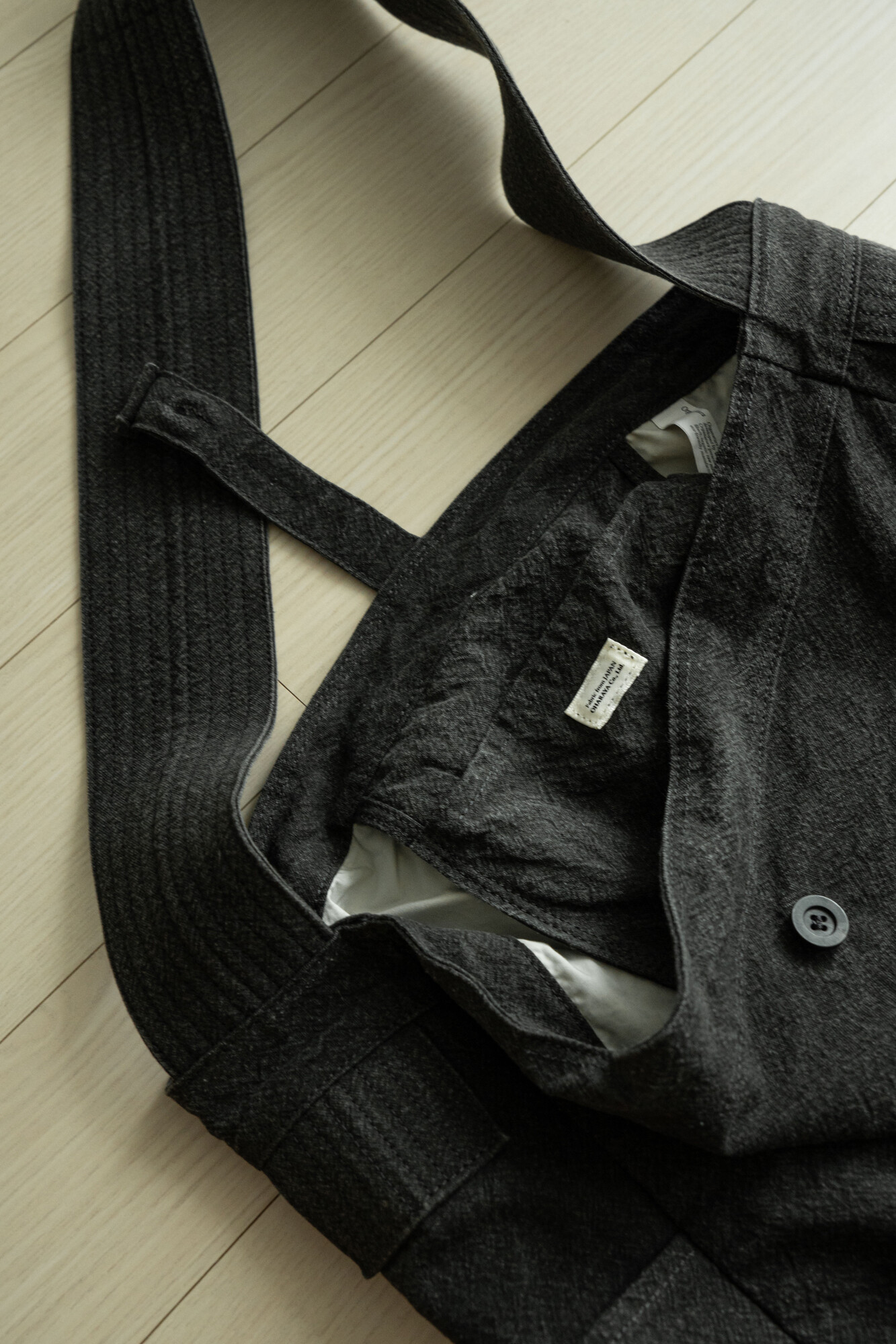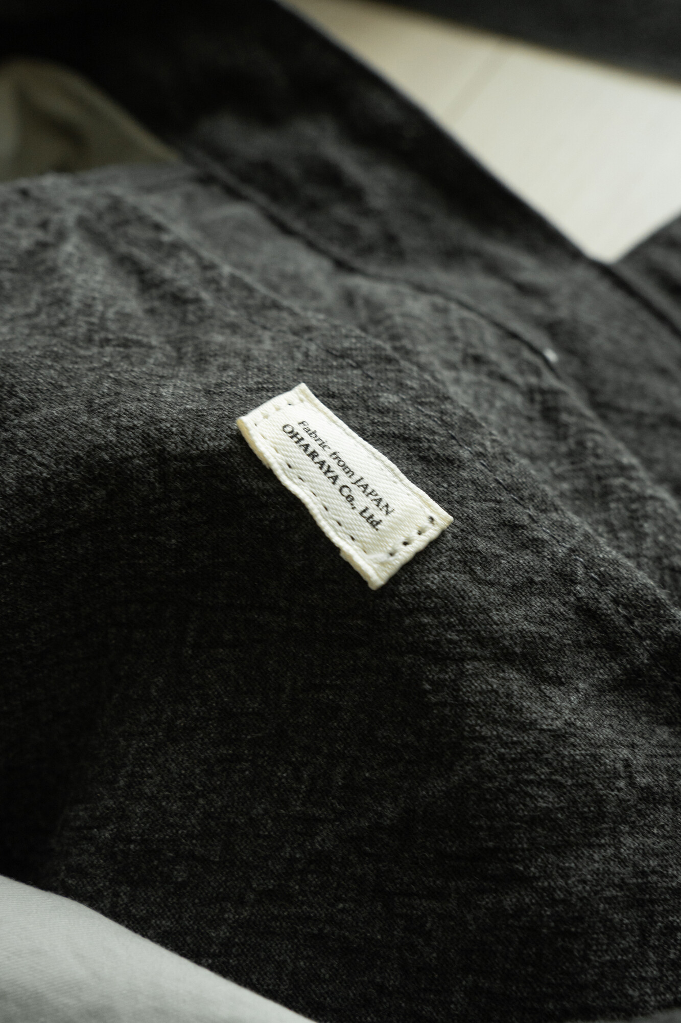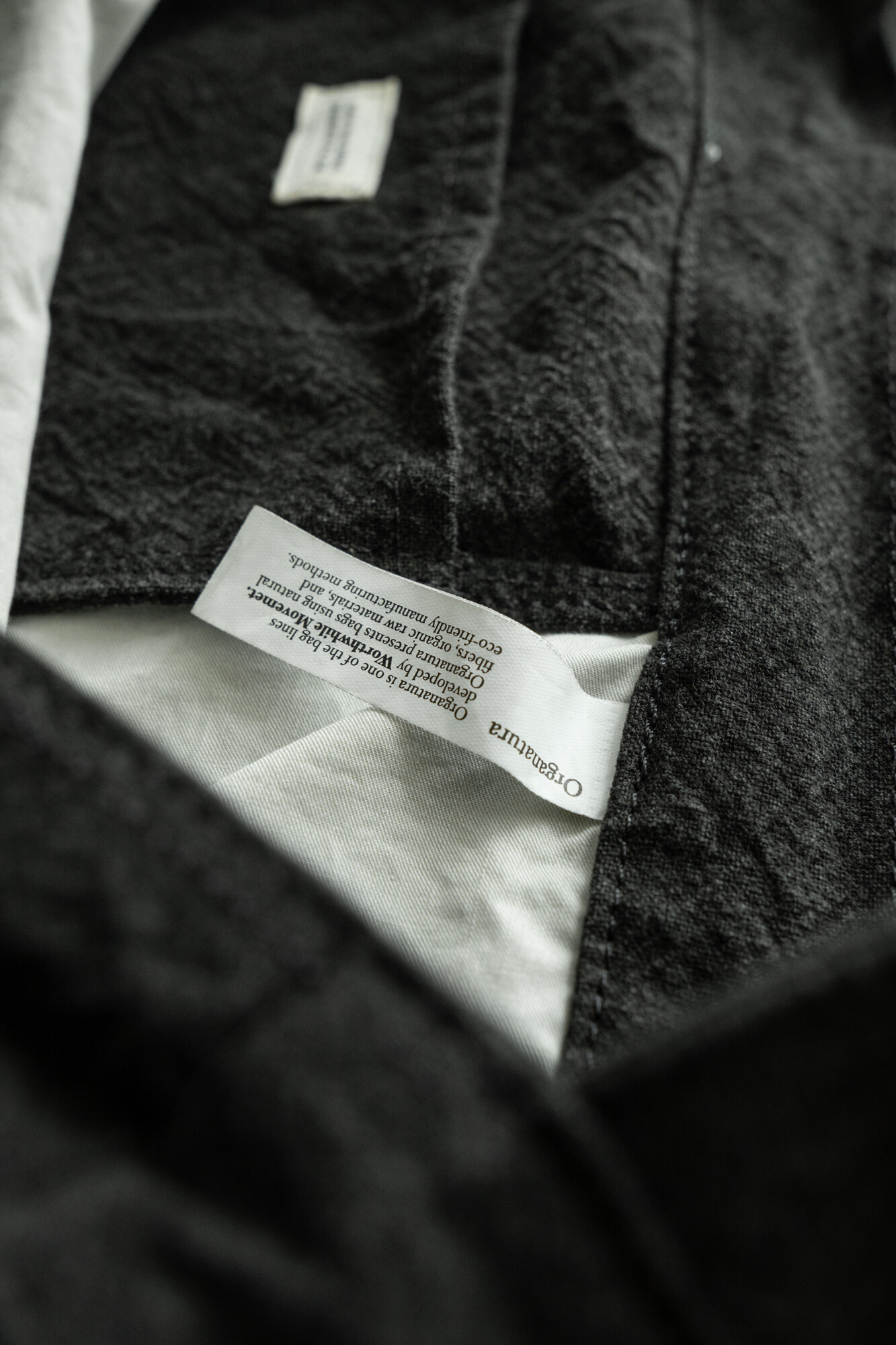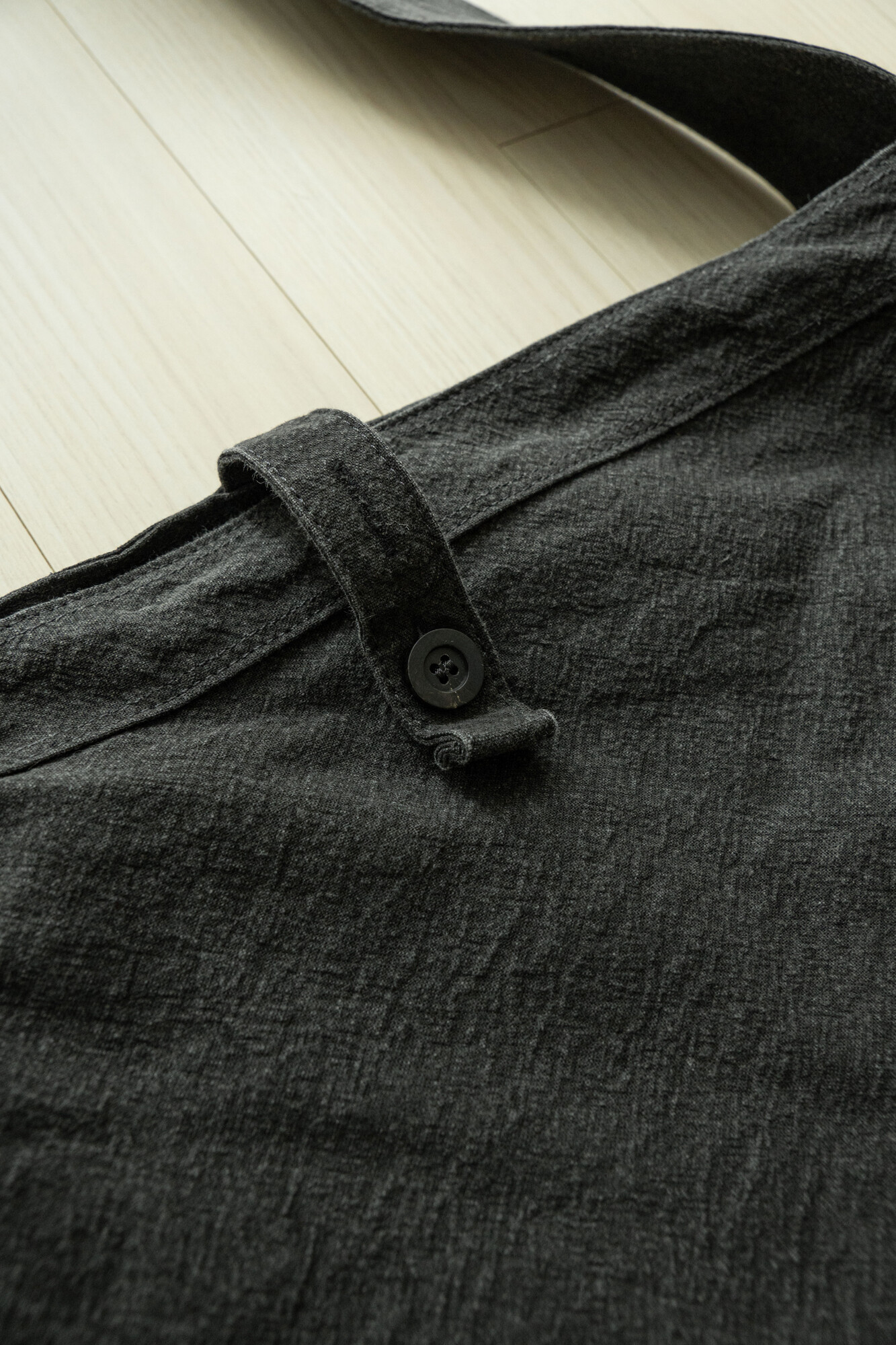 : Organatura 라인에서 소개하는 두번째 제품으로 Oharaya 社 의 면/마 혼용 원단으로 제작했습니다. 특히 [비장탄 숯 염색 (Binchotan dyed)]을 활용한 차콜/그레이 컬러에서는 짙은 먹색 계열의 묵직하고 차분한 톤을 확인하실수 있는데요. 비장탄은 고온 탄화된 참나무의 숯으로 일본 와카야마현이나 규슈 지방에서 주로 나오는 고급 백탄입니다. 매우 높은 온도에서 탄화되어 강도와 밀도가 높고 불순물이 적은게 특징입니다. 이러한 숯을 곱게 분쇄해 염액으로 우려낸 뒤 섬유에 반복적으로 침지 염색한 원단입니다. 매 염색 작업마다 동일한 컬러로 맞추기 어렵고 가먼트 워싱까지 진행되기 때문에 생산 차수와 각 개체별로 외관 상의 차이점이 생겨 하나뿐인 제품이 될 뿐 아니라 사용하면서 자연스러운 에이징의 매력을 느끼실 수 있습니다. 촘촘하게 봉제된 스트랩의 스티치와 천연 소뿔단추 잠금 디테일, 그리고 부드러운 감촉의 코튼 안감까지 전반적인 구성과 분위기를 통일시켰습니다. 오가내추라 라인의 특성에 맞게 간결한 실루엣과 심플한 디자인, 깊은 색감을 느끼실 수있습니다. 천연 염색과 원단의 슴슴한 멋을 경험해주시기 바랍니다.