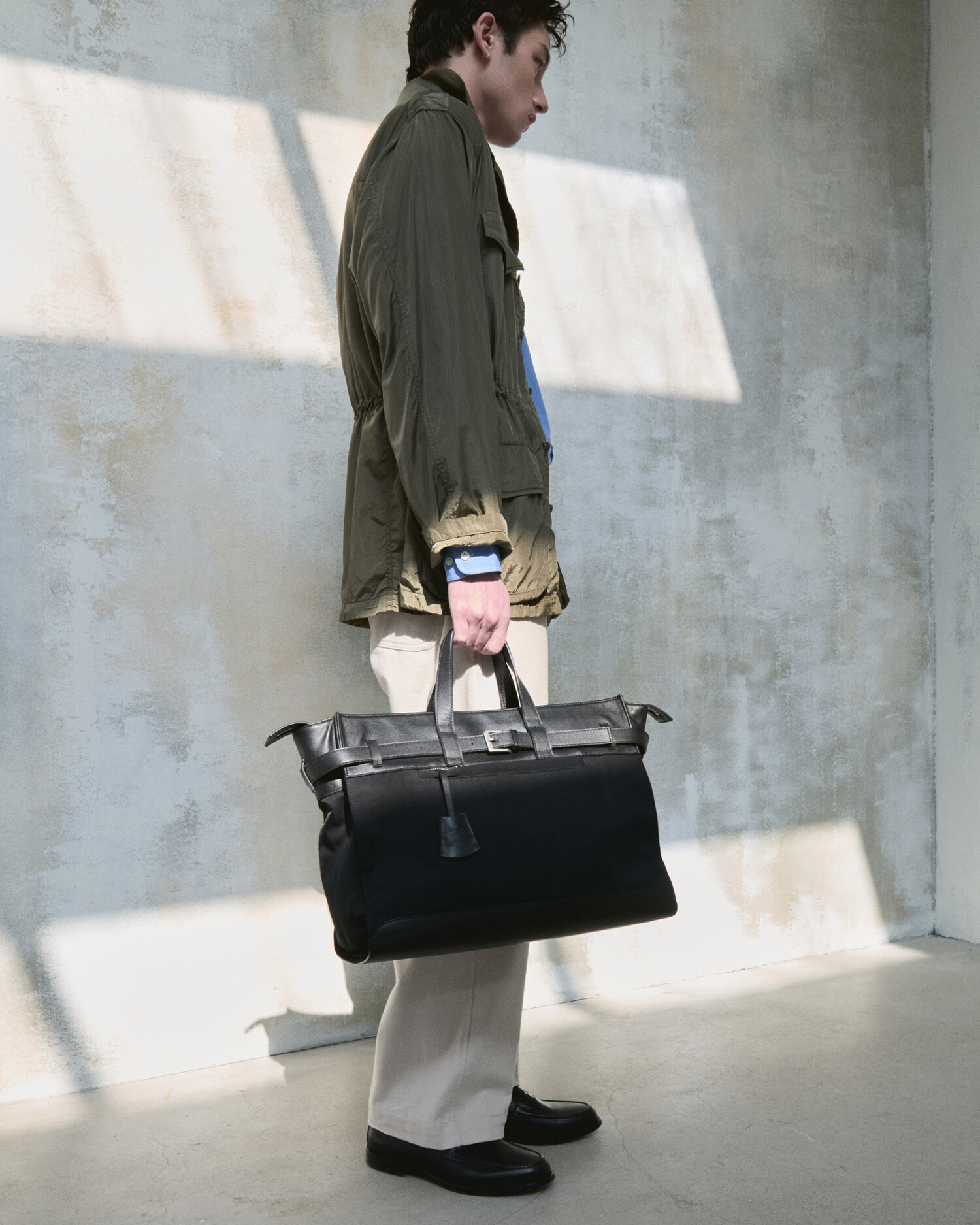 고급스럽고 클래식한 분위기의 터렛 백은 에르메스의 버킨백과 미군의 과거 메일 백(Mail bag)을 바탕으로 디자인했습니다. *에르메스(Hermes)의 버킨 백은 1984년 에르메스가 영국 배우 제인 버킨(Jane Birkin)을 위해 제작한 핸드백으로 브랜드의 상징적인 제품중 하나입니다. 고품질의 가죽과 장식을 사용하여 실용성과 우아함을 겸비하며 넉넉한 수납 공간과 독특한 플랩 구조 그리고 입구의 가죽 스트랩과 토글(잠금쇠)이 특징인 가방이죠. 반면 미군의 *메일 백(Mail bag)은 입구에 타원형의 O링을 여러개 배치하고 웨빙 벨트로 연결하여 밀봉하는 기능적인 입구 잠금 방식, 그리고 캔버스 소재와 가죽을 믹스한 원단이 특징입니다. 터렛백은 버킨백의 클래식한 실루엣에서 모티브를 얻어 직사각 형태의 바디를 만들고, 헤비트윌 나일론과 어울어지는 가죽 소재를 상단부와 바닥변에 사용하여 단단하게 보강을 진행했고 실루엣을 유지하도록 만들었습니다. 미감적으로 정교하고 우아하지만 사용감에 있어서 불편할 수 있는 자물쇠 타입의 토글대신 실용적이고 모던한 버클 벨트를 사용하여 입구의 실루엣을 조절하여 가방 형태를 바꿀 수 있습니다. 또한 지퍼가 오픈된 상태에서도 큰 소지품의 이탈을 일정 부분 막아주는 역할을 합니다. 광택감이 있는 부드러운 슬라이딩의 양날 지퍼가 적용된 입구 부분은 개폐 범위를 가로 폭 사이즈보다 넓게 만들어 실용적인 부분을 고려하였고, 지퍼의 마감도 모두 가죽으로 진행하여 고급스러운 균형감을 유지했습니다. 전면부 포켓에는 키링을 연결할 수 있는 O링 키체인 장식이 내장되어 있으며, 바디에는 은은한 광택감이 매력적인 헤비 트윌 나일론을 적용했고 형태감 유지를 위해 적절한 보강재를 삽입했습니다. 이너 포켓들에는 히든 마그넷을 통해 간편히 입구를 닫을 수 있도록 했으며 레더 소재로 된 고급 크로스 스트랩을 동봉해드리기 때문에 상황에 맞게 크로스 백으로 연출할 수 있습니다.
