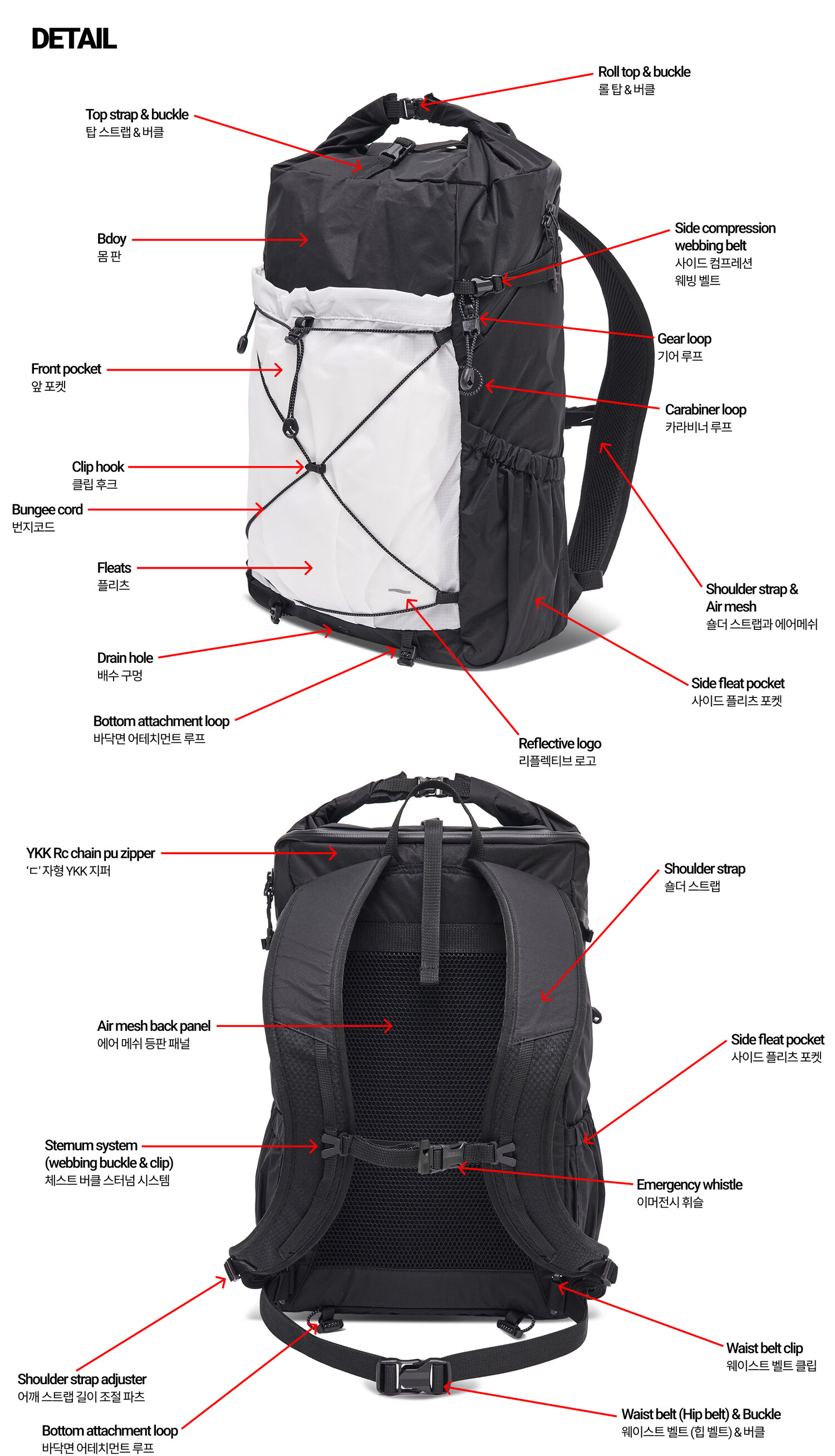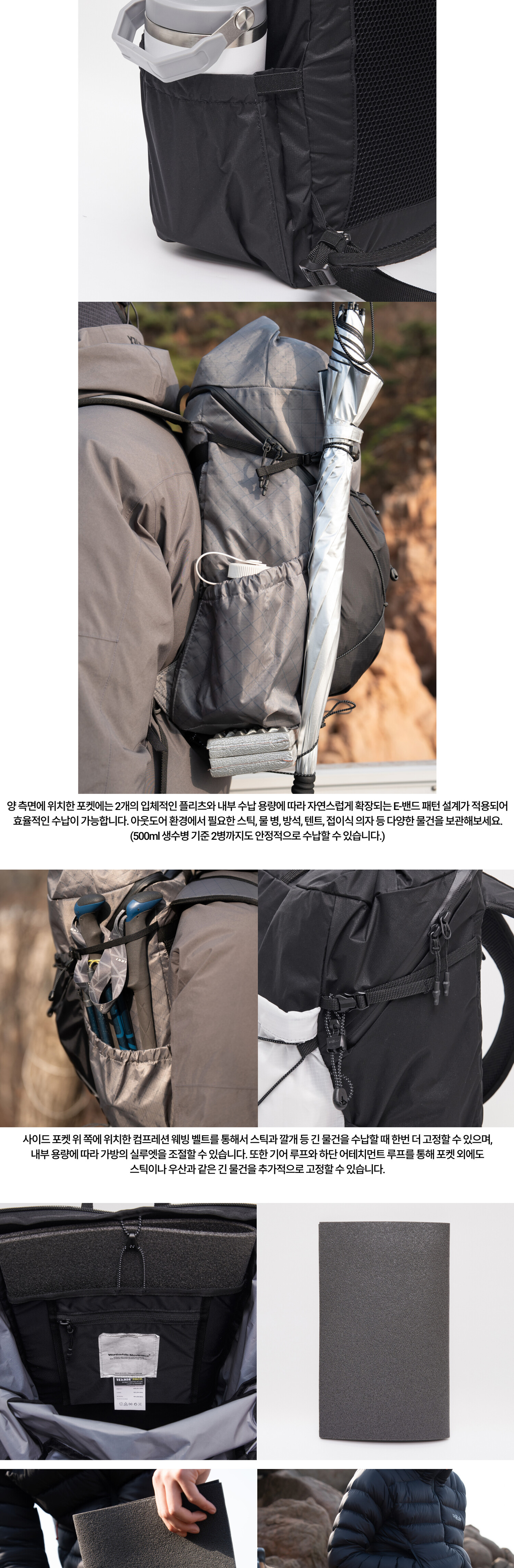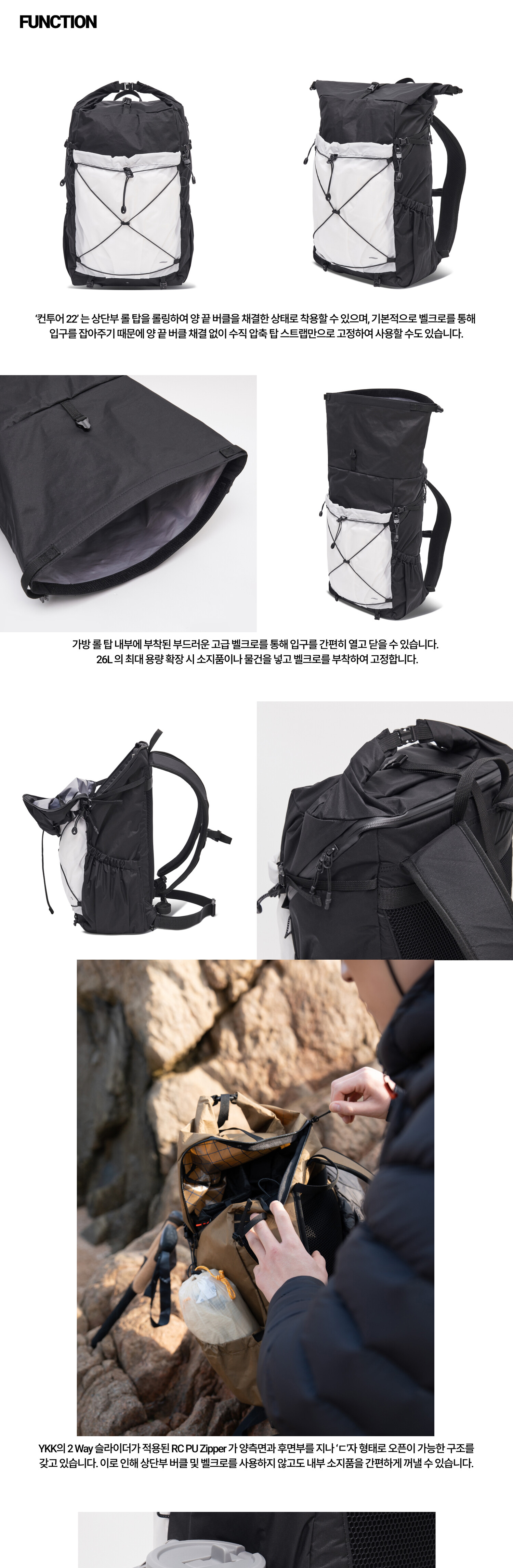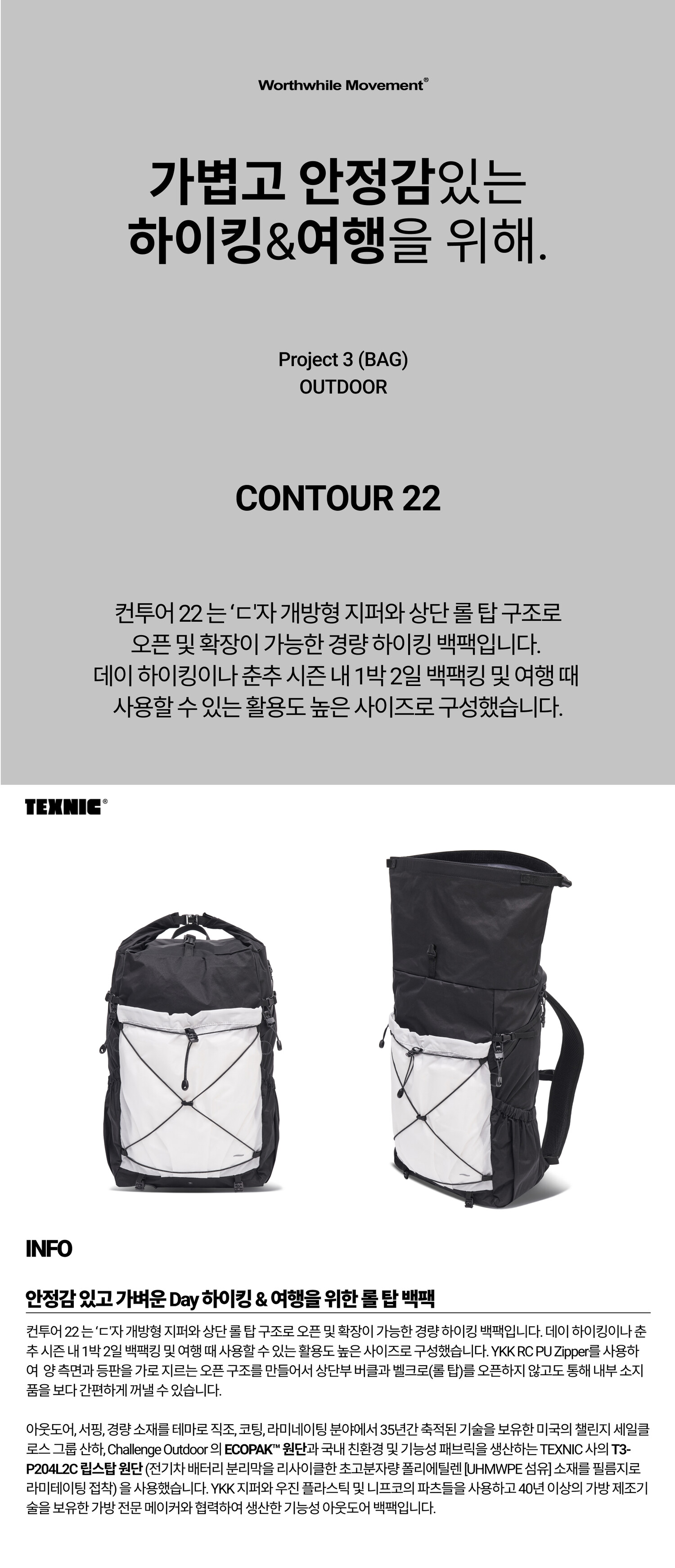 컨투어 22 는 ‘ㄷ'자 개방형 지퍼와 상단 롤 탑 구조로 오픈 및 확장이 가능한 경량 하이킹 백팩입니다. 데이 하이킹이나 춘추 시즌 내 1박 2일 백팩킹 및 여행 때 사용할 수 있는 활용도 높은 사이즈로 구성했습니다. YKK RC PU Zipper를 사용하여 양 측면과 등판을 가로 지르는 오픈 구조를 만들어서 상단부 버클과 벨크로(롤 탑)를 오픈하지 않고도 통해 내부 소지품을 보다 간편하게 꺼낼 수 있습니다. 국내 친환경 및 기능성 패브릭을 생산하는 Texnic 사의 리사이클 P240P 립스탑 원단 (전기차 배터리 분리막을 리사이클한 초고분자량 폴리에틸렌 [UHMWPE 섬유] 소재를 필름지로 라미테이팅 접착) 을 사용했고 부자재는 YKK 지퍼 및 우진 플라스틱, 니프코의 파츠들을 적용했습니다. 40년 이상의 가방 제조기술을 보유한 가방 전문 메이커와 협력하여 생산한 기능성 아웃도어 백팩입니다.