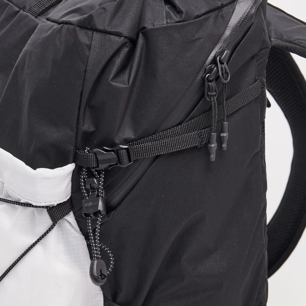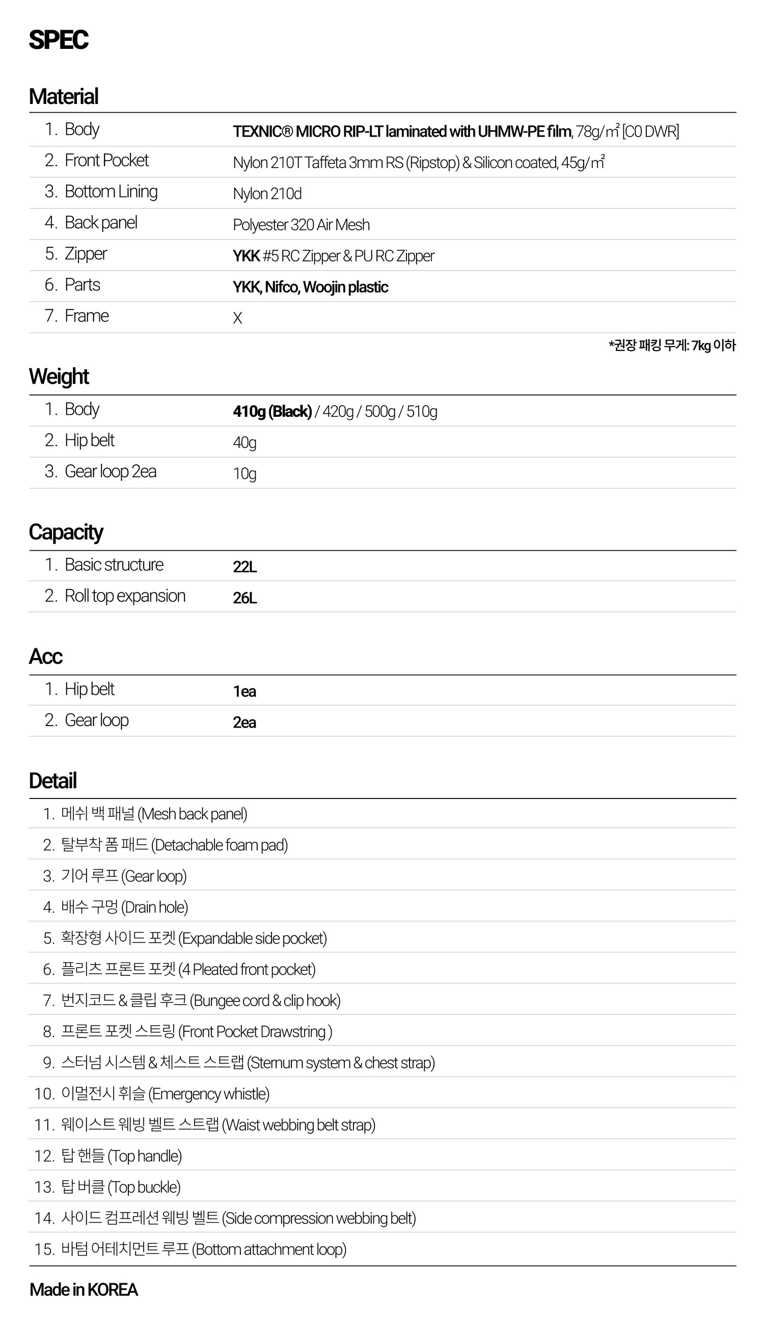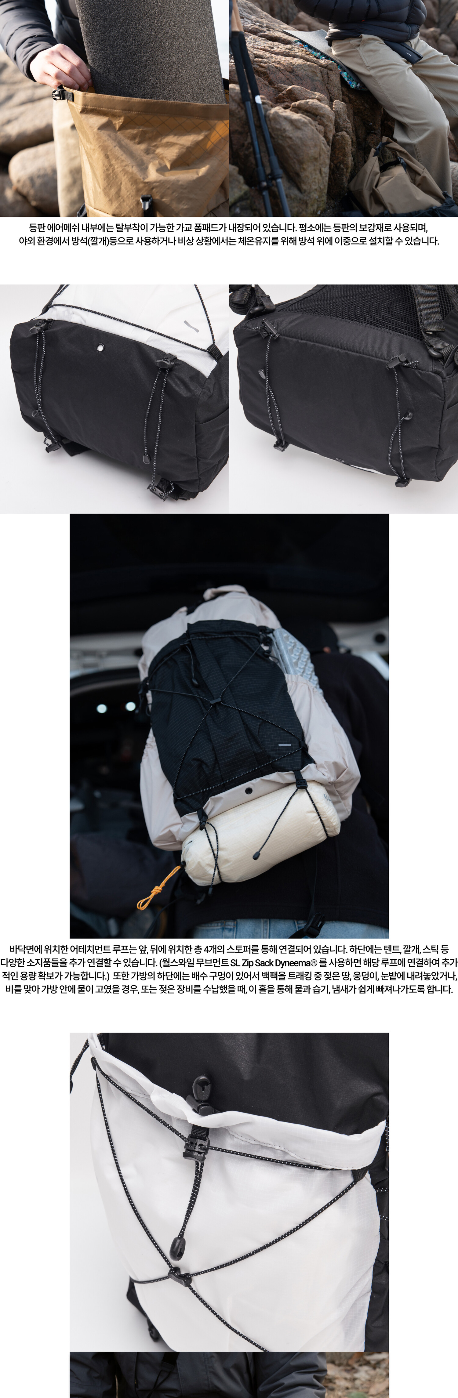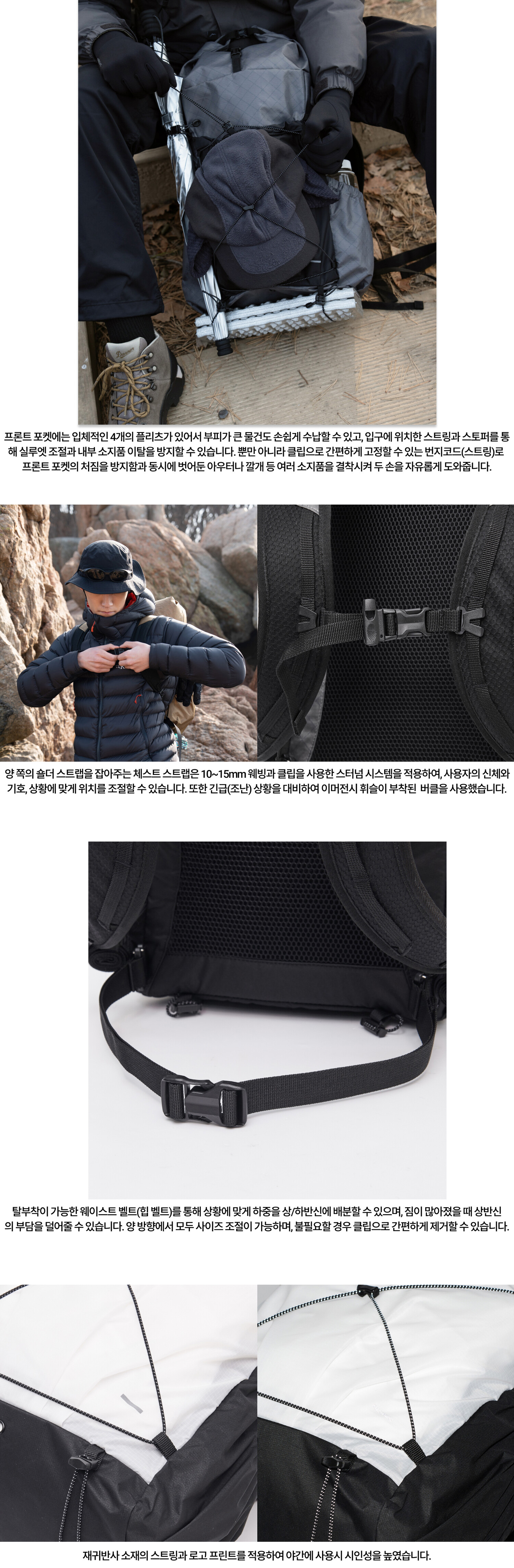 컨투어 22 는 ‘ㄷ'자 개방형 지퍼와 상단 롤 탑 구조로 오픈 및 확장이 가능한 경량 하이킹 백팩입니다. 데이 하이킹이나 춘추 시즌 내 1박 2일 백팩킹 및 여행 때 사용할 수 있는 활용도 높은 사이즈로 구성했습니다. YKK RC PU Zipper를 사용하여 양 측면과 등판을 가로 지르는 오픈 구조를 만들어서 상단부 버클과 벨크로(롤 탑)를 오픈하지 않고도 통해 내부 소지품을 보다 간편하게 꺼낼 수 있습니다. 국내 친환경 및 기능성 패브릭을 생산하는 Texnic 사의 리사이클 P240P 립스탑 원단 (전기차 배터리 분리막을 리사이클한 초고분자량 폴리에틸렌 [UHMWPE 섬유] 소재를 필름지로 라미테이팅 접착) 을 사용했고 부자재는 YKK 지퍼 및 우진 플라스틱, 니프코의 파츠들을 적용했습니다. 40년 이상의 가방 제조기술을 보유한 가방 전문 메이커와 협력하여 생산한 기능성 아웃도어 백팩입니다.