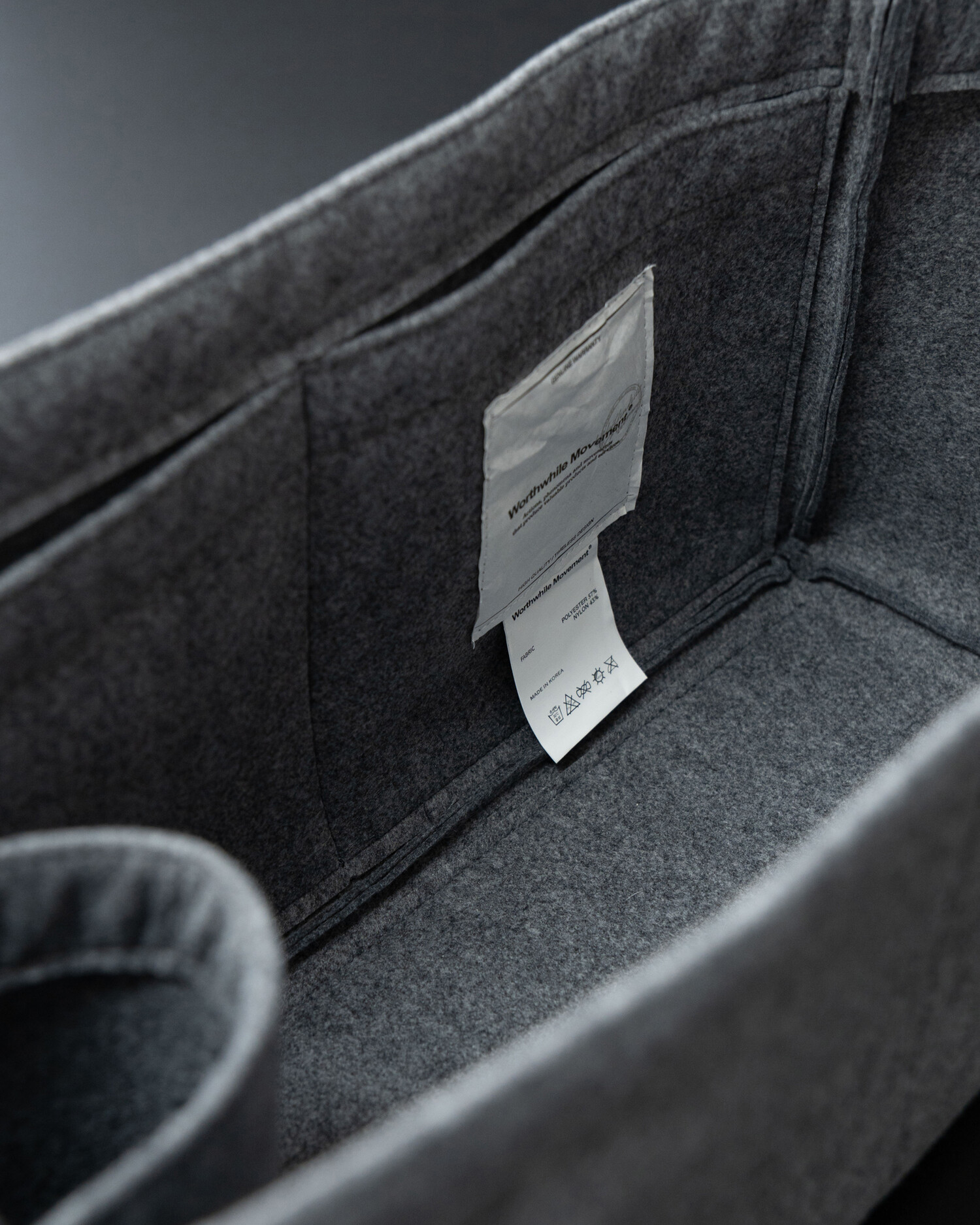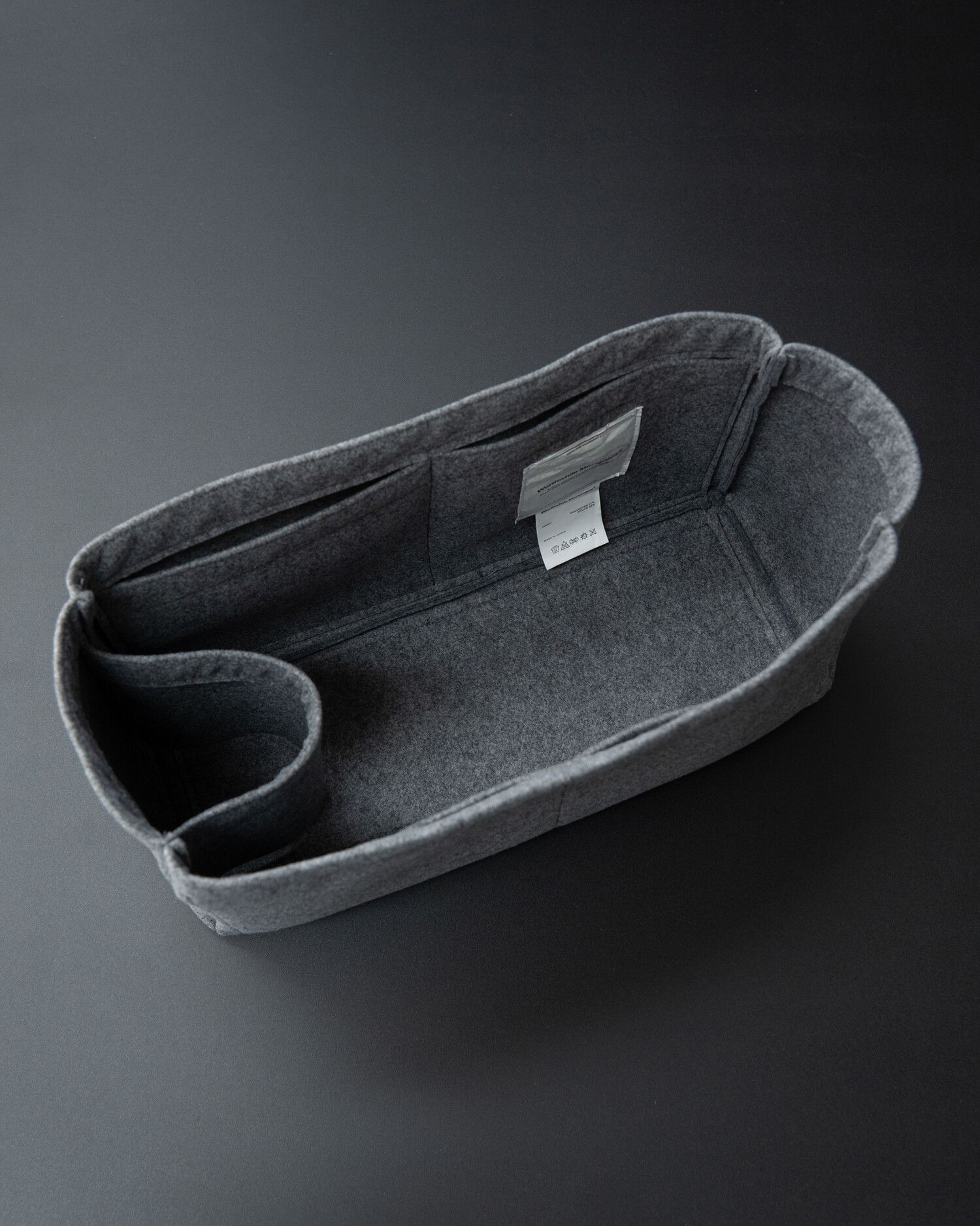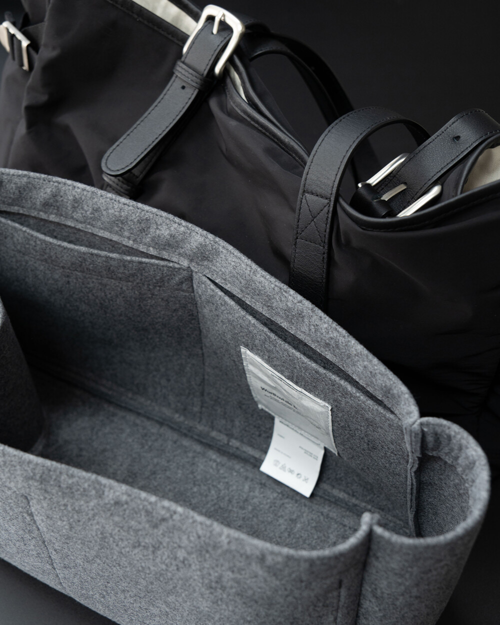 609 스토리 토트백 내부에 넣어서 사용하실 수 있는 이너백입니다. 두께감이 있는 ArtiFEL® M20 (2mm) 펠트지를 사용하여 가방의 실루엣 형태 유지에 도움을 주며, 내부 소지품을 보다 안전하게 보호하실 수 있습니다. 내부에는 플랫한 4개의 포켓과 텀블러를 수납하실 수 있는 1개의 텀블러 포켓을 배치했습니다.