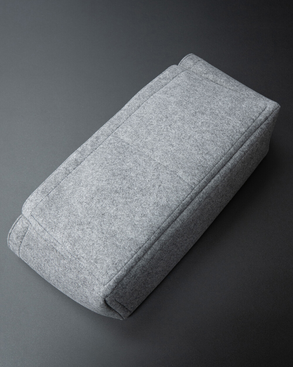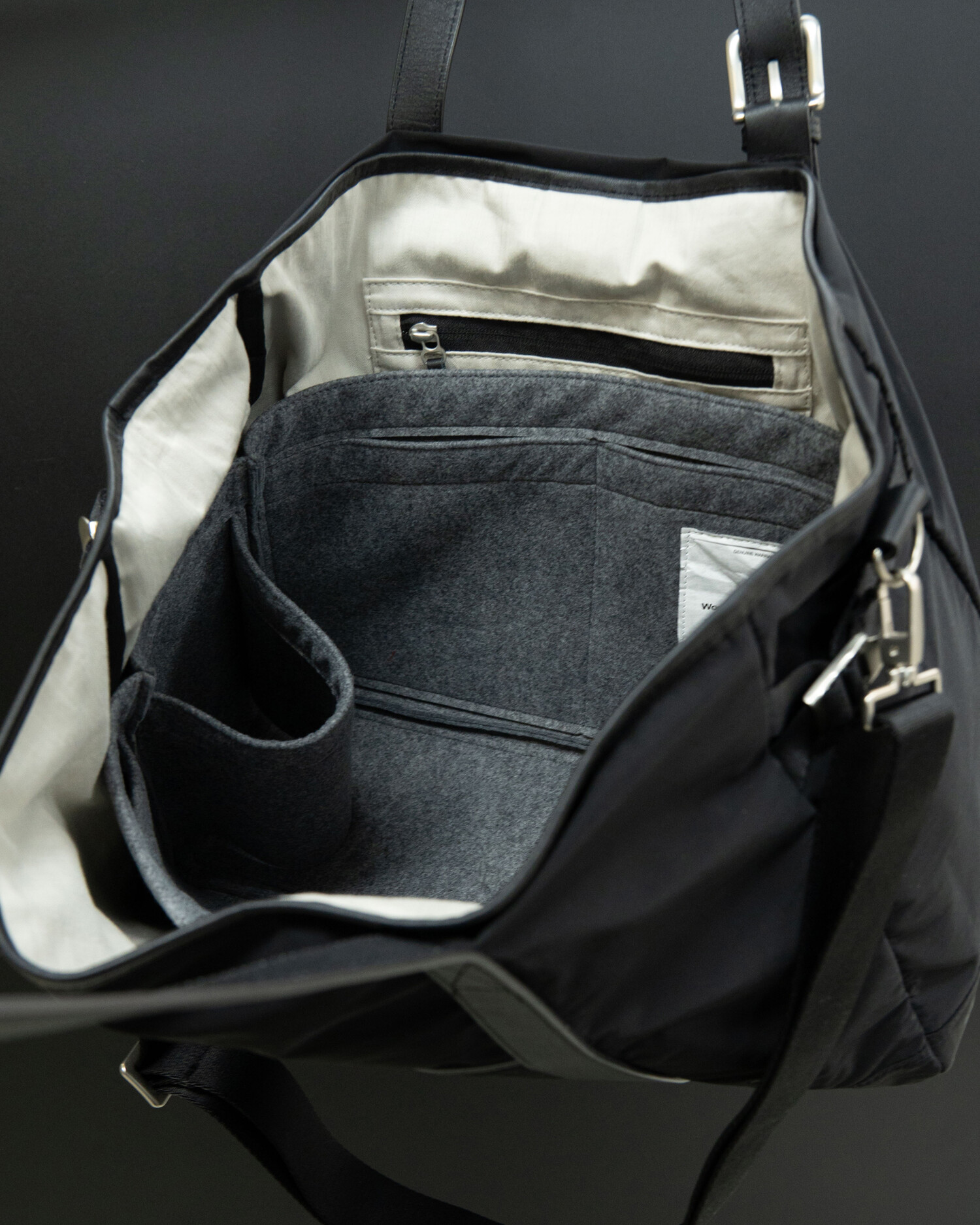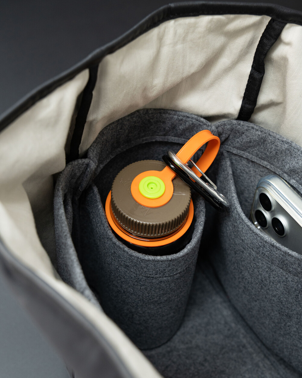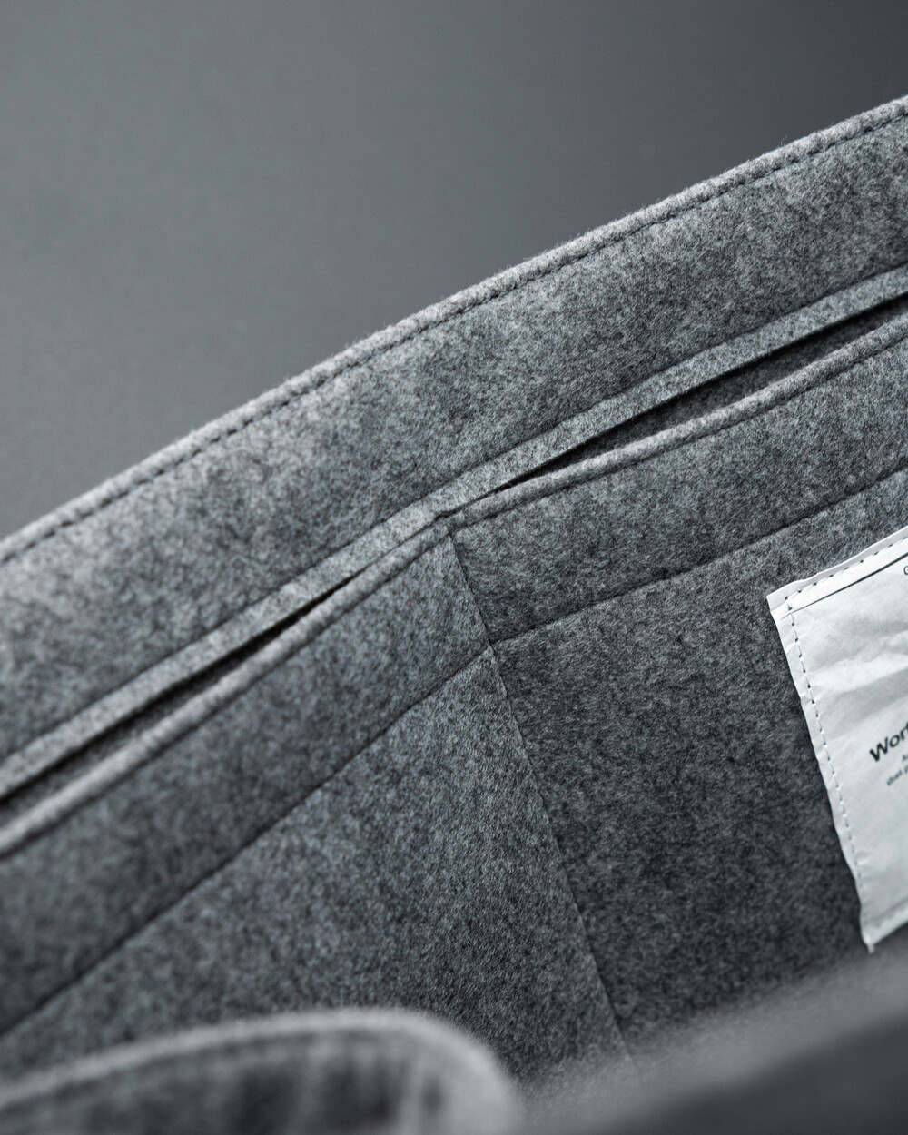 609 스토리 토트백 내부에 넣어서 사용하실 수 있는 이너백입니다. 두께감이 있는 ArtiFEL® M20 (2mm) 펠트지를 사용하여 가방의 실루엣 형태 유지에 도움을 주며, 내부 소지품을 보다 안전하게 보호하실 수 있습니다. 내부에는 플랫한 4개의 포켓과 텀블러를 수납하실 수 있는 1개의 텀블러 포켓을 배치했습니다.