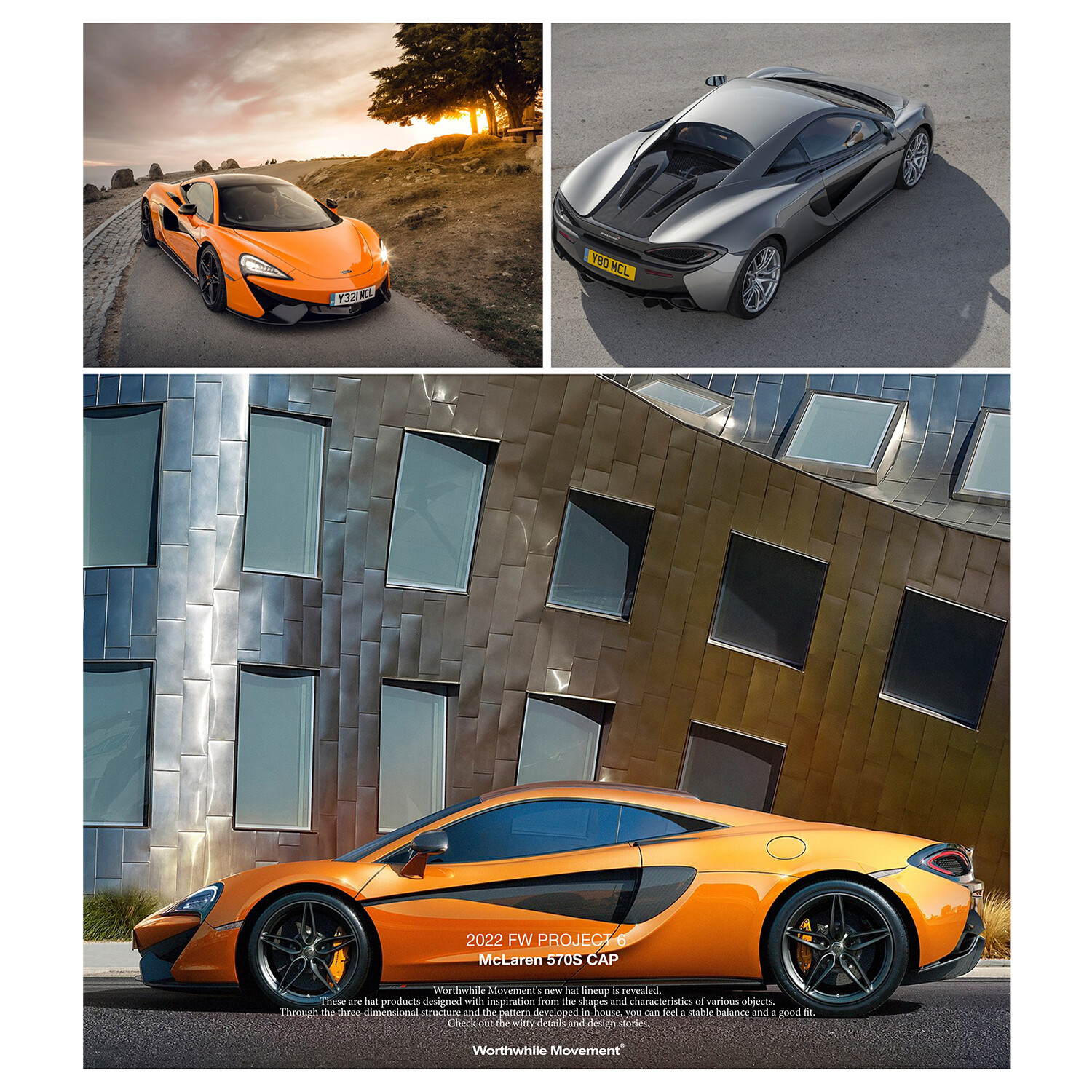 ✔︎ 영국의 스포츠카 제조사 맥라렌이 2015년 뉴욕 오토쇼에서 처음 공개한 McLaren(맥라렌) 570s 모델에서 디자인적 영감을 받은 제품입니다. 전면부에서 상단으로 넘어가는 곡선 형태와 절개 라인은 보닛의 모양을 따라 디자인했습니다. 일반적인 캠프캡 형태와 달리 두상을 좀 더 감싸는 형태를 띠게 패턴 수정과 드레이핑을 거듭하여 만들었습니다. 570S모델에서 A필러부터 C필러로 넘어가는 절묘한 곡선 라인은 모자의 측면쪽 3개의 자수 아일렛으로 표현하였고 특히 버터플라이 도어쪽에 위치한 블랙 컬러의 유려한 측면 흡기 디자인을 DTY 메쉬 소재로 표현하여 벤틸레이션 효과를 주는 것과 동시에 디자인적인 의미도 강조했습니다. 또한 메쉬 절개의 끝부분에는 바텍으로 단단히 고정하면서 헤드라이트 위치에 포인트를 주었습니다.
