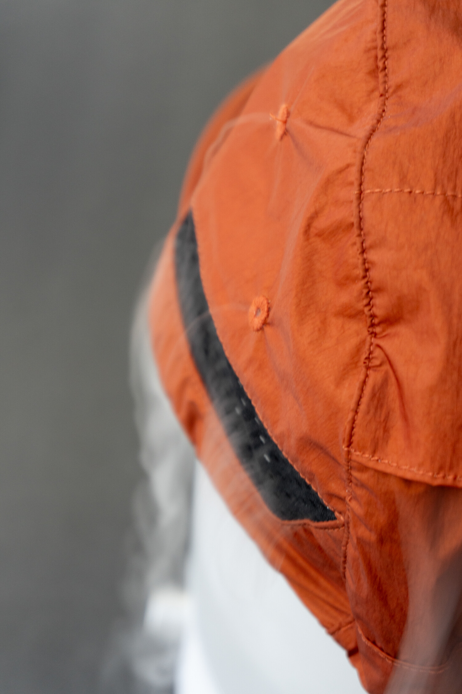 운전자 뒤에 위치한 트윈 터보차저 엔진은 내부 메쉬원단과 멤브레인 코팅 원단을 2중으로 배치한 뒤 절개를 내어 벤틸레이션 디테일로 표현하였고 상단에 한 줄 스티치로 라인을 만들어 벌어지지 않게 고정했습니다. 후면부에는 월스와일 무브먼트 캡 라인의 시그니처 디테일인 제원단 행루프가 들어가 있고, E-스트링을 사용하여 간편하게 사이즈 조절이 가능합니다. 스트링은 Nifco社 스토퍼와 Woojin plastic社의 코드앤드를 사용하여 견고하게 마감했습니다.내부에는 쿨론 스웻밴드가 적용되어 쾌적하게 피팅이 가능합니다. 메인 원단으로는 PU 코팅된 멤브레인 나일론 원단을 사용하여 굉장히 가볍고 부드러울 뿐 아니라 방수, 방풍, 투습 등에 효과적입니다. 디자이너의 오랜 고민과 많은 샘플 수정이 들어간 제품이며, 아웃도어 브랜드 모자 제작과 일본 수출 등을 진행하는 모자 전문공장에서 숙련된 햇 메이커에 의해 제작되었습니다.