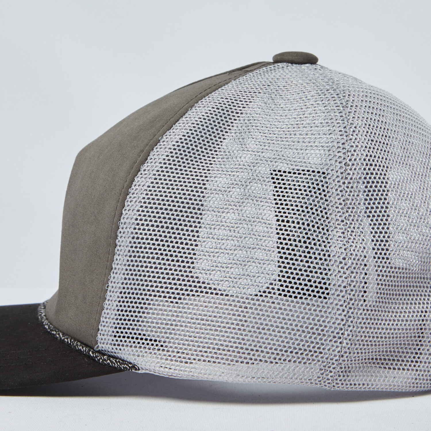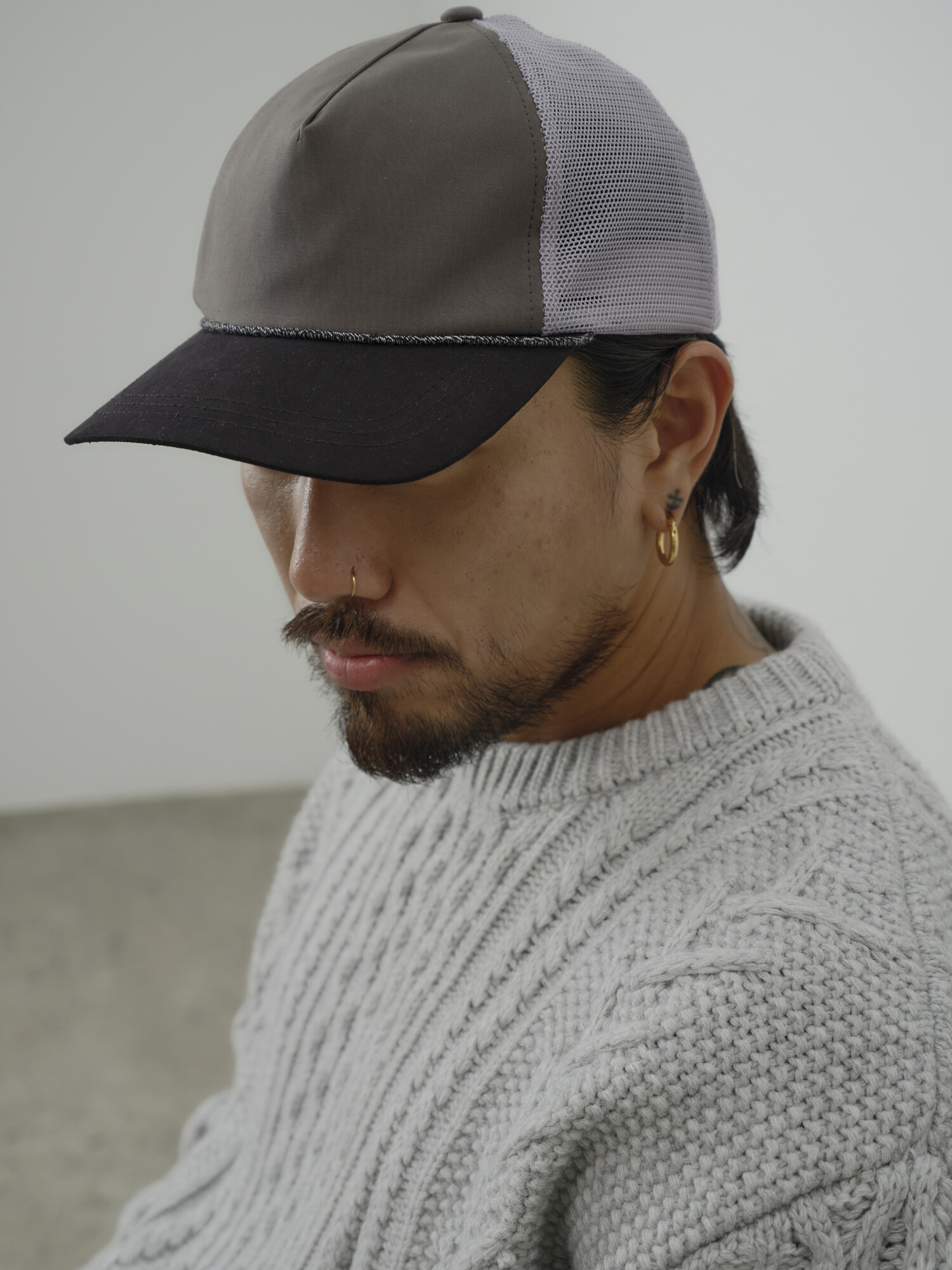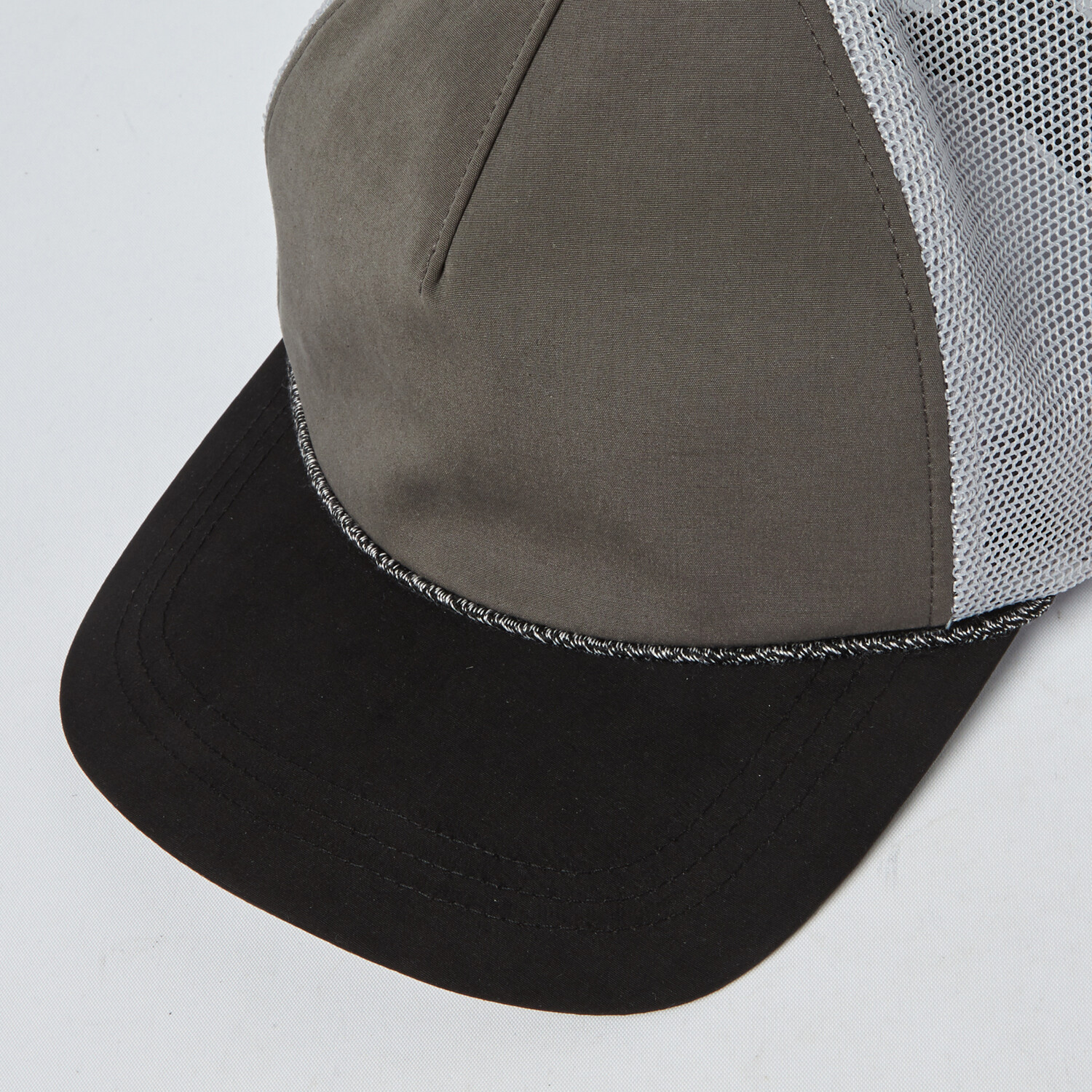 트러커 캡에서 흔하게 사용되는 두툼한 네오프렌 소재나 높은 모자의 패턴 대신 소프트한 원단을 적용하고 두상을 감싸는 형태의 제품으로 제작했습니다. 제품의 주요 포인트가 되는 챙 위의 스트링은 일본에서 수입한 멜란지 엘라스틱 스트링으로 빈티지하고 유니크한 질감과 디자인특징입니다. 헤드의 전면부는 피치 가공된 NPC교직 원단과 적절한 두께의 심지를 함께 사용하였고, 후면에는 유연한 메쉬 원단을 사용하여 전체적은 부드러운 터치감과 안정감있고 편안한 착용감을 느끼실 수 있습니다. 여유로운 길이의 리얼 레더 밴드와 흑무광(또는 황동)버클을 통해 사이즈를 조절할 수 있고, 56호~62호까지 폭넓은 사이즈를 커버합니다.