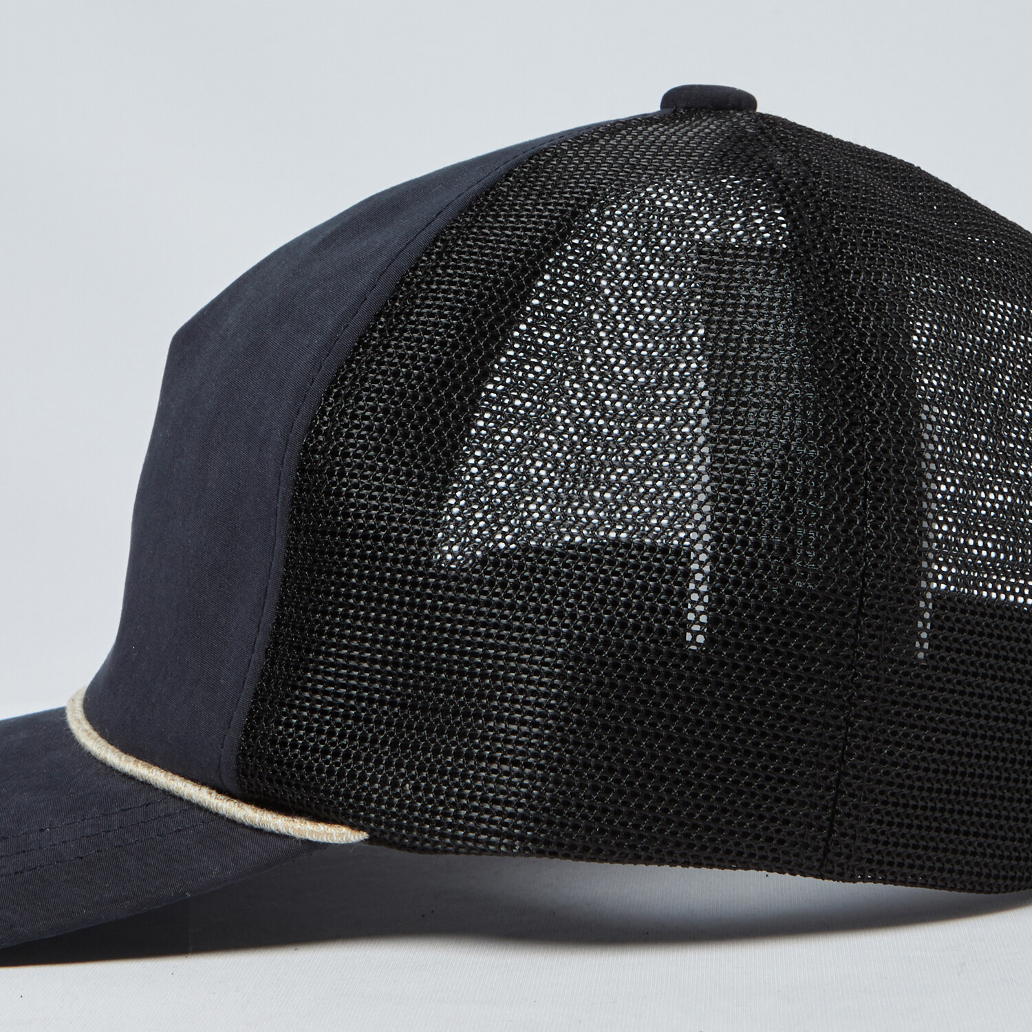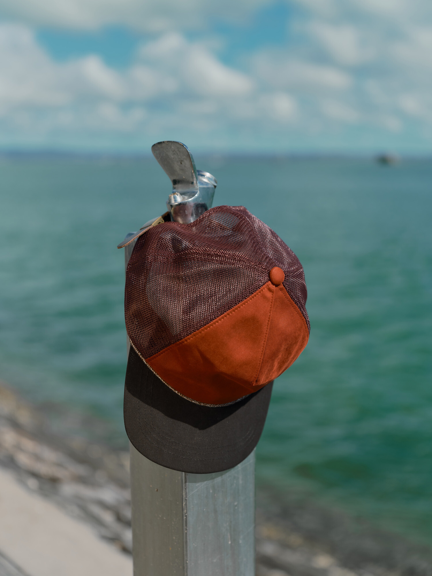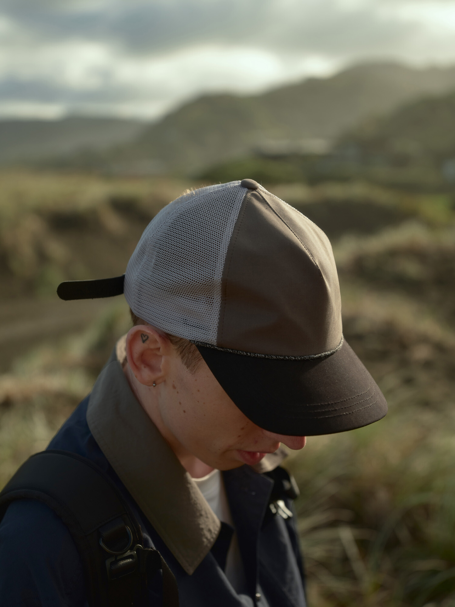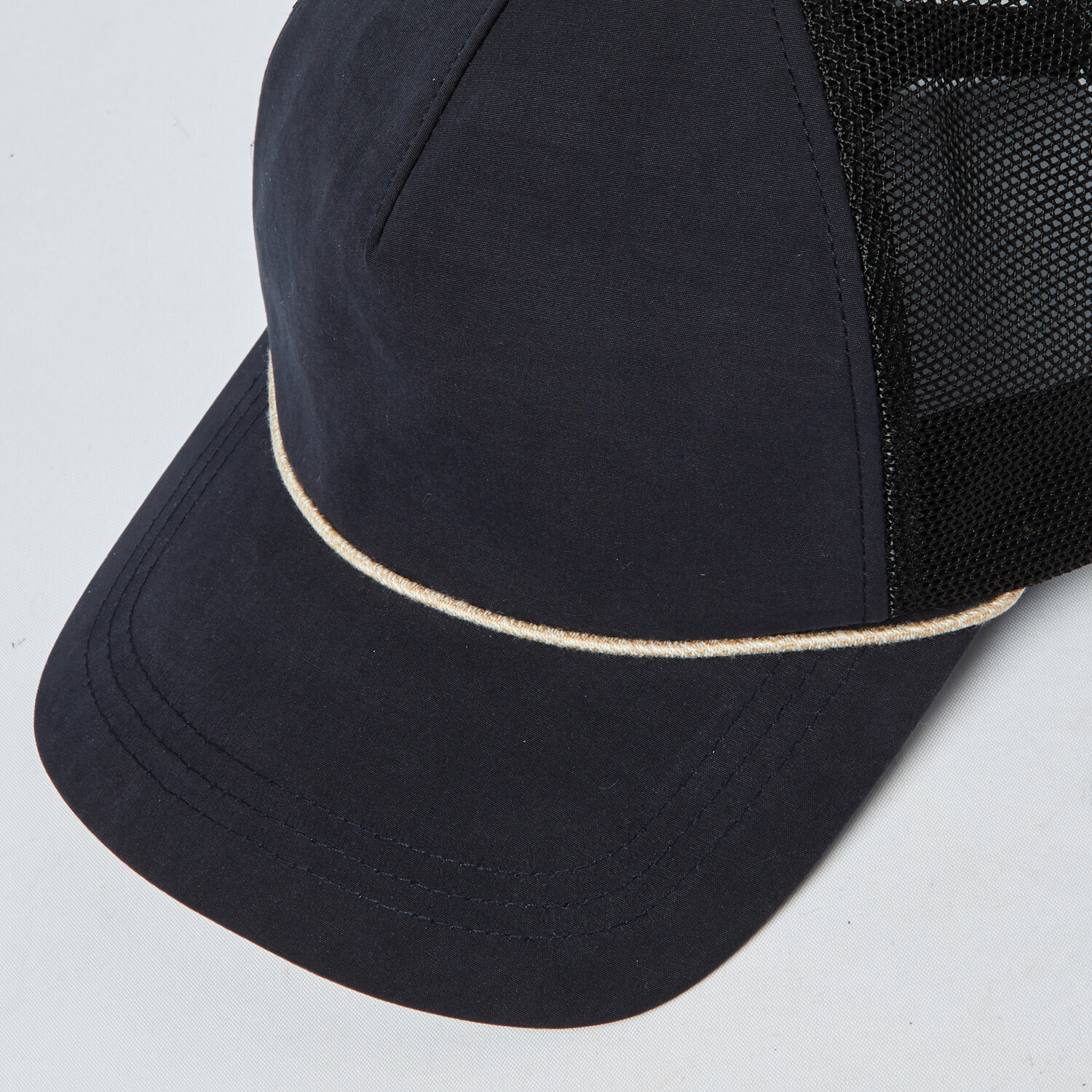 트러커 캡에서 흔하게 사용되는 두툼한 네오프렌 소재나 높은 모자의 패턴 대신 소프트한 원단을 적용하고 두상을 감싸는 형태의 제품으로 제작했습니다. 제품의 주요 포인트가 되는 챙 위의 스트링은 일본에서 수입한 멜란지 엘라스틱 스트링으로 빈티지하고 유니크한 질감과 디자인특징입니다. 헤드의 전면부는 피치 가공된 NPC교직 원단과 적절한 두께의 심지를 함께 사용하였고, 후면에는 유연한 메쉬 원단을 사용하여 전체적은 부드러운 터치감과 안정감있고 편안한 착용감을 느끼실 수 있습니다. 여유로운 길이의 리얼 레더 밴드와 흑무광(또는 황동)버클을 통해 사이즈를 조절할 수 있고, 56호~62호까지 폭넓은 사이즈를 커버합니다.