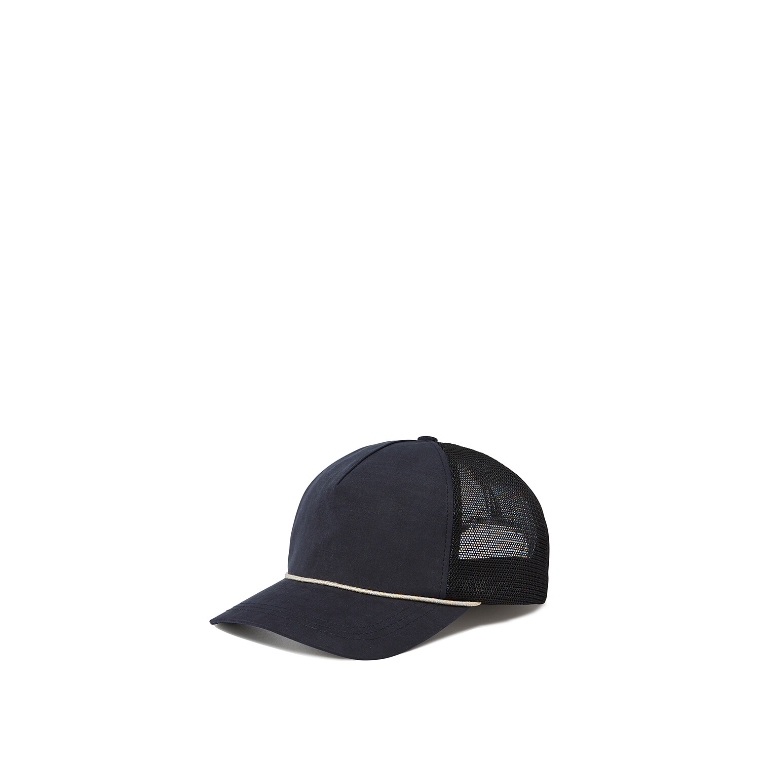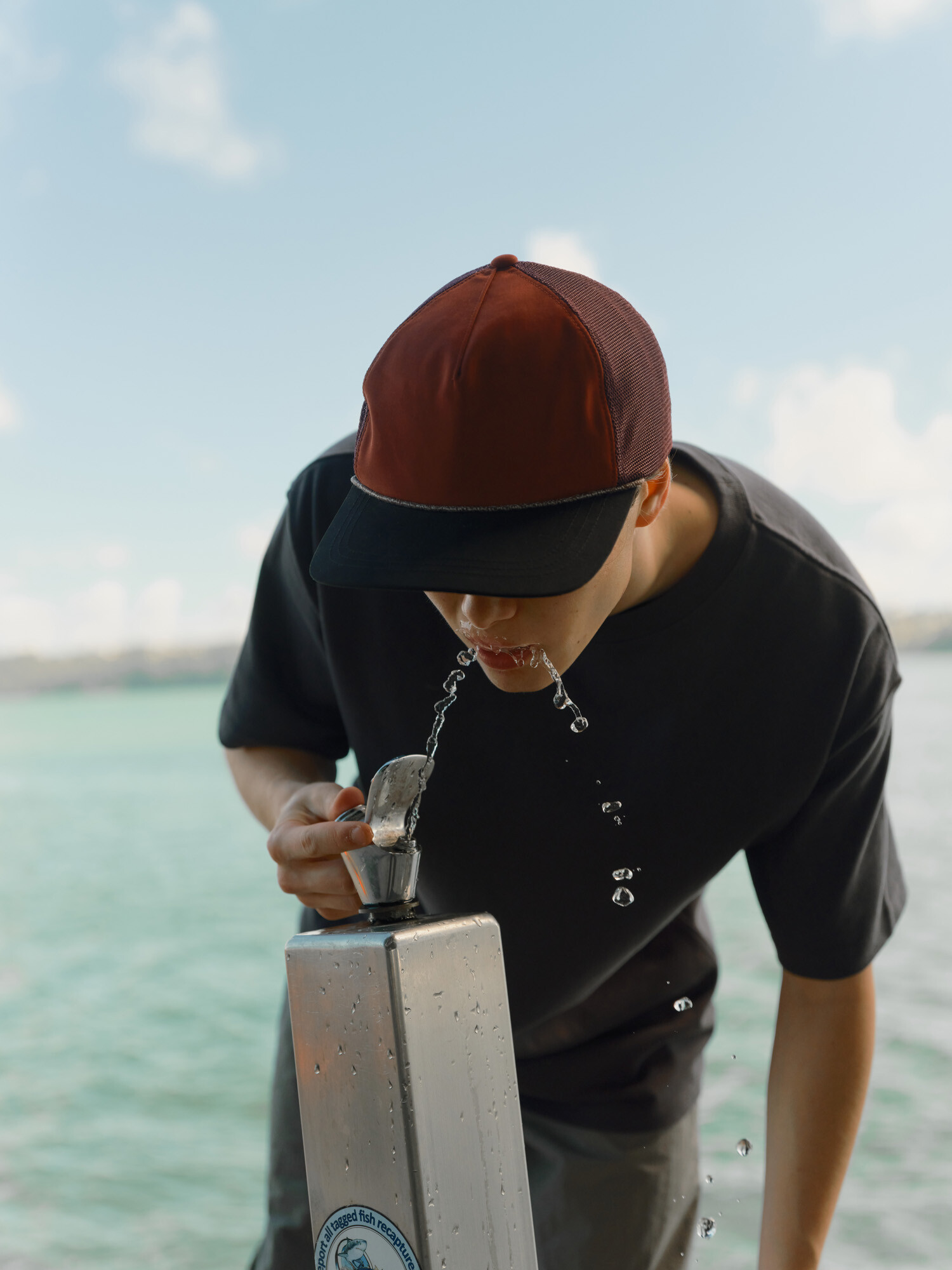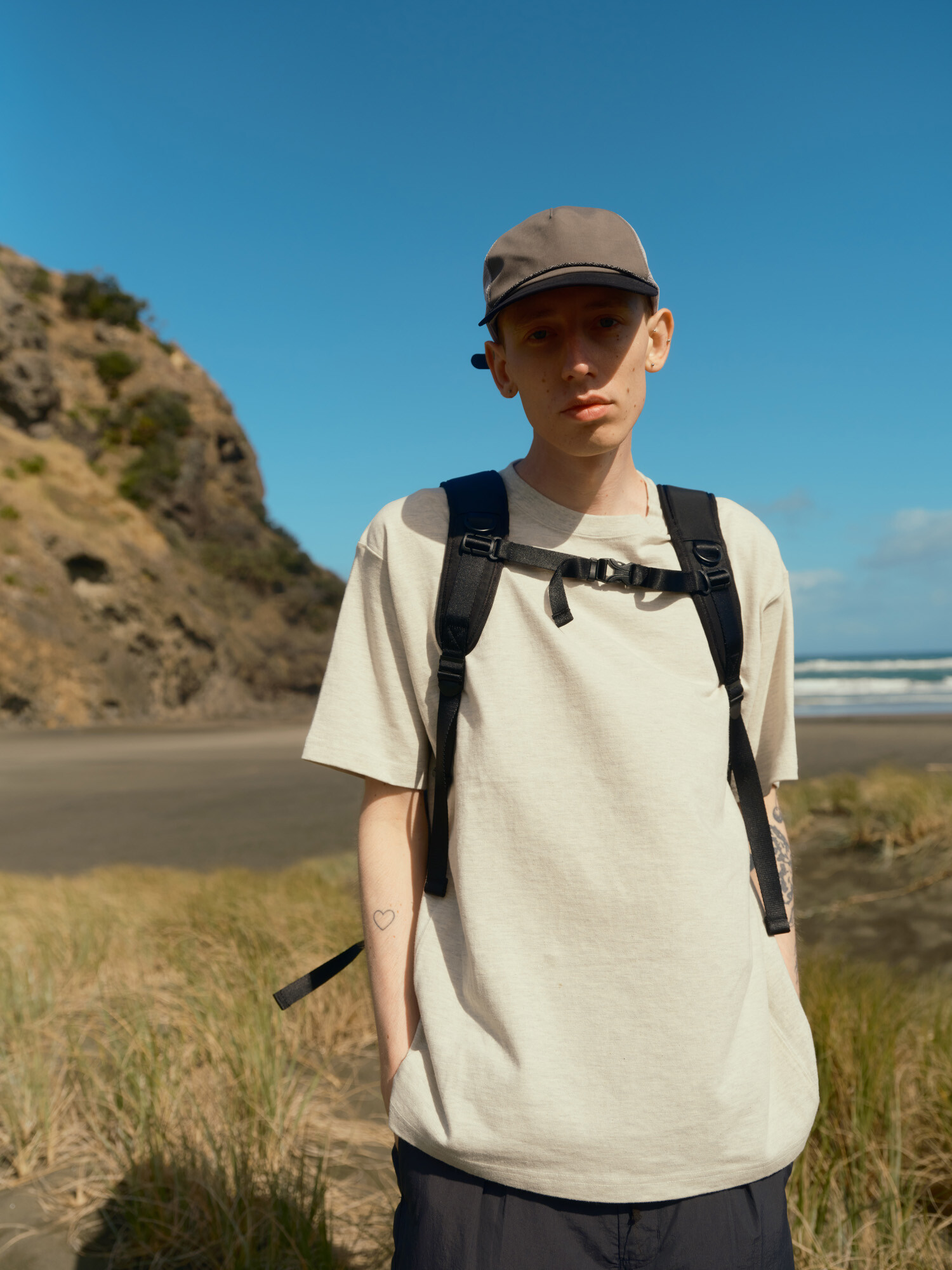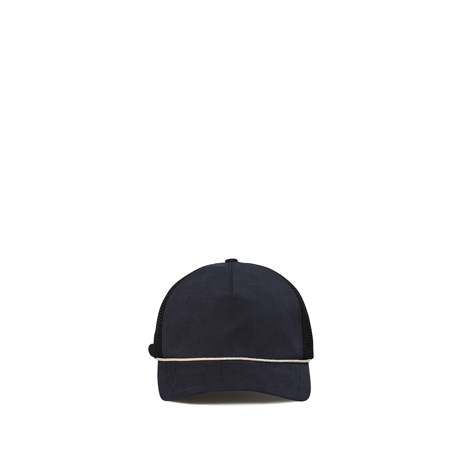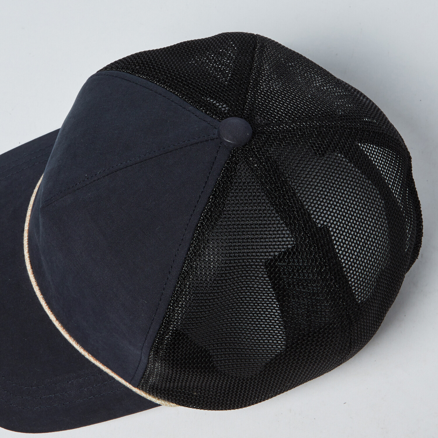 트러커 캡에서 흔하게 사용되는 두툼한 네오프렌 소재나 높은 모자의 패턴 대신 소프트한 원단을 적용하고 두상을 감싸는 형태의 제품으로 제작했습니다. 제품의 주요 포인트가 되는 챙 위의 스트링은 일본에서 수입한 멜란지 엘라스틱 스트링으로 빈티지하고 유니크한 질감과 디자인특징입니다. 헤드의 전면부는 피치 가공된 NPC교직 원단과 적절한 두께의 심지를 함께 사용하였고, 후면에는 유연한 메쉬 원단을 사용하여 전체적은 부드러운 터치감과 안정감있고 편안한 착용감을 느끼실 수 있습니다. 여유로운 길이의 리얼 레더 밴드와 흑무광(또는 황동)버클을 통해 사이즈를 조절할 수 있고, 56호~62호까지 폭넓은 사이즈를 커버합니다.