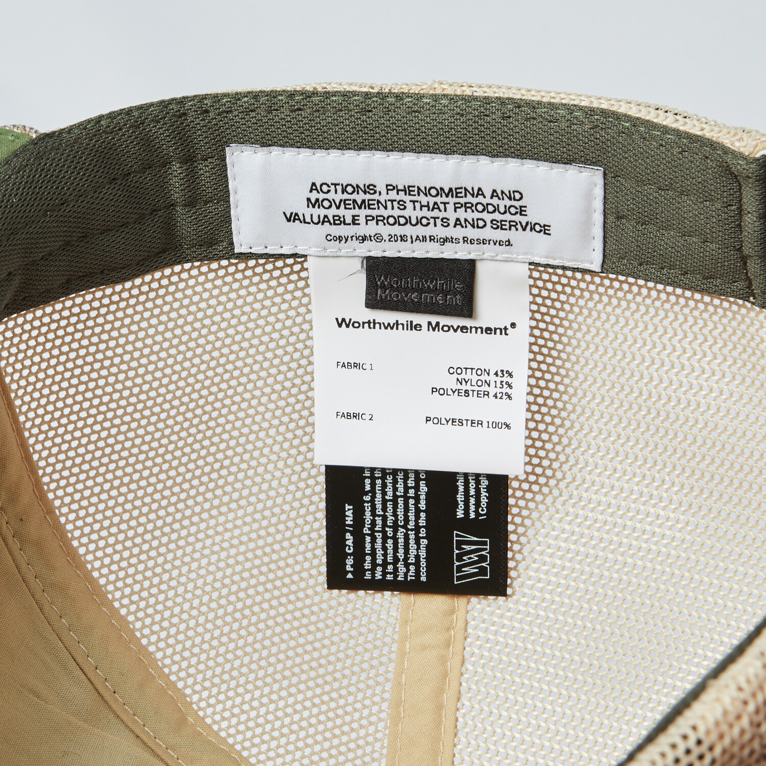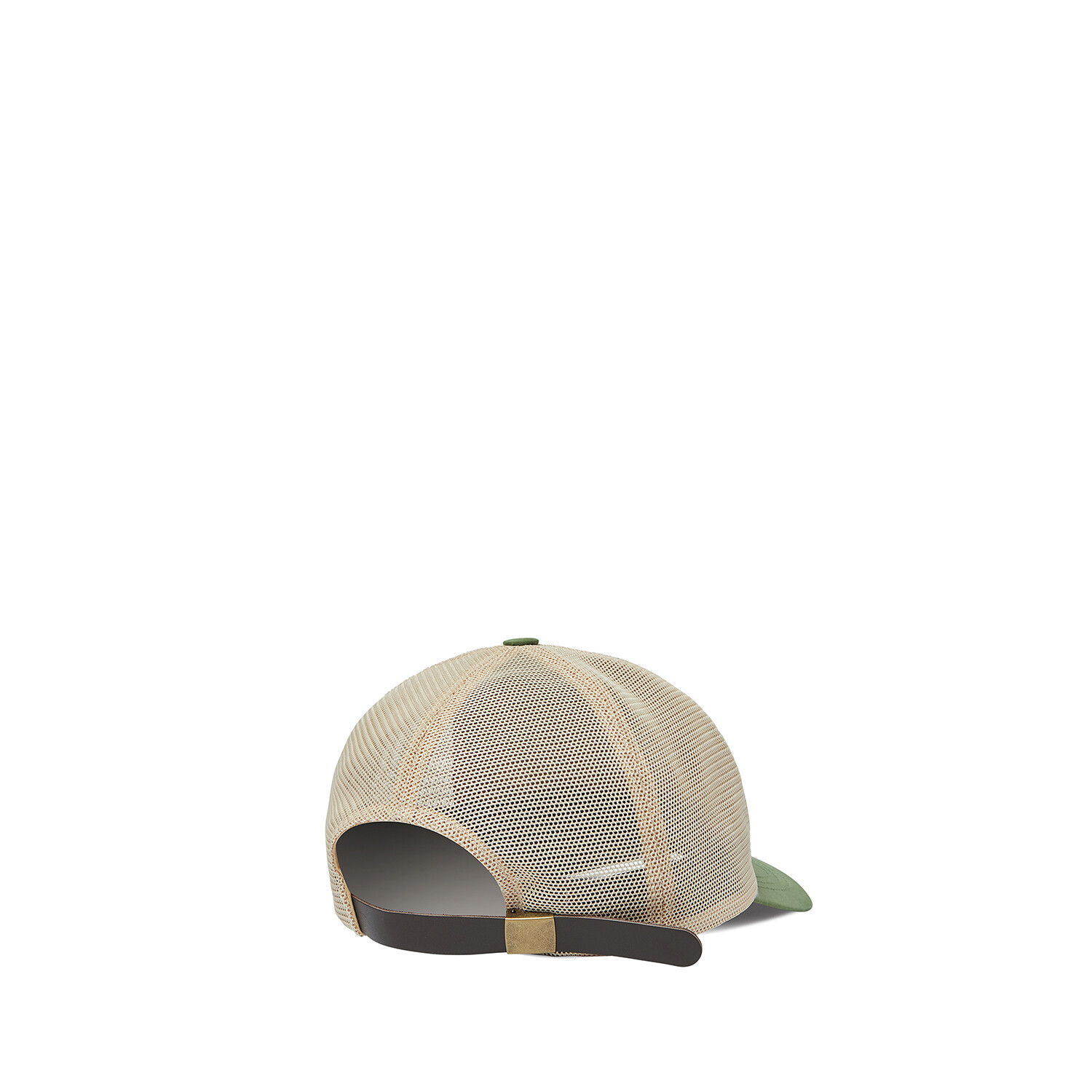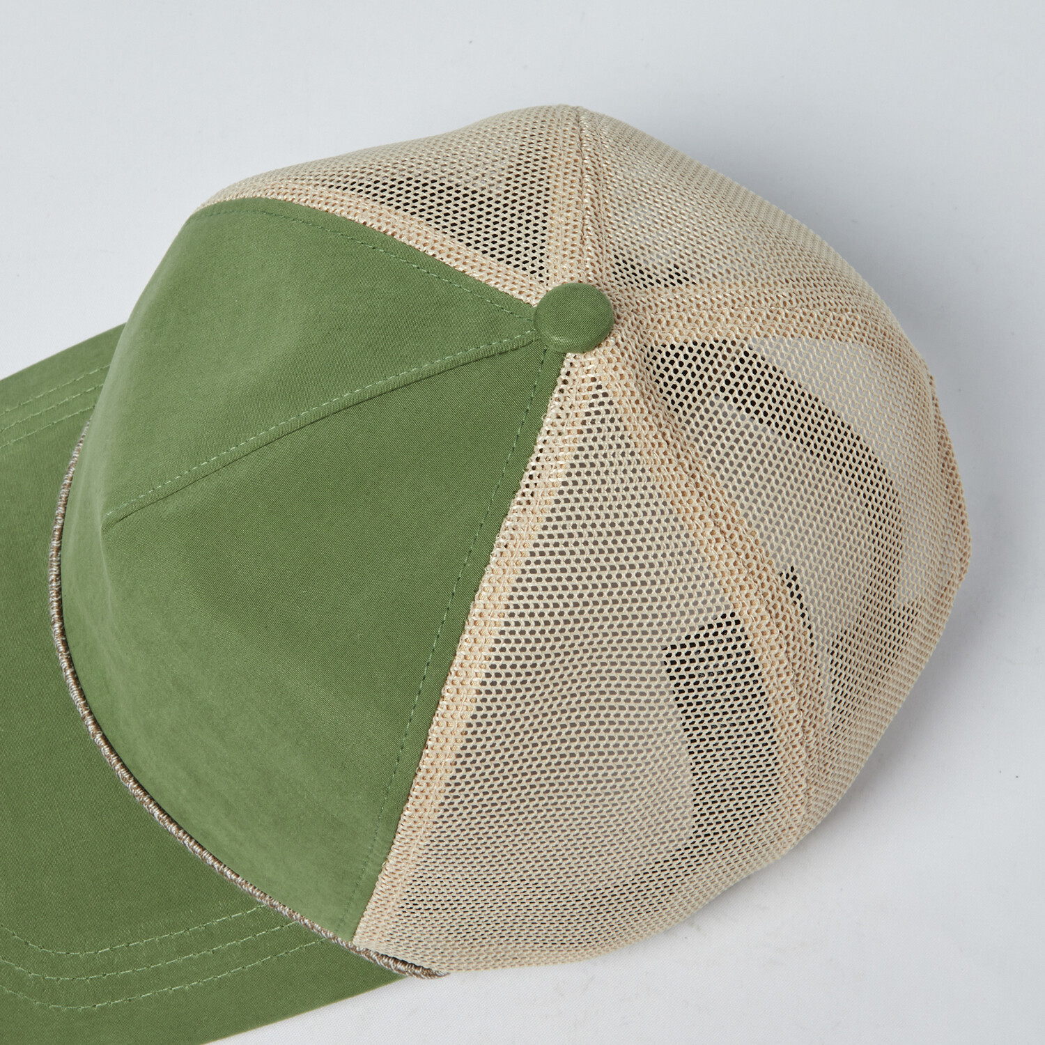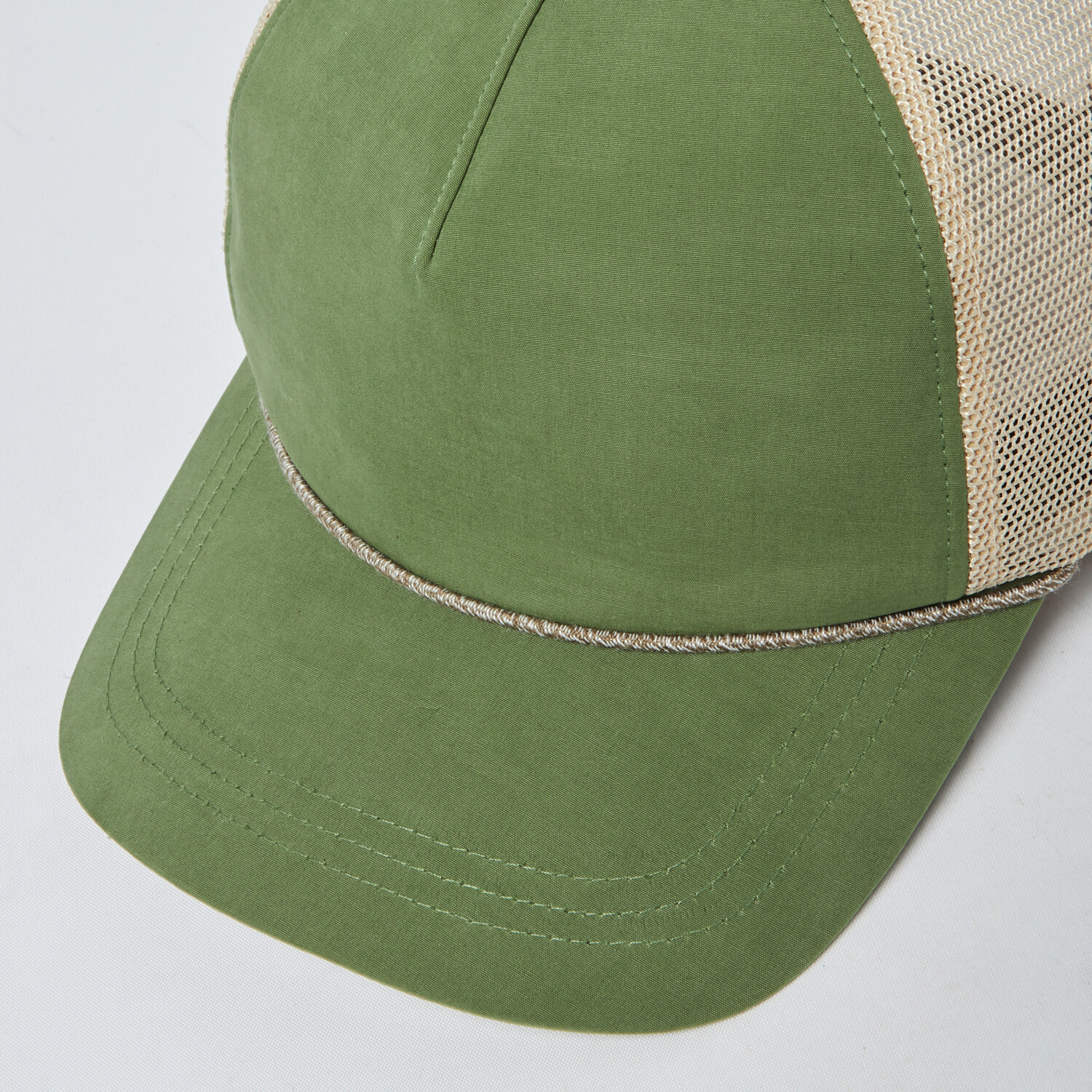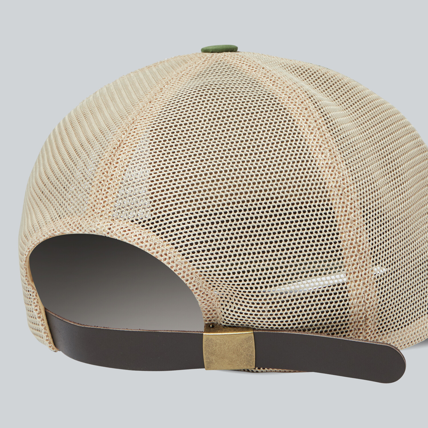 트러커 캡에서 흔하게 사용되는 두툼한 네오프렌 소재나 높은 모자의 패턴 대신 소프트한 원단을 적용하고 두상을 감싸는 형태의 제품으로 제작했습니다. 제품의 주요 포인트가 되는 챙 위의 스트링은 일본에서 수입한 멜란지 엘라스틱 스트링으로 빈티지하고 유니크한 질감과 디자인특징입니다. 헤드의 전면부는 피치 가공된 NPC교직 원단과 적절한 두께의 심지를 함께 사용하였고, 후면에는 유연한 메쉬 원단을 사용하여 전체적은 부드러운 터치감과 안정감있고 편안한 착용감을 느끼실 수 있습니다. 여유로운 길이의 리얼 레더 밴드와 흑무광(또는 황동)버클을 통해 사이즈를 조절할 수 있고, 56호~62호까지 폭넓은 사이즈를 커버합니다.