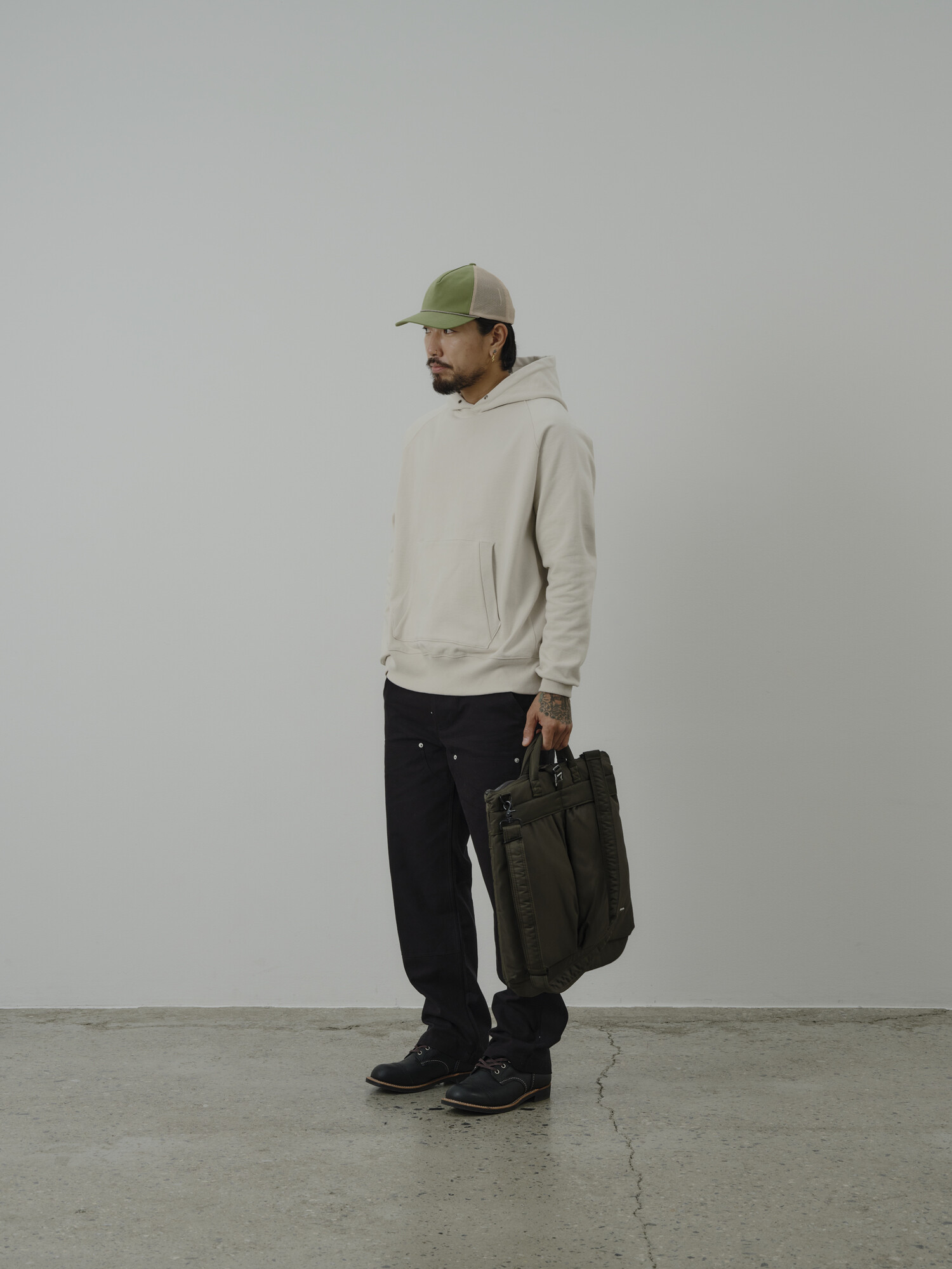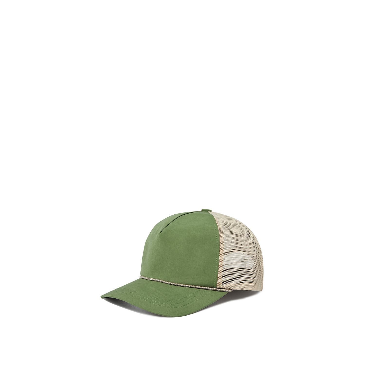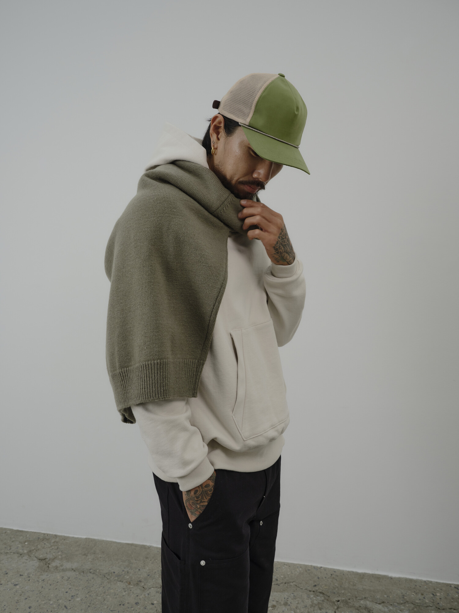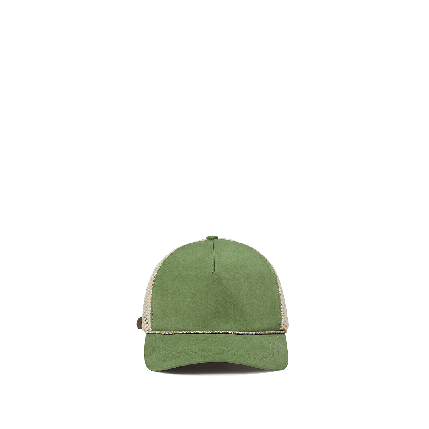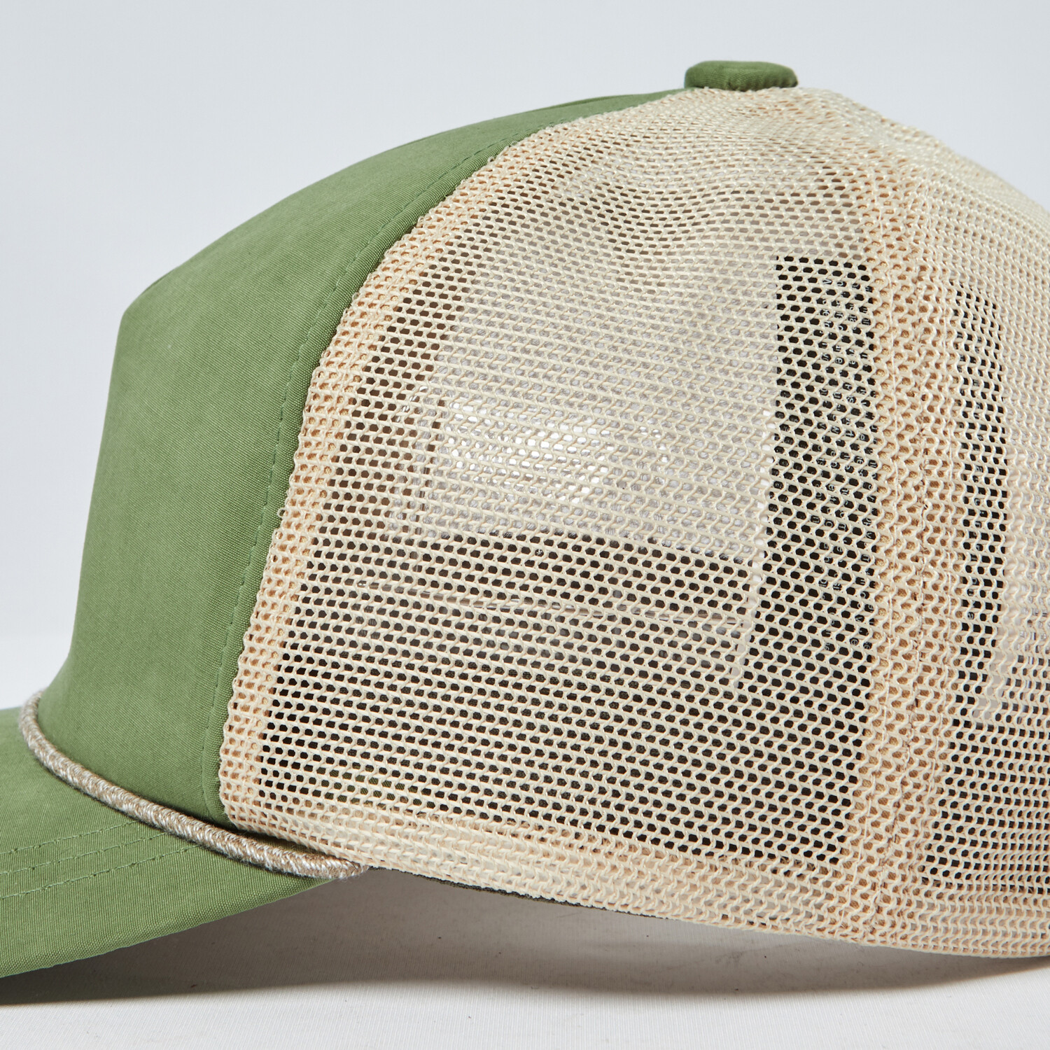 트러커 캡에서 흔하게 사용되는 두툼한 네오프렌 소재나 높은 모자의 패턴 대신 소프트한 원단을 적용하고 두상을 감싸는 형태의 제품으로 제작했습니다. 제품의 주요 포인트가 되는 챙 위의 스트링은 일본에서 수입한 멜란지 엘라스틱 스트링으로 빈티지하고 유니크한 질감과 디자인특징입니다. 헤드의 전면부는 피치 가공된 NPC교직 원단과 적절한 두께의 심지를 함께 사용하였고, 후면에는 유연한 메쉬 원단을 사용하여 전체적은 부드러운 터치감과 안정감있고 편안한 착용감을 느끼실 수 있습니다. 여유로운 길이의 리얼 레더 밴드와 흑무광(또는 황동)버클을 통해 사이즈를 조절할 수 있고, 56호~62호까지 폭넓은 사이즈를 커버합니다.