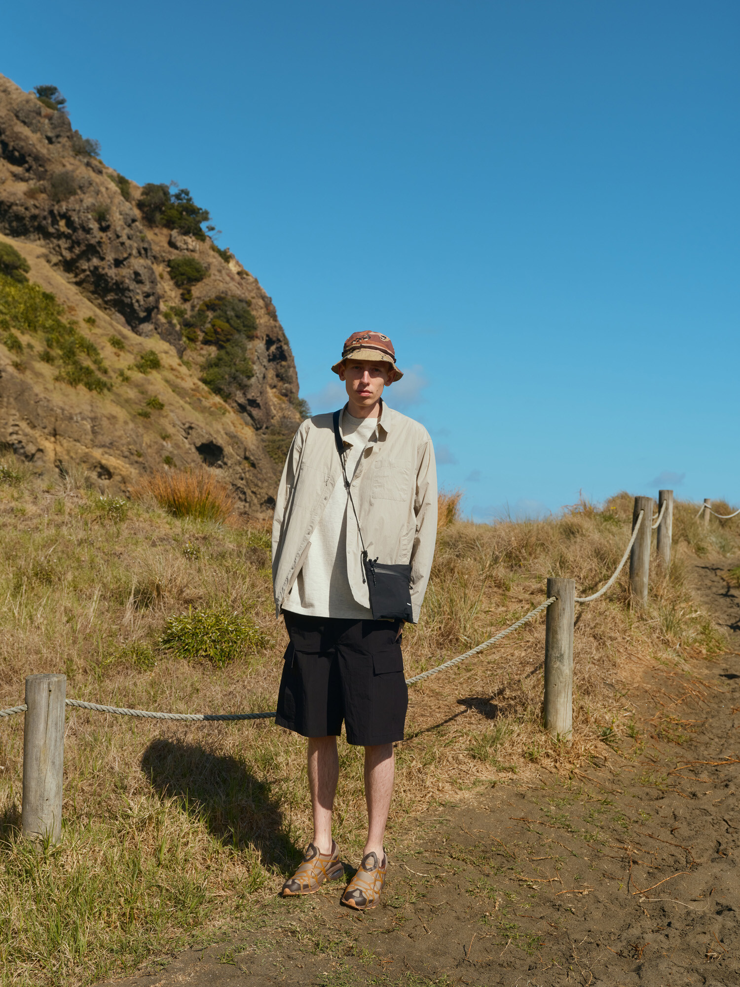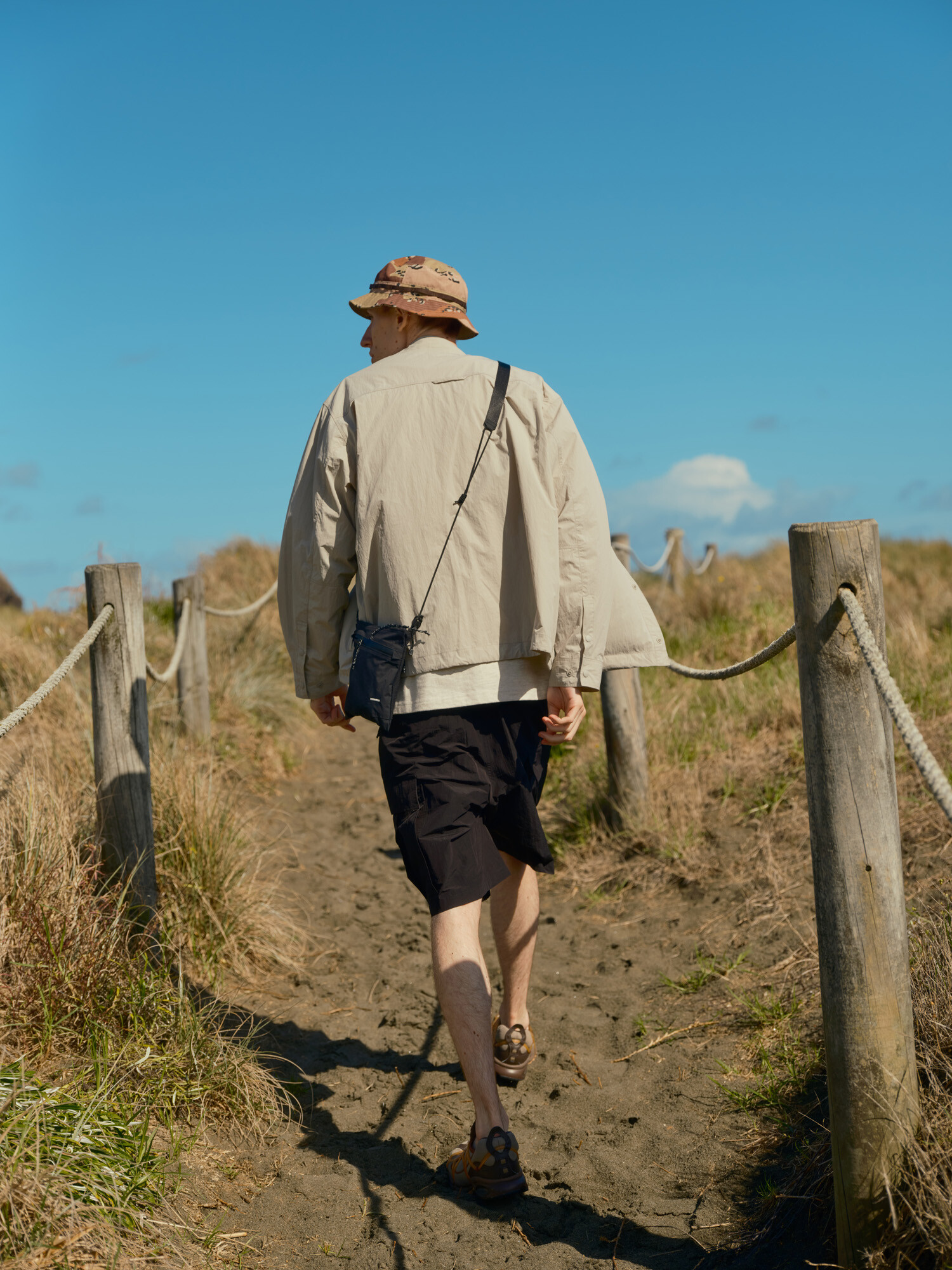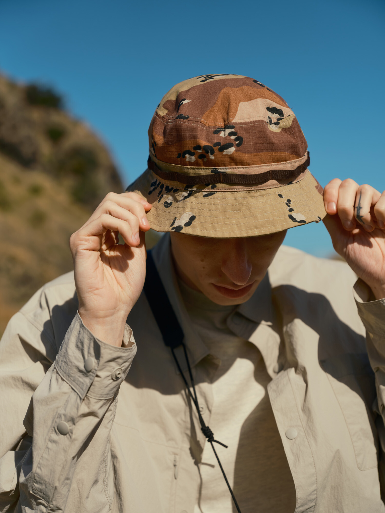 필드햇(Field Hat)은 밀리터리 정글모의 기능성과 실용성을 유지하면서도 일상에서 더욱 캐주얼하게 착용할 수 있도록 디자인된 모자입니다. 기존 정글모가 다소 투박한 인상을 주는 반면, 필드햇은 챙의 길이와 각도를 조정하고, 소재와 부자재를 세심하게 선택하여 자연스럽고 세련된 스타일로 완성되었습니다. 필드햇은 챙의 각도를 조정하여 시야를 적당히 확보할 수 있으며, 크라운의 깊이감과 높이를 조정하여 평소 57~59호 모자를 착용하는 경우 알맞게 착용할 수 있습니다. 물론 핏은 개인의 취향과 기호에 따라 다를 수 있어 더 넓은 범위의 사이즈도 착용 가능합니다. 카모플라주 패턴의 밀도 높은 C/P 립스탑 원단을 적용하여 내구성이 강하고, 내부에는 기능성 스웻 밴드를 적용하여 땀을 효과적으로 흡수하면서도 편안한 착용감을 제공합니다. 일본산 헤링본 결의 웨빙 테이프를 일정한 간격으로 바텍 봉제하여 정글모의 디테일을 위트 있게 변형했으며, 이 디테일을 통해 모자를 쉽게 걸어두거나 보관할 수 있습니다.