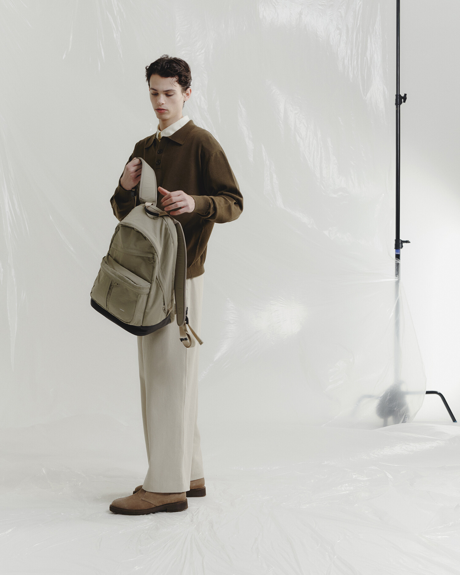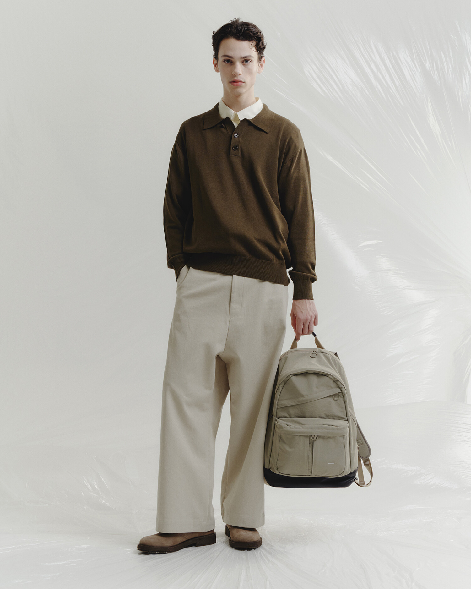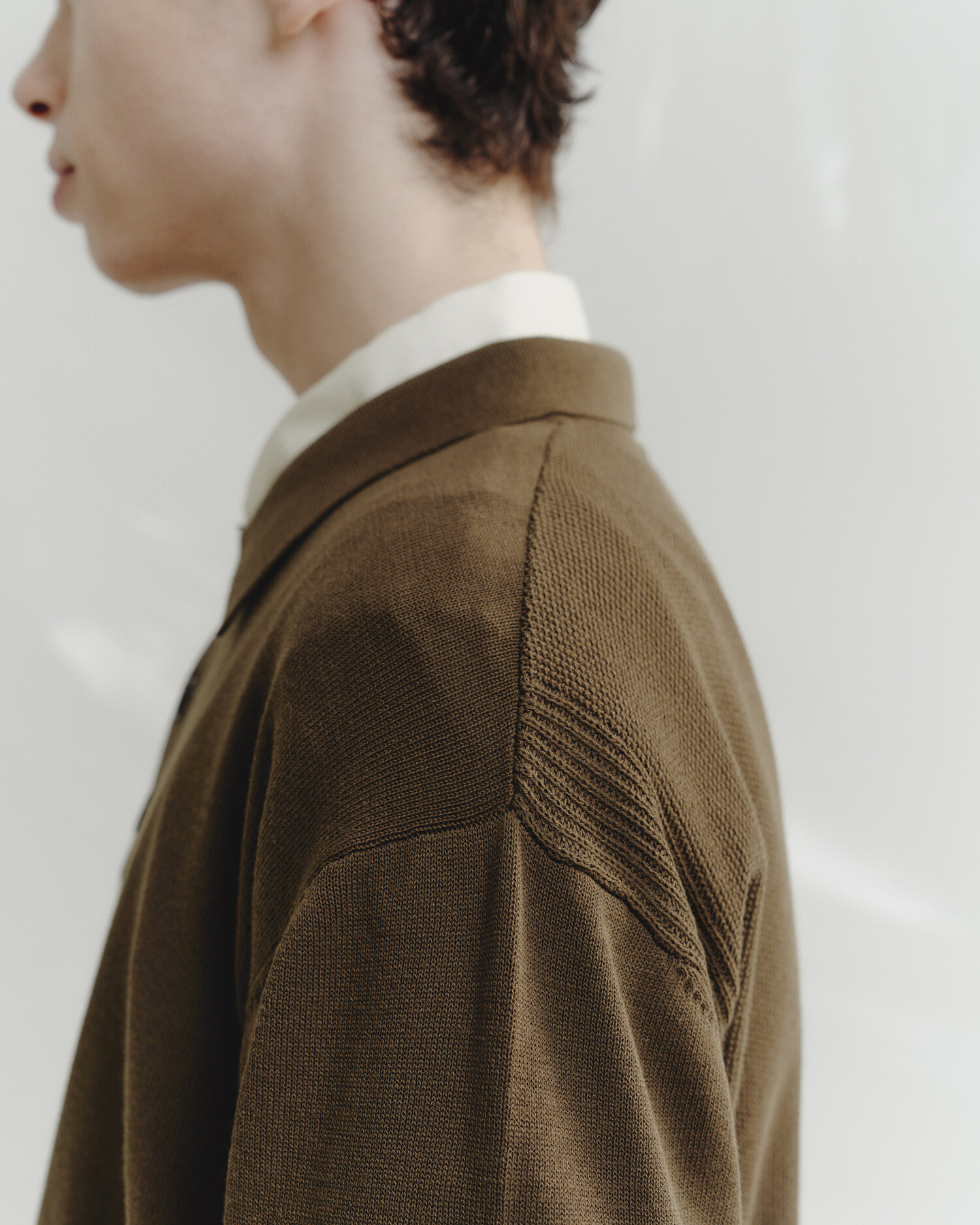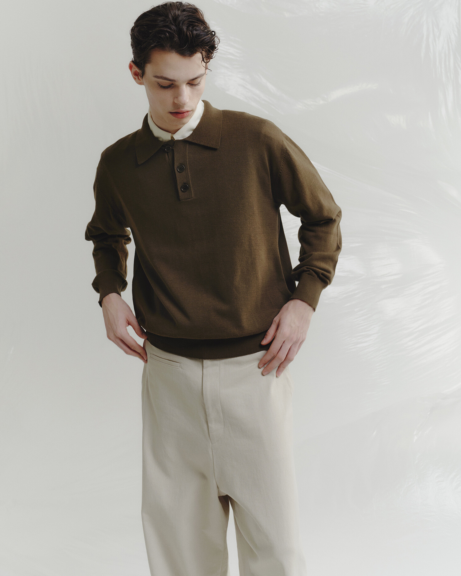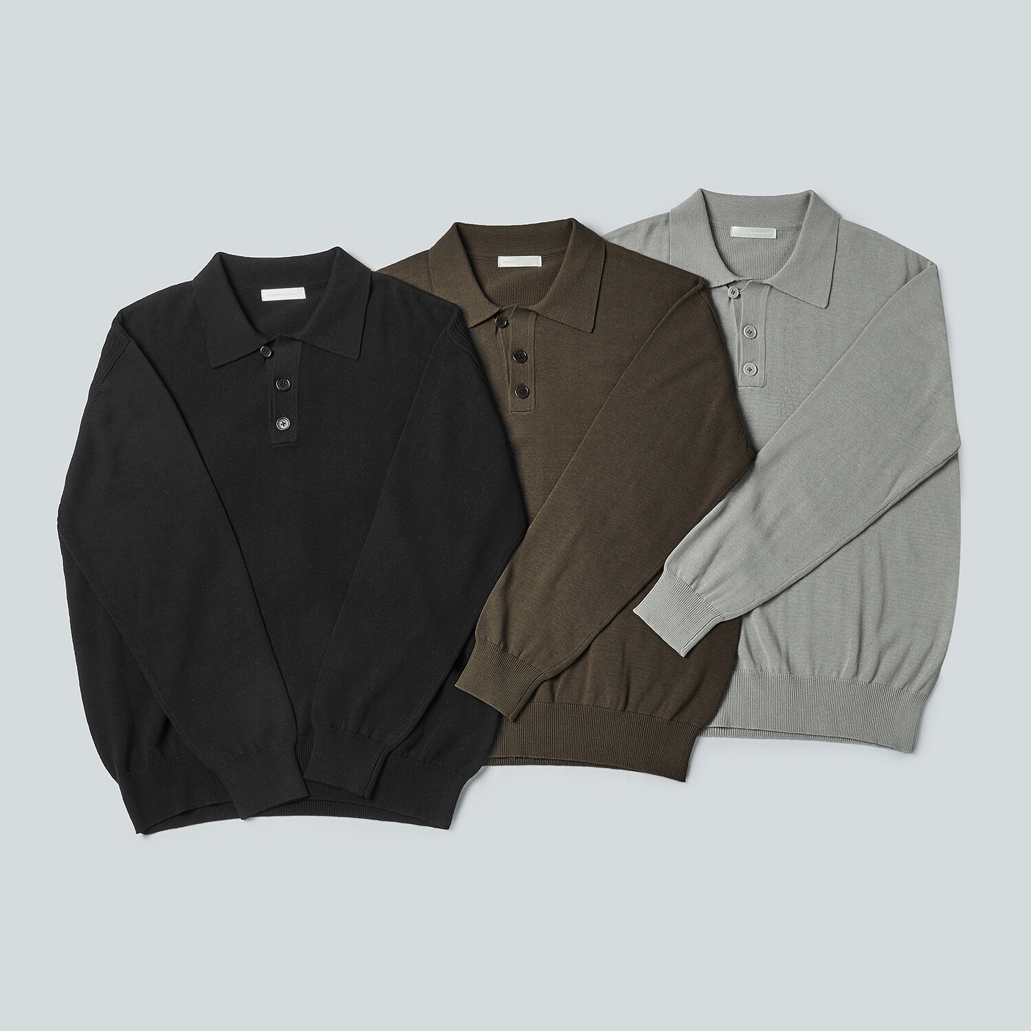 ▶ 앞, 뒤의 조직 모양이 다른 니트 폴로 셔츠. 스탠다드한 칼라 타입과 세미 오버핏의 편안한 실루엣이 구현된 제품입니다. 가장 상단의 버튼은 플라켓 위치를 벗어난 디자인적 변주를 주었고, 싱글 조직의 앞면과 양두 조직의 뒷면을 비교하는 재미가 있습니다. 뒷면의 암홀 부분에는 립 라인이 들어가서 구조적인 디자인 포인트를 더했습니다. 단품으로 활용하거나 셔츠를 이너로 레이어드 해도 좋습니다. 통기성이 좋은 소재로 한여름을 제외한 봄~가을 시즌에 착용해주시기 바랍니다.
